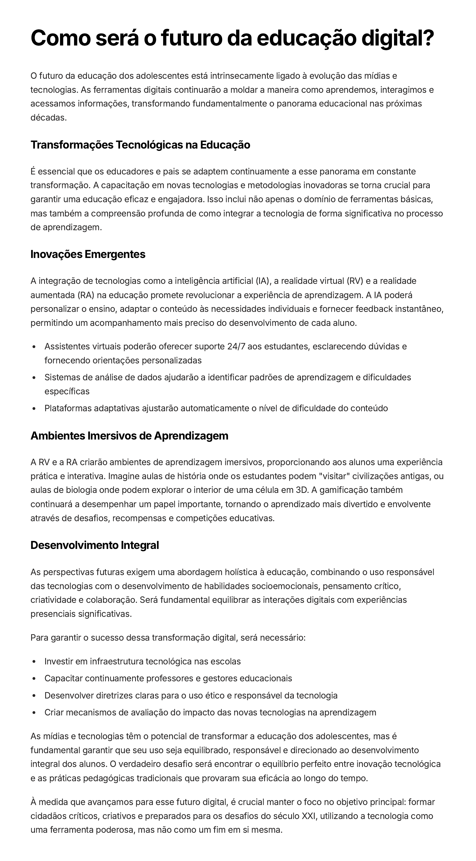 Como será o futuro da educação digital? O futuro da educação dos adolescentes está intrinsecamente ligado à evolução das mídias e tecnologias. As ferramentas digitais continuarão a moldar a maneira como aprendemos, interagimos e acessamos informações, transformando fundamentalmente o panorama educacional nas próximas décadas. Transformações Tecnológicas na Educação É essencial que os educadores e pais se adaptem continuamente a esse panorama em constante transformação. A capacitação em novas tecnologias e metodologias inovadoras se torna crucial para garantir uma educação eficaz e engajadora. Isso inclui não apenas o domínio de ferramentas básicas, mas também a compreensão profunda de como integrar a tecnologia de forma significativa no processo de aprendizagem. Inovações Emergentes A integração de tecnologias como a inteligência artificial (IA), a realidade virtual (RV) e a realidade aumentada (RA) na educação promete revolucionar a experiência de aprendizagem. A IA poderá personalizar o ensino, adaptar o conteúdo às necessidades individuais e fornecer feedback instantâneo, permitindo um acompanhamento mais preciso do desenvolvimento de cada aluno. Assistentes virtuais poderão oferecer suporte 24/7 aos estudantes, esclarecendo dúvidas e fornecendo orientações personalizadas Sistemas de análise de dados ajudarão a identificar padrões de aprendizagem e dificuldades específicas Plataformas adaptativas ajustarão automaticamente o nível de dificuldade do conteúdo Ambientes Imersivos de Aprendizagem A RV e a RA criarão ambientes de aprendizagem imersivos, proporcionando aos alunos uma experiência prática e interativa. Imagine aulas de história onde os estudantes podem "visitar" civilizações antigas, ou aulas de biologia onde podem explorar o interior de uma célula em 3D. A gamificação também continuará a desempenhar um papel importante, tornando o aprendizado mais divertido e envolvente através de desafios, recompensas e competições educativas. Desenvolvimento Integral As perspectivas futuras exigem uma abordagem holística à educação, combinando o uso responsável das tecnologias com o desenvolvimento de habilidades socioemocionais, pensamento crítico, criatividade e colaboração. Será fundamental equilibrar as interações digitais com experiências presenciais significativas. Para garantir o sucesso dessa transformação digital, será necessário: Investir em infraestrutura tecnológica nas escolas Capacitar continuamente professores e gestores educacionais Desenvolver diretrizes claras para o uso ético e responsável da tecnologia Criar mecanismos de avaliação do impacto das novas tecnologias na aprendizagem As mídias e tecnologias têm o potencial de transformar a educação dos adolescentes, mas é fundamental garantir que seu uso seja equilibrado, responsável e direcionado ao desenvolvimento integral dos alunos. O verdadeiro desafio será encontrar o equilíbrio perfeito entre inovação tecnológica e as práticas pedagógicas tradicionais que provaram sua eficácia ao longo do tempo. À medida que avançamos para esse futuro digital, é crucial manter o foco no objetivo principal: formar cidadãos críticos, criativos e preparados para os desafios do século XXI, utilizando a tecnologia como uma ferramenta poderosa, mas não como um fim em si mesma.