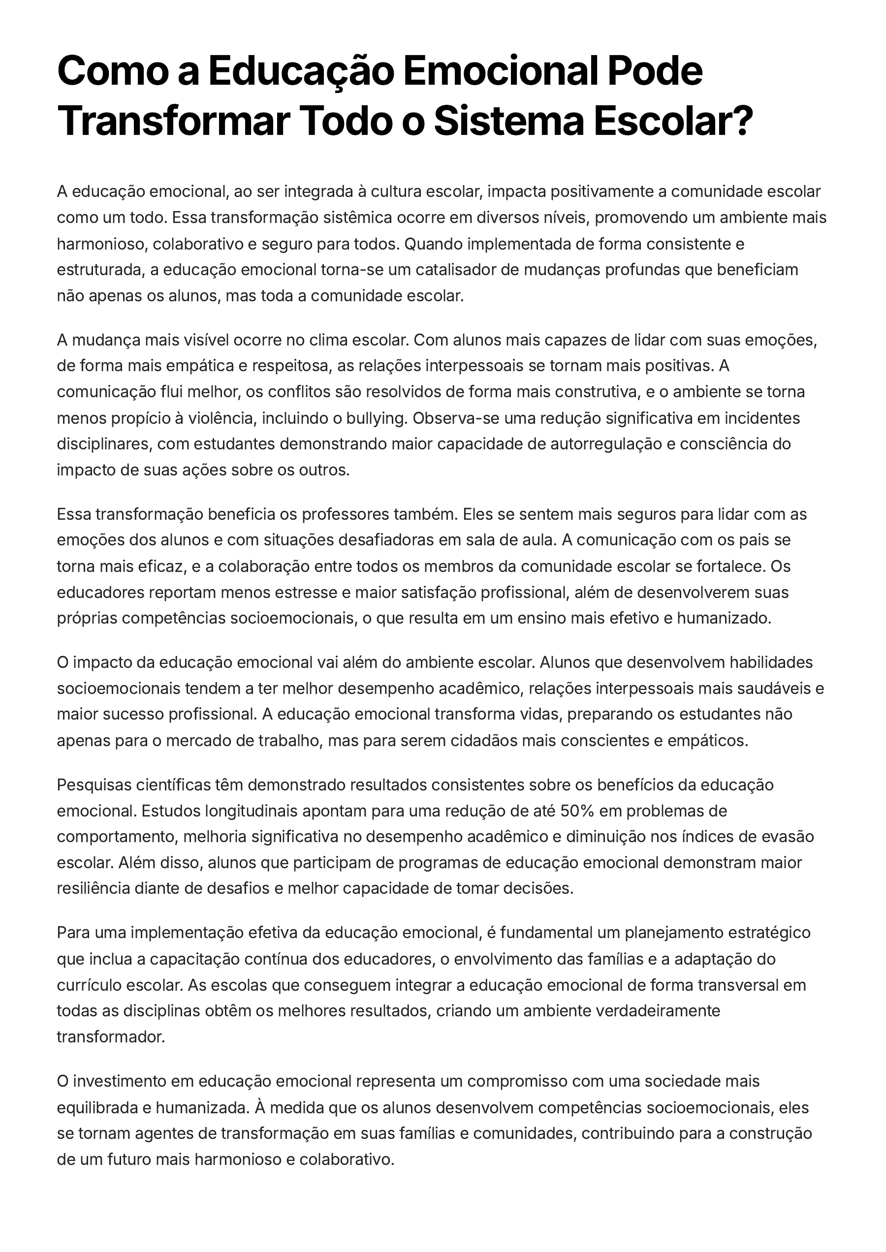 Como a Educação Emocional Pode Transformar Todo o Sistema Escolar? A educação emocional, ao ser integrada à cultura escolar, impacta positivamente a comunidade escolar como um todo. Essa transformação sistêmica ocorre em diversos níveis, promovendo um ambiente mais harmonioso, colaborativo e seguro para todos. Quando implementada de forma consistente e estruturada, a educação emocional torna-se um catalisador de mudanças profundas que beneficiam não apenas os alunos, mas toda a comunidade escolar. A mudança mais visível ocorre no clima escolar. Com alunos mais capazes de lidar com suas emoções, de forma mais empática e respeitosa, as relações interpessoais se tornam mais positivas. A comunicação flui melhor, os conflitos são resolvidos de forma mais construtiva, e o ambiente se torna menos propício à violência, incluindo o bullying. Observa-se uma redução significativa em incidentes disciplinares, com estudantes demonstrando maior capacidade de autorregulação e consciência do impacto de suas ações sobre os outros. Essa transformação beneficia os professores também. Eles se sentem mais seguros para lidar com as emoções dos alunos e com situações desafiadoras em sala de aula. A comunicação com os pais se torna mais eficaz, e a colaboração entre todos os membros da comunidade escolar se fortalece. Os educadores reportam menos estresse e maior satisfação profissional, além de desenvolverem suas próprias competências socioemocionais, o que resulta em um ensino mais efetivo e humanizado. O impacto da educação emocional vai além do ambiente escolar. Alunos que desenvolvem habilidades socioemocionais tendem a ter melhor desempenho acadêmico, relações interpessoais mais saudáveis e maior sucesso profissional. A educação emocional transforma vidas, preparando os estudantes não apenas para o mercado de trabalho, mas para serem cidadãos mais conscientes e empáticos. Pesquisas científicas têm demonstrado resultados consistentes sobre os benefícios da educação emocional. Estudos longitudinais apontam para uma redução de até 50% em problemas de comportamento, melhoria significativa no desempenho acadêmico e diminuição nos índices de evasão escolar. Além disso, alunos que participam de programas de educação emocional demonstram maior resiliência diante de desafios e melhor capacidade de tomar decisões. Para uma implementação efetiva da educação emocional, é fundamental um planejamento estratégico que inclua a capacitação contínua dos educadores, o envolvimento das famílias e a adaptação do currículo escolar. As escolas que conseguem integrar a educação emocional de forma transversal em todas as disciplinas obtêm os melhores resultados, criando um ambiente verdadeiramente transformador. O investimento em educação emocional representa um compromisso com uma sociedade mais equilibrada e humanizada. À medida que os alunos desenvolvem competências socioemocionais, eles se tornam agentes de transformação em suas famílias e comunidades, contribuindo para a construção de um futuro mais harmonioso e colaborativo.