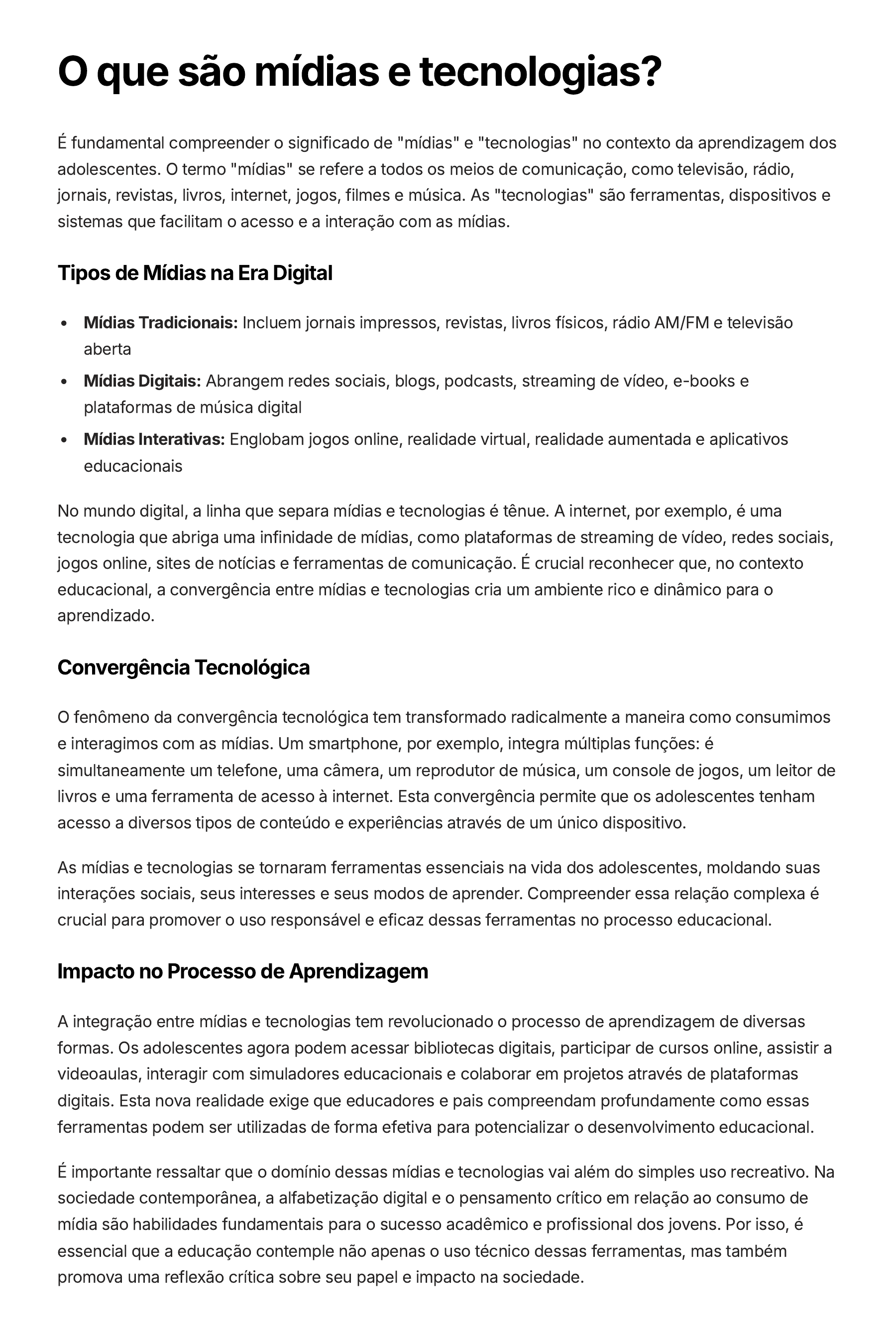 O que são mídias e tecnologias? É fundamental compreender o significado de "mídias" e "tecnologias" no contexto da aprendizagem dos adolescentes. O termo "mídias" se refere a todos os meios de comunicação, como televisão, rádio, jornais, revistas, livros, internet, jogos, filmes e música. As "tecnologias" são ferramentas, dispositivos e sistemas que facilitam o acesso e a interação com as mídias. Tipos de Mídias na Era Digital Mídias Tradicionais: Incluem jornais impressos, revistas, livros físicos, rádio AM/FM e televisão aberta Mídias Digitais: Abrangem redes sociais, blogs, podcasts, streaming de vídeo, e-books e plataformas de música digital Mídias Interativas: Englobam jogos online, realidade virtual, realidade aumentada e aplicativos educacionais No mundo digital, a linha que separa mídias e tecnologias é tênue. A internet, por exemplo, é uma tecnologia que abriga uma infinidade de mídias, como plataformas de streaming de vídeo, redes sociais, jogos online, sites de notícias e ferramentas de comunicação. É crucial reconhecer que, no contexto educacional, a convergência entre mídias e tecnologias cria um ambiente rico e dinâmico para o aprendizado. Convergência Tecnológica O fenômeno da convergência tecnológica tem transformado radicalmente a maneira como consumimos e interagimos com as mídias. Um smartphone, por exemplo, integra múltiplas funções: é simultaneamente um telefone, uma câmera, um reprodutor de música, um console de jogos, um leitor de livros e uma ferramenta de acesso à internet. Esta convergência permite que os adolescentes tenham acesso a diversos tipos de conteúdo e experiências através de um único dispositivo. As mídias e tecnologias se tornaram ferramentas essenciais na vida dos adolescentes, moldando suas interações sociais, seus interesses e seus modos de aprender. Compreender essa relação complexa é crucial para promover o uso responsável e eficaz dessas ferramentas no processo educacional. Impacto no Processo de Aprendizagem A integração entre mídias e tecnologias tem revolucionado o processo de aprendizagem de diversas formas. Os adolescentes agora podem acessar bibliotecas digitais, participar de cursos online, assistir a videoaulas, interagir com simuladores educacionais e colaborar em projetos através de plataformas digitais. Esta nova realidade exige que educadores e pais compreendam profundamente como essas ferramentas podem ser utilizadas de forma efetiva para potencializar o desenvolvimento educacional. É importante ressaltar que o domínio dessas mídias e tecnologias vai além do simples uso recreativo. Na sociedade contemporânea, a alfabetização digital e o pensamento crítico em relação ao consumo de mídia são habilidades fundamentais para o sucesso acadêmico e profissional dos jovens. Por isso, é essencial que a educação contemple não apenas o uso técnico dessas ferramentas, mas também promova uma reflexão crítica sobre seu papel e impacto na sociedade.