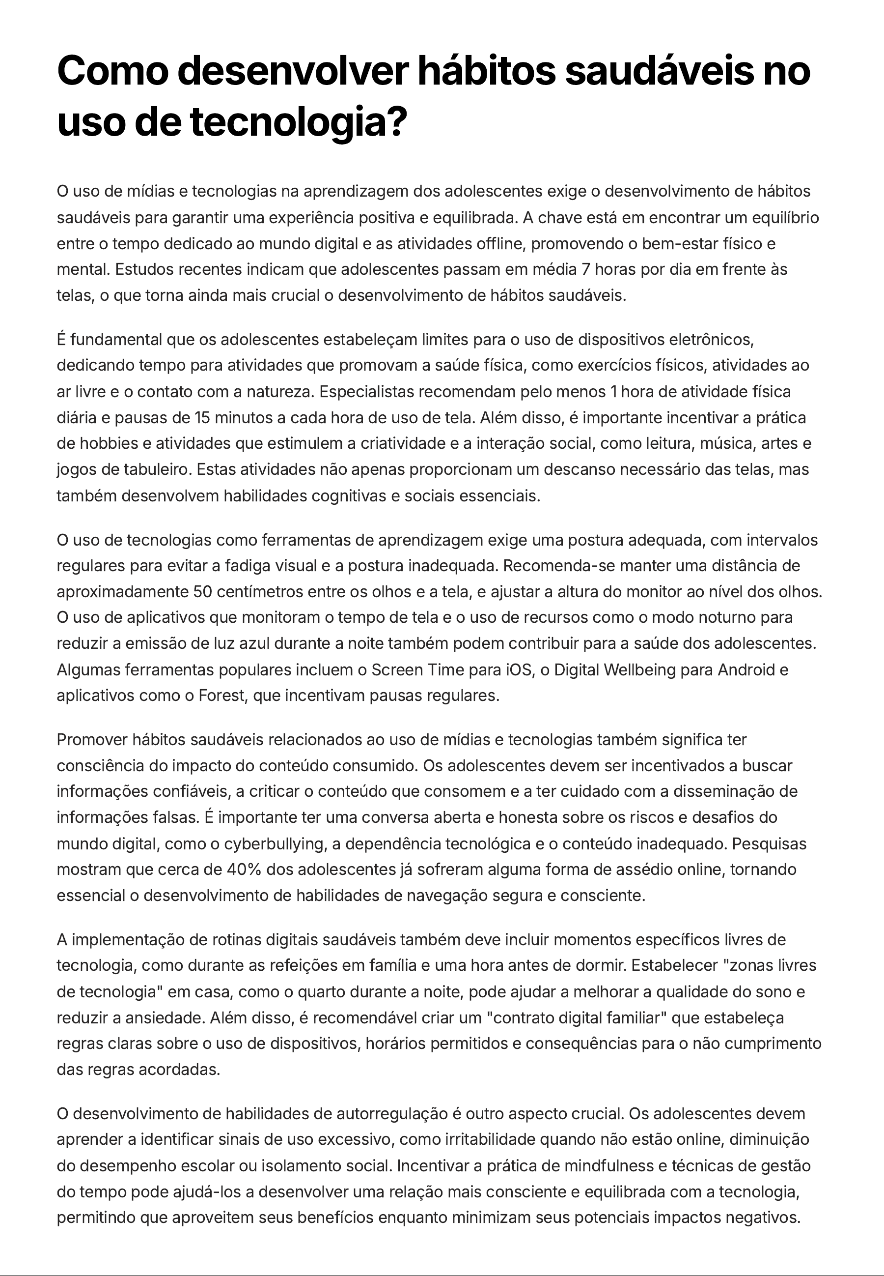 Como desenvolver hábitos saudáveis no uso de tecnologia? O uso de mídias e tecnologias na aprendizagem dos adolescentes exige o desenvolvimento de hábitos saudáveis para garantir uma experiência positiva e equilibrada. A chave está em encontrar um equilíbrio entre o tempo dedicado ao mundo digital e as atividades offline, promovendo o bem-estar físico e mental. Estudos recentes indicam que adolescentes passam em média 7 horas por dia em frente às telas, o que torna ainda mais crucial o desenvolvimento de hábitos saudáveis. É fundamental que os adolescentes estabeleçam limites para o uso de dispositivos eletrônicos, dedicando tempo para atividades que promovam a saúde física, como exercícios físicos, atividades ao ar livre e o contato com a natureza. Especialistas recomendam pelo menos 1 hora de atividade física diária e pausas de 15 minutos a cada hora de uso de tela. Além disso, é importante incentivar a prática de hobbies e atividades que estimulem a criatividade e a interação social, como leitura, música, artes e jogos de tabuleiro. Estas atividades não apenas proporcionam um descanso necessário das telas, mas também desenvolvem habilidades cognitivas e sociais essenciais. O uso de tecnologias como ferramentas de aprendizagem exige uma postura adequada, com intervalos regulares para evitar a fadiga visual e a postura inadequada. Recomenda-se manter uma distância de aproximadamente 50 centímetros entre os olhos e a tela, e ajustar a altura do monitor ao nível dos olhos. O uso de aplicativos que monitoram o tempo de tela e o uso de recursos como o modo noturno para reduzir a emissão de luz azul durante a noite também podem contribuir para a saúde dos adolescentes. Algumas ferramentas populares incluem o Screen Time para iOS, o Digital Wellbeing para Android e aplicativos como o Forest, que incentivam pausas regulares. Promover hábitos saudáveis relacionados ao uso de mídias e tecnologias também significa ter consciência do impacto do conteúdo consumido. Os adolescentes devem ser incentivados a buscar informações confiáveis, a criticar o conteúdo que consomem e a ter cuidado com a disseminação de informações falsas. É importante ter uma conversa aberta e honesta sobre os riscos e desafios do mundo digital, como o cyberbullying, a dependência tecnológica e o conteúdo inadequado. Pesquisas mostram que cerca de 40% dos adolescentes já sofreram alguma forma de assédio online, tornando essencial o desenvolvimento de habilidades de navegação segura e consciente. A implementação de rotinas digitais saudáveis também deve incluir momentos específicos livres de tecnologia, como durante as refeições em família e uma hora antes de dormir. Estabelecer "zonas livres de tecnologia" em casa, como o quarto durante a noite, pode ajudar a melhorar a qualidade do sono e reduzir a ansiedade. Além disso, é recomendável criar um "contrato digital familiar" que estabeleça regras claras sobre o uso de dispositivos, horários permitidos e consequências para o não cumprimento das regras acordadas. O desenvolvimento de habilidades de autorregulação é outro aspecto crucial. Os adolescentes devem aprender a identificar sinais de uso excessivo, como irritabilidade quando não estão online, diminuição do desempenho escolar ou isolamento social. Incentivar a prática de mindfulness e técnicas de gestão do tempo pode ajudá-los a desenvolver uma relação mais consciente e equilibrada com a tecnologia, permitindo que aproveitem seus benefícios enquanto minimizam seus potenciais impactos negativos.