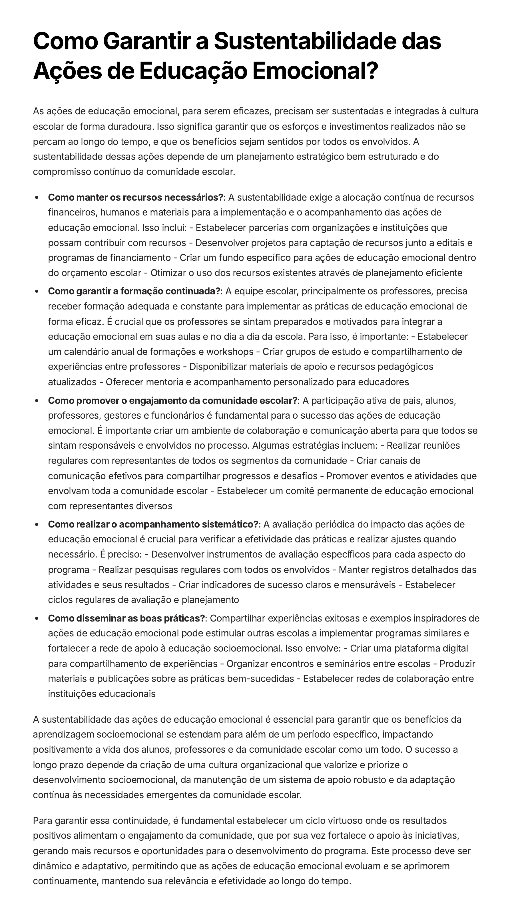 Como Garantir a Sustentabilidade das Ações de Educação Emocional? As ações de educação emocional, para serem eficazes, precisam ser sustentadas e integradas à cultura escolar de forma duradoura. Isso significa garantir que os esforços e investimentos realizados não se percam ao longo do tempo, e que os benefícios sejam sentidos por todos os envolvidos. A sustentabilidade dessas ações depende de um planejamento estratégico bem estruturado e do compromisso contínuo da comunidade escolar. Como manter os recursos necessários?: A sustentabilidade exige a alocação contínua de recursos financeiros, humanos e materiais para a implementação e o acompanhamento das ações de educação emocional. Isso inclui: - Estabelecer parcerias com organizações e instituições que possam contribuir com recursos - Desenvolver projetos para captação de recursos junto a editais e programas de financiamento - Criar um fundo específico para ações de educação emocional dentro do orçamento escolar - Otimizar o uso dos recursos existentes através de planejamento eficiente Como garantir a formação continuada?: A equipe escolar, principalmente os professores, precisa receber formação adequada e constante para implementar as práticas de educação emocional de forma eficaz. É crucial que os professores se sintam preparados e motivados para integrar a educação emocional em suas aulas e no dia a dia da escola. Para isso, é importante: - Estabelecer um calendário anual de formações e workshops - Criar grupos de estudo e compartilhamento de experiências entre professores - Disponibilizar materiais de apoio e recursos pedagógicos atualizados - Oferecer mentoria e acompanhamento personalizado para educadores Como promover o engajamento da comunidade escolar?: A participação ativa de pais, alunos, professores, gestores e funcionários é fundamental para o sucesso das ações de educação emocional. É importante criar um ambiente de colaboração e comunicação aberta para que todos se sintam responsáveis e envolvidos no processo. Algumas estratégias incluem: - Realizar reuniões regulares com representantes de todos os segmentos da comunidade - Criar canais de comunicação efetivos para compartilhar progressos e desafios - Promover eventos e atividades que envolvam toda a comunidade escolar - Estabelecer um comitê permanente de educação emocional com representantes diversos Como realizar o acompanhamento sistemático?: A avaliação periódica do impacto das ações de educação emocional é crucial para verificar a efetividade das práticas e realizar ajustes quando necessário. É preciso: - Desenvolver instrumentos de avaliação específicos para cada aspecto do programa - Realizar pesquisas regulares com todos os envolvidos - Manter registros detalhados das atividades e seus resultados - Criar indicadores de sucesso claros e mensuráveis - Estabelecer ciclos regulares de avaliação e planejamento Como disseminar as boas práticas?: Compartilhar experiências exitosas e exemplos inspiradores de ações de educação emocional pode estimular outras escolas a implementar programas similares e fortalecer a rede de apoio à educação socioemocional. Isso envolve: - Criar uma plataforma digital para compartilhamento de experiências - Organizar encontros e seminários entre escolas - Produzir materiais e publicações sobre as práticas bem-sucedidas - Estabelecer redes de colaboração entre instituições educacionais A sustentabilidade das ações de educação emocional é essencial para garantir que os benefícios da aprendizagem socioemocional se estendam para além de um período específico, impactando positivamente a vida dos alunos, professores e da comunidade escolar como um todo. O sucesso a longo prazo depende da criação de uma cultura organizacional que valorize e priorize o desenvolvimento socioemocional, da manutenção de um sistema de apoio robusto e da adaptação contínua às necessidades emergentes da comunidade escolar. Para garantir essa continuidade, é fundamental estabelecer um ciclo virtuoso onde os resultados positivos alimentam o engajamento da comunidade, que por sua vez fortalece o apoio às iniciativas, gerando mais recursos e oportunidades para o desenvolvimento do programa. Este processo deve ser dinâmico e adaptativo, permitindo que as ações de educação emocional evoluam e se aprimorem continuamente, mantendo sua relevância e efetividade ao longo do tempo.