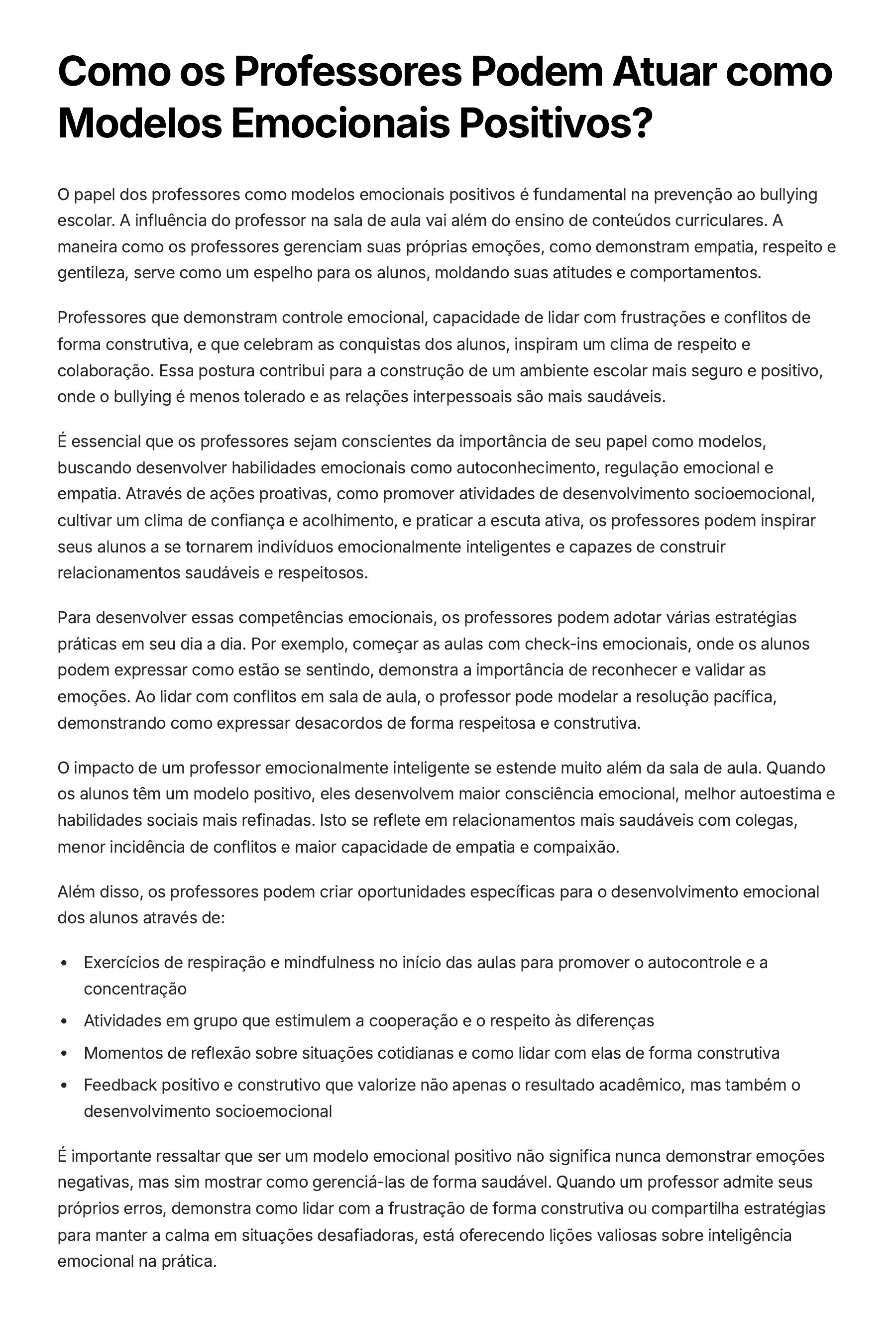 Como os Professores Podem Atuar como Modelos Emocionais Positivos? O papel dos professores como modelos emocionais positivos é fundamental na prevenção ao bullying escolar. A influência do professor na sala de aula vai além do ensino de conteúdos curriculares. A maneira como os professores gerenciam suas próprias emoções, como demonstram empatia, respeito e gentileza, serve como um espelho para os alunos, moldando suas atitudes e comportamentos. Professores que demonstram controle emocional, capacidade de lidar com frustrações e conflitos de forma construtiva, e que celebram as conquistas dos alunos, inspiram um clima de respeito e colaboração. Essa postura contribui para a construção de um ambiente escolar mais seguro e positivo, onde o bullying é menos tolerado e as relações interpessoais são mais saudáveis. É essencial que os professores sejam conscientes da importância de seu papel como modelos, buscando desenvolver habilidades emocionais como autoconhecimento, regulação emocional e empatia. Através de ações proativas, como promover atividades de desenvolvimento socioemocional, cultivar um clima de confiança e acolhimento, e praticar a escuta ativa, os professores podem inspirar seus alunos a se tornarem indivíduos emocionalmente inteligentes e capazes de construir relacionamentos saudáveis e respeitosos. Para desenvolver essas competências emocionais, os professores podem adotar várias estratégias práticas em seu dia a dia. Por exemplo, começar as aulas com check-ins emocionais, onde os alunos podem expressar como estão se sentindo, demonstra a importância de reconhecer e validar as emoções. Ao lidar com conflitos em sala de aula, o professor pode modelar a resolução pacífica, demonstrando como expressar desacordos de forma respeitosa e construtiva. O impacto de um professor emocionalmente inteligente se estende muito além da sala de aula. Quando os alunos têm um modelo positivo, eles desenvolvem maior consciência emocional, melhor autoestima e habilidades sociais mais refinadas. Isto se reflete em relacionamentos mais saudáveis com colegas, menor incidência de conflitos e maior capacidade de empatia e compaixão. Além disso, os professores podem criar oportunidades específicas para o desenvolvimento emocional dos alunos através de: Exercícios de respiração e mindfulness no início das aulas para promover o autocontrole e a concentração Atividades em grupo que estimulem a cooperação e o respeito às diferenças Momentos de reflexão sobre situações cotidianas e como lidar com elas de forma construtiva Feedback positivo e construtivo que valorize não apenas o resultado acadêmico, mas também o desenvolvimento socioemocional É importante ressaltar que ser um modelo emocional positivo não significa nunca demonstrar emoções negativas, mas sim mostrar como gerenciá-las de forma saudável. Quando um professor admite seus próprios erros, demonstra como lidar com a frustração de forma construtiva ou compartilha estratégias para manter a calma em situações desafiadoras, está oferecendo lições valiosas sobre inteligência emocional na prática.