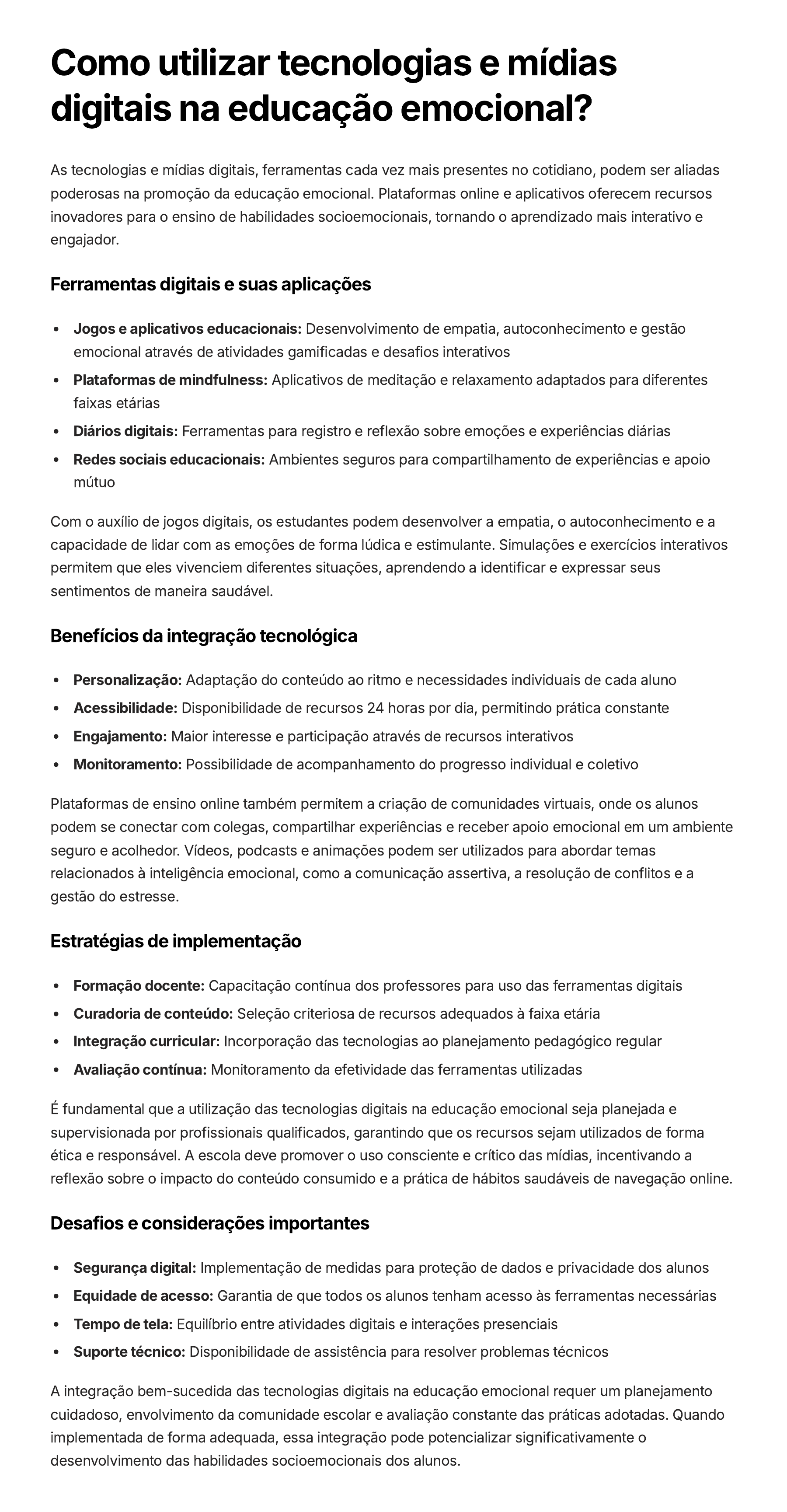 Como utilizar tecnologias e mídias digitais na educação emocional? As tecnologias e mídias digitais, ferramentas cada vez mais presentes no cotidiano, podem ser aliadas poderosas na promoção da educação emocional. Plataformas online e aplicativos oferecem recursos inovadores para o ensino de habilidades socioemocionais, tornando o aprendizado mais interativo e engajador. Ferramentas digitais e suas aplicações Jogos e aplicativos educacionais: Desenvolvimento de empatia, autoconhecimento e gestão emocional através de atividades gamificadas e desafios interativos Plataformas de mindfulness: Aplicativos de meditação e relaxamento adaptados para diferentes faixas etárias Diários digitais: Ferramentas para registro e reflexão sobre emoções e experiências diárias Redes sociais educacionais: Ambientes seguros para compartilhamento de experiências e apoio mútuo Com o auxílio de jogos digitais, os estudantes podem desenvolver a empatia, o autoconhecimento e a capacidade de lidar com as emoções de forma lúdica e estimulante. Simulações e exercícios interativos permitem que eles vivenciem diferentes situações, aprendendo a identificar e expressar seus sentimentos de maneira saudável. Benefícios da integração tecnológica Personalização: Adaptação do conteúdo ao ritmo e necessidades individuais de cada aluno Acessibilidade: Disponibilidade de recursos 24 horas por dia, permitindo prática constante Engajamento: Maior interesse e participação através de recursos interativos Monitoramento: Possibilidade de acompanhamento do progresso individual e coletivo Plataformas de ensino online também permitem a criação de comunidades virtuais, onde os alunos podem se conectar com colegas, compartilhar experiências e receber apoio emocional em um ambiente seguro e acolhedor. Vídeos, podcasts e animações podem ser utilizados para abordar temas relacionados à inteligência emocional, como a comunicação assertiva, a resolução de conflitos e a gestão do estresse. Estratégias de implementação Formação docente: Capacitação contínua dos professores para uso das ferramentas digitais Curadoria de conteúdo: Seleção criteriosa de recursos adequados à faixa etária Integração curricular: Incorporação das tecnologias ao planejamento pedagógico regular Avaliação contínua: Monitoramento da efetividade das ferramentas utilizadas É fundamental que a utilização das tecnologias digitais na educação emocional seja planejada e supervisionada por profissionais qualificados, garantindo que os recursos sejam utilizados de forma ética e responsável. A escola deve promover o uso consciente e crítico das mídias, incentivando a reflexão sobre o impacto do conteúdo consumido e a prática de hábitos saudáveis de navegação online. Desafios e considerações importantes Segurança digital: Implementação de medidas para proteção de dados e privacidade dos alunos Equidade de acesso: Garantia de que todos os alunos tenham acesso às ferramentas necessárias Tempo de tela: Equilíbrio entre atividades digitais e interações presenciais Suporte técnico: Disponibilidade de assistência para resolver problemas técnicos A integração bem-sucedida das tecnologias digitais na educação emocional requer um planejamento cuidadoso, envolvimento da comunidade escolar e avaliação constante das práticas adotadas. Quando implementada de forma adequada, essa integração pode potencializar significativamente o desenvolvimento das habilidades socioemocionais dos alunos.