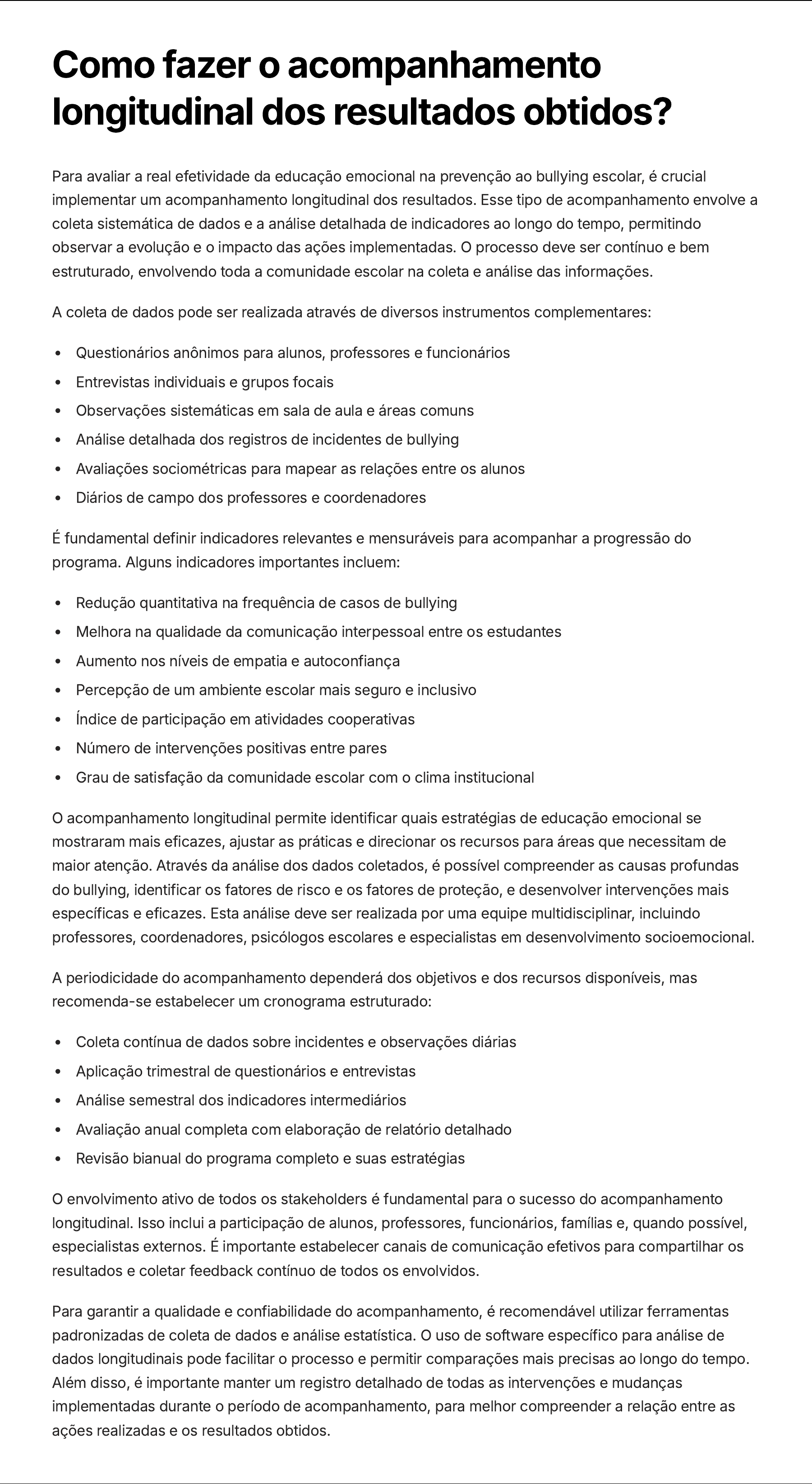 Como fazer o acompanhamento longitudinal dos resultados obtidos? Para avaliar a real efetividade da educação emocional na prevenção ao bullying escolar, é crucial implementar um acompanhamento longitudinal dos resultados. Esse tipo de acompanhamento envolve a coleta sistemática de dados e a análise detalhada de indicadores ao longo do tempo, permitindo observar a evolução e o impacto das ações implementadas. O processo deve ser contínuo e bem estruturado, envolvendo toda a comunidade escolar na coleta e análise das informações. A coleta de dados pode ser realizada através de diversos instrumentos complementares: Questionários anônimos para alunos, professores e funcionários Entrevistas individuais e grupos focais Observações sistemáticas em sala de aula e áreas comuns Análise detalhada dos registros de incidentes de bullying Avaliações sociométricas para mapear as relações entre os alunos Diários de campo dos professores e coordenadores É fundamental definir indicadores relevantes e mensuráveis para acompanhar a progressão do programa. Alguns indicadores importantes incluem: Redução quantitativa na frequência de casos de bullying Melhora na qualidade da comunicação interpessoal entre os estudantes Aumento nos níveis de empatia e autoconfiança Percepção de um ambiente escolar mais seguro e inclusivo Índice de participação em atividades cooperativas Número de intervenções positivas entre pares Grau de satisfação da comunidade escolar com o clima institucional O acompanhamento longitudinal permite identificar quais estratégias de educação emocional se mostraram mais eficazes, ajustar as práticas e direcionar os recursos para áreas que necessitam de maior atenção. Através da análise dos dados coletados, é possível compreender as causas profundas do bullying, identificar os fatores de risco e os fatores de proteção, e desenvolver intervenções mais específicas e eficazes. Esta análise deve ser realizada por uma equipe multidisciplinar, incluindo professores, coordenadores, psicólogos escolares e especialistas em desenvolvimento socioemocional. A periodicidade do acompanhamento dependerá dos objetivos e dos recursos disponíveis, mas recomenda-se estabelecer um cronograma estruturado: Coleta contínua de dados sobre incidentes e observações diárias Aplicação trimestral de questionários e entrevistas Análise semestral dos indicadores intermediários Avaliação anual completa com elaboração de relatório detalhado Revisão bianual do programa completo e suas estratégias O envolvimento ativo de todos os stakeholders é fundamental para o sucesso do acompanhamento longitudinal. Isso inclui a participação de alunos, professores, funcionários, famílias e, quando possível, especialistas externos. É importante estabelecer canais de comunicação efetivos para compartilhar os resultados e coletar feedback contínuo de todos os envolvidos. Para garantir a qualidade e confiabilidade do acompanhamento, é recomendável utilizar ferramentas padronizadas de coleta de dados e análise estatística. O uso de software específico para análise de dados longitudinais pode facilitar o processo e permitir comparações mais precisas ao longo do tempo. Além disso, é importante manter um registro detalhado de todas as intervenções e mudanças implementadas durante o período de acompanhamento, para melhor compreender a relação entre as ações realizadas e os resultados obtidos.