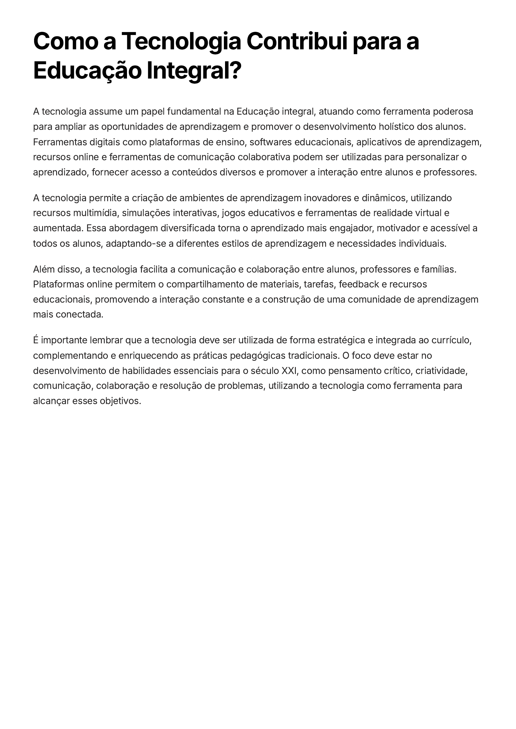 Como a Tecnologia Contribui para a Educação Integral? A tecnologia assume um papel fundamental na Educação integral, atuando como ferramenta poderosa para ampliar as oportunidades de aprendizagem e promover o desenvolvimento holístico dos alunos. Ferramentas digitais como plataformas de ensino, softwares educacionais, aplicativos de aprendizagem, recursos online e ferramentas de comunicação colaborativa podem ser utilizadas para personalizar o aprendizado, fornecer acesso a conteúdos diversos e promover a interação entre alunos e professores. A tecnologia permite a criação de ambientes de aprendizagem inovadores e dinâmicos, utilizando recursos multimídia, simulações interativas, jogos educativos e ferramentas de realidade virtual e aumentada. Essa abordagem diversificada torna o aprendizado mais engajador, motivador e acessível a todos os alunos, adaptando-se a diferentes estilos de aprendizagem e necessidades individuais. Além disso, a tecnologia facilita a comunicação e colaboração entre alunos, professores e famílias. Plataformas online permitem o compartilhamento de materiais, tarefas, feedback e recursos educacionais, promovendo a interação constante e a construção de uma comunidade de aprendizagem mais conectada. É importante lembrar que a tecnologia deve ser utilizada de forma estratégica e integrada ao currículo, complementando e enriquecendo as práticas pedagógicas tradicionais. O foco deve estar no desenvolvimento de habilidades essenciais para o século XXI, como pensamento crítico, criatividade, comunicação, colaboração e resolução de problemas, utilizando a tecnologia como ferramenta para alcançar esses objetivos. Como a Educação integral contribui para o desenvolvimento da criatividade? A Educação integral, ao promover um ambiente de aprendizagem rico e estimulante, é fundamental para o desenvolvimento da criatividade dos alunos. Ao oferecer oportunidades para que os alunos explorem seus talentos, pensem de forma crítica e criem soluções inovadoras, a Educação integral incentiva a imaginação e a capacidade de pensar fora da caixa. Experiências práticas e interdisciplinares: A Educação integral valoriza a experimentação e a interação entre diferentes áreas do conhecimento, proporcionando aos alunos a oportunidade de vivenciar ideias e conceitos de forma prática, estimulando a criatividade e a resolução de problemas. Projetos desafiadores e autônomos: Projetos desafiadores, que exigem que os alunos busquem soluções e trabalhem em equipe, desenvolvem a capacidade de pensar de forma original e encontrar soluções criativas para os desafios propostos. Incentivo à pesquisa e ao questionamento: A Educação integral incentiva a curiosidade e a busca por conhecimento, estimulando os alunos a questionar o mundo ao redor, a buscar novas informações e a desenvolver ideias próprias, o que contribui para o desenvolvimento da criatividade. Espaço para a expressão artística e cultural: A Educação integral reconhece a importância da arte e da cultura no desenvolvimento da criatividade, oferecendo aos alunos oportunidades de se expressar através da música, da dança, do teatro, da literatura e de outras formas de expressão artística. Em suma, a Educação integral proporciona um ambiente propício à criatividade, com atividades que estimulam o pensamento crítico, a resolução de problemas, a experimentação e a expressão artística, preparando os alunos para o futuro, onde a criatividade se torna cada vez mais importante para o sucesso profissional e pessoal. Estratégias de Envolvimento da Comunidade na Educação Integral Como promover encontros efetivos com a comunidade? Promover reuniões regulares com pais, responsáveis, membros da comunidade e instituições locais para discutir o desenvolvimento da escola e a implementação da Educação integral. Qual o papel da tecnologia na comunicação escolar? Criar plataformas online para facilitar a comunicação e o acesso à informação, como plataformas de aprendizagem, fóruns de discussão, e plataformas de gerenciamento de tarefas. Como estabelecer parcerias com a comunidade? Desenvolver projetos em conjunto com entidades da comunidade, como ONGs, empresas e universidades, que tragam benefícios para a escola e para a sociedade. Como engajar voluntários no ambiente escolar? Incentivar o voluntariado na escola, permitindo que membros da comunidade contribuam com seu tempo e habilidades em diferentes áreas, como apoio pedagógico, atividades extracurriculares e projetos sociais. A participação da comunidade é fundamental para o sucesso da Educação integral. A escola precisa ser um espaço aberto à comunidade, onde todos se sintam acolhidos e engajados no processo de aprendizagem. O envolvimento da comunidade enriquece o ambiente escolar, contribuindo para a construção de um currículo mais relevante e eficaz. Além das estratégias mencionadas, a escola pode implementar outras iniciativas, como: Oficinas e palestras com especialistas da comunidade Visitas guiadas às instalações da escola para membros da comunidade Eventos culturais e esportivos abertos à comunidade Criação de um conselho escolar com representantes da comunidade O objetivo é criar um ambiente de colaboração e diálogo entre a escola e a comunidade, promovendo a participação ativa de todos os envolvidos no processo educacional. Como a Educação integral promove a cidadania e a participação social? A Educação integral desempenha um papel fundamental na formação de cidadãos conscientes, críticos e engajados na sociedade. Ao promover o desenvolvimento holístico do aluno, abrangendo aspectos cognitivos, socioemocionais, físicos e culturais, ela equipa os estudantes com as ferramentas necessárias para exercerem seus direitos e responsabilidades como membros ativos da comunidade. A Educação integral incentiva a participação social por meio de diversas es