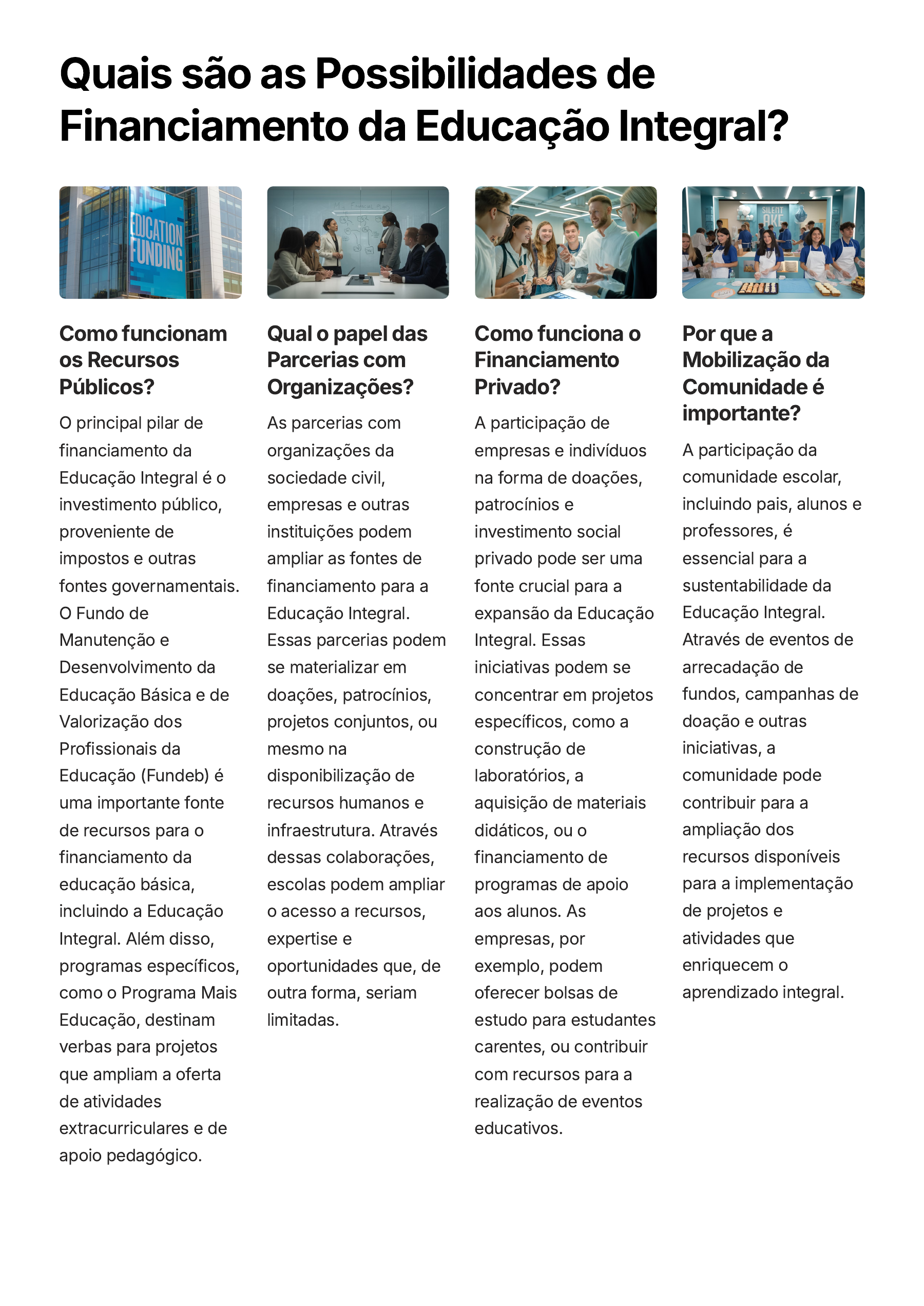 Quais são as Possibilidades de Financiamento da Educação Integral? Como funcionam os Recursos Públicos? O principal pilar de financiamento da Educação Integral é o investimento público, proveniente de impostos e outras fontes governamentais. O Fundo de Manutenção e Desenvolvimento da Educação Básica e de Valorização dos Profissionais da Educação (Fundeb) é uma importante fonte de recursos para o financiamento da educação básica, incluindo a Educação Integral. Além disso, programas específicos, como o Programa Mais Educação, destinam verbas para projetos que ampliam a oferta de atividades extracurriculares e de apoio pedagógico. Qual o papel das Parcerias com Organizações? As parcerias com organizações da sociedade civil, empresas e outras instituições podem ampliar as fontes de financiamento para a Educação Integral. Essas parcerias podem se materializar em doações, patrocínios, projetos conjuntos, ou mesmo na disponibilização de recursos humanos e infraestrutura. Através dessas colaborações, escolas podem ampliar o acesso a recursos, expertise e oportunidades que, de outra forma, seriam limitadas. Como funciona o Financiamento Privado? A participação de empresas e indivíduos na forma de doações, patrocínios e investimento social privado pode ser uma fonte crucial para a expansão da Educação Integral. Essas iniciativas podem se concentrar em projetos específicos, como a construção de laboratórios, a aquisição de materiais didáticos, ou o financiamento de programas de apoio aos alunos. As empresas, por exemplo, podem oferecer bolsas de estudo para estudantes carentes, ou contribuir com recursos para a realização de eventos educativos. Por que a Mobilização da Comunidade é importante? A participação da comunidade escolar, incluindo pais, alunos e professores, é essencial para a sustentabilidade da Educação Integral. Através de eventos de arrecadação de fundos, campanhas de doação e outras iniciativas, a comunidade pode contribuir para a ampliação dos recursos disponíveis para a implementação de projetos e atividades que enriquecem o aprendizado integral. Como Avaliar e Monitorar a Educação Integral? A avaliação e o monitoramento da Educação Integral representam um desafio crucial para garantir a efetividade dessa abordagem educacional. A complexidade da Educação Integral, que abrange múltiplas dimensões do desenvolvimento do aluno, exige instrumentos e metodologias específicos para medir o impacto das ações e identificar áreas de aprimoramento. 1 Como considerar a formação integral na avaliação? A avaliação precisa considerar a formação integral do aluno, englobando aspectos cognitivos, socioemocionais, culturais, artísticos, físicos e éticos. A simples mensuração do desempenho acadêmico não é suficiente para avaliar o sucesso da Educação Integral. 2 Quais indicadores e instrumentos são mais adequados? É necessário desenvolver indicadores e instrumentos de avaliação que reflitam a complexidade da Educação Integral, incluindo questionários, observações, portfólios, autoavaliações e projetos interdisciplinares. A escolha dos instrumentos deve ser adequada às diferentes faixas etárias e contextos. 3 Como realizar a coleta e análise de dados de forma eficiente? A coleta e análise de dados precisam ser sistematizadas para gerar informações relevantes sobre o desenvolvimento dos alunos, a qualidade das atividades e o impacto da Educação Integral. O uso de ferramentas tecnológicas pode auxiliar nesse processo, facilitando a organização e a interpretação dos dados. 4 Como garantir a participação de todos no processo avaliativo? A avaliação da Educação Integral deve ser um processo colaborativo, envolvendo professores, alunos, famílias, comunidade e gestores. A participação de todos os atores enriquece a análise e garante a pertinência das informações coletadas. Superar os desafios de avaliação e monitoramento da Educação Integral exige investimento em formação de professores, desenvolvimento de metodologias inovadoras e uso de tecnologias adequadas. A avaliação precisa ser um instrumento para a melhoria contínua do processo educativo, garantindo que a Educação Integral atenda às necessidades dos alunos e promova a formação integral de cidadãos críticos, reflexivos e engajados. Como a Educação Integral se Relaciona com a EJA? A Educação Integral e a Educação de Jovens e Adultos (EJA) se interligam em diversos aspectos, buscando oferecer uma experiência educacional completa e significativa para os alunos. A EJA, por sua natureza, já aborda a integralidade ao considerar as experiências de vida, as necessidades e as expectativas dos alunos que retomam os estudos em idade adulta. No entanto, a Educação Integral pode enriquecer ainda mais esse processo, oferecendo ferramentas para a formação integral do indivíduo. Abordagem Contextualizada: A Educação Integral na EJA pode promover um currículo que se conecte às realidades e necessidades dos alunos, considerando seus contextos socioculturais e profissionais. Desenvolvimento de Competências Socioemocionais: A EJA, com a base da Educação Integral, pode fortalecer as habilidades socioemocionais dos alunos, como a capacidade de lidar com desafios, trabalhar em equipe, comunicar-se de forma eficaz e solucionar problemas. Formação Cidadã: As práticas da Educação Integral incentivam a participação dos alunos na comunidade, promovendo a cidadania, o senso crítico e a responsabilidade social, essenciais para o desenvolvimento de indivíduos engajados e transformadores. Aprendizagem Significativa: A Educação Integral na EJA pode integrar diferentes áreas do conhecimento, proporcionando uma experiência de aprendizagem mais rica e significativa, conectando os conteúdos com a vida prática dos alunos. É essencial que a Educação Integral na EJA seja adaptada às cara