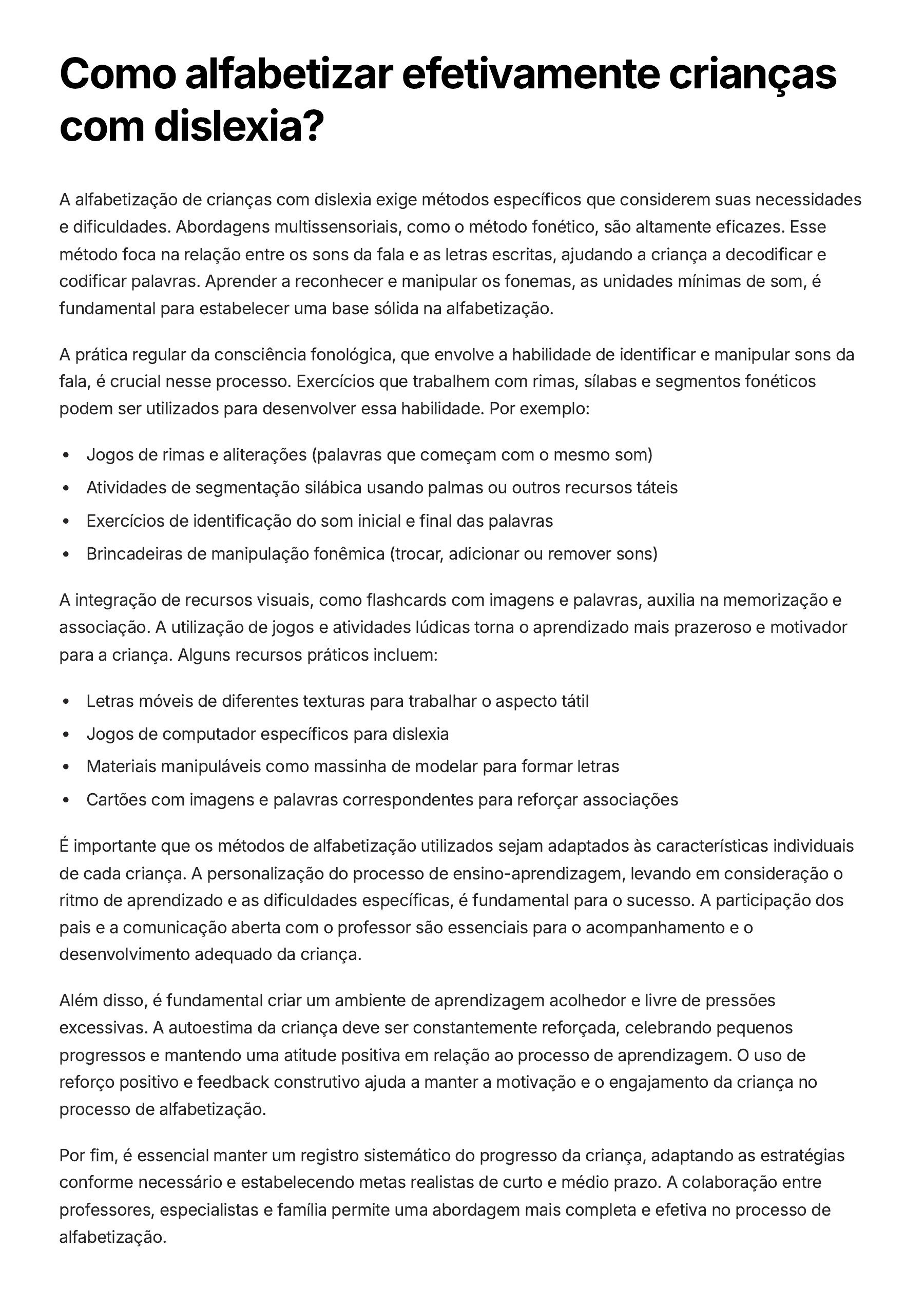 Como alfabetizar efetivamente crianças com dislexia? A alfabetização de crianças com dislexia exige métodos específicos que considerem suas necessidades e dificuldades. Abordagens multissensoriais, como o método fonético, são altamente eficazes. Esse método foca na relação entre os sons da fala e as letras escritas, ajudando a criança a decodificar e codificar palavras. Aprender a reconhecer e manipular os fonemas, as unidades mínimas de som, é fundamental para estabelecer uma base sólida na alfabetização. A prática regular da consciência fonológica, que envolve a habilidade de identificar e manipular sons da fala, é crucial nesse processo. Exercícios que trabalhem com rimas, sílabas e segmentos fonéticos podem ser utilizados para desenvolver essa habilidade. Por exemplo: Jogos de rimas e aliterações (palavras que começam com o mesmo som) Atividades de segmentação silábica usando palmas ou outros recursos táteis Exercícios de identificação do som inicial e final das palavras Brincadeiras de manipulação fonêmica (trocar, adicionar ou remover sons) A integração de recursos visuais, como flashcards com imagens e palavras, auxilia na memorização e associação. A utilização de jogos e atividades lúdicas torna o aprendizado mais prazeroso e motivador para a criança. Alguns recursos práticos incluem: Letras móveis de diferentes texturas para trabalhar o aspecto tátil Jogos de computador específicos para dislexia Materiais manipuláveis como massinha de modelar para formar letras Cartões com imagens e palavras correspondentes para reforçar associações É importante que os métodos de alfabetização utilizados sejam adaptados às características individuais de cada criança. A personalização do processo de ensino-aprendizagem, levando em consideração o ritmo de aprendizado e as dificuldades específicas, é fundamental para o sucesso. A participação dos pais e a comunicação aberta com o professor são essenciais para o acompanhamento e o desenvolvimento adequado da criança. Além disso, é fundamental criar um ambiente de aprendizagem acolhedor e livre de pressões excessivas. A autoestima da criança deve ser constantemente reforçada, celebrando pequenos progressos e mantendo uma atitude positiva em relação ao processo de aprendizagem. O uso de reforço positivo e feedback construtivo ajuda a manter a motivação e o engajamento da criança no processo de alfabetização. Por fim, é essencial manter um registro sistemático do progresso da criança, adaptando as estratégias conforme necessário e estabelecendo metas realistas de curto e médio prazo. A colaboração entre professores, especialistas e família permite uma abordagem mais completa e efetiva no processo de alfabetização.