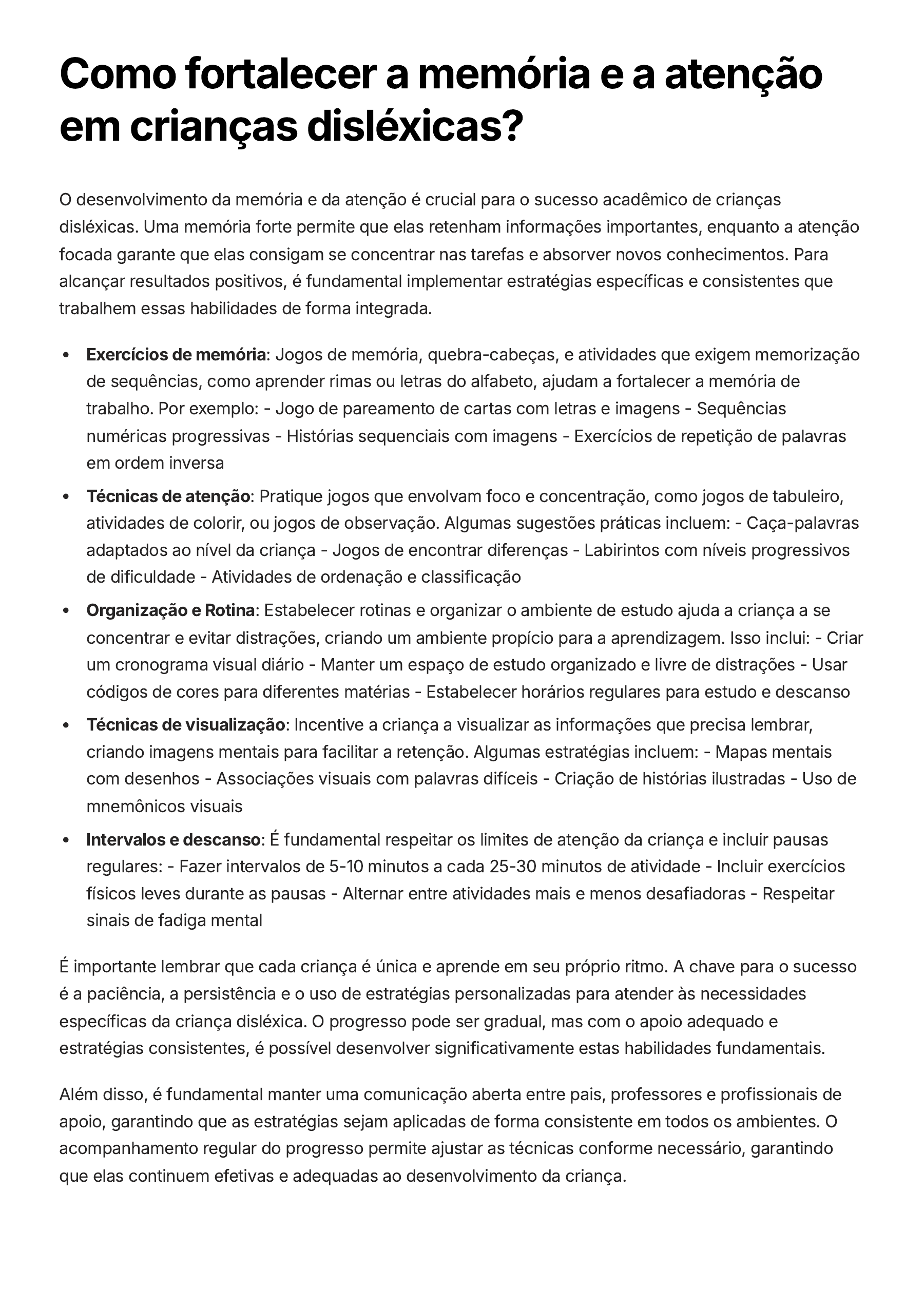 Como fortalecer a memória e a atenção em crianças disléxicas? O desenvolvimento da memória e da atenção é crucial para o sucesso acadêmico de crianças disléxicas. Uma memória forte permite que elas retenham informações importantes, enquanto a atenção focada garante que elas consigam se concentrar nas tarefas e absorver novos conhecimentos. Para alcançar resultados positivos, é fundamental implementar estratégias específicas e consistentes que trabalhem essas habilidades de forma integrada. Exercícios de memória: Jogos de memória, quebra-cabeças, e atividades que exigem memorização de sequências, como aprender rimas ou letras do alfabeto, ajudam a fortalecer a memória de trabalho. Por exemplo: - Jogo de pareamento de cartas com letras e imagens - Sequências numéricas progressivas - Histórias sequenciais com imagens - Exercícios de repetição de palavras em ordem inversa Técnicas de atenção: Pratique jogos que envolvam foco e concentração, como jogos de tabuleiro, atividades de colorir, ou jogos de observação. Algumas sugestões práticas incluem: - Caça-palavras adaptados ao nível da criança - Jogos de encontrar diferenças - Labirintos com níveis progressivos de dificuldade - Atividades de ordenação e classificação Organização e Rotina: Estabelecer rotinas e organizar o ambiente de estudo ajuda a criança a se concentrar e evitar distrações, criando um ambiente propício para a aprendizagem. Isso inclui: - Criar um cronograma visual diário - Manter um espaço de estudo organizado e livre de distrações - Usar códigos de cores para diferentes matérias - Estabelecer horários regulares para estudo e descanso Técnicas de visualização: Incentive a criança a visualizar as informações que precisa lembrar, criando imagens mentais para facilitar a retenção. Algumas estratégias incluem: - Mapas mentais com desenhos - Associações visuais com palavras difíceis - Criação de histórias ilustradas - Uso de mnemônicos visuais Intervalos e descanso: É fundamental respeitar os limites de atenção da criança e incluir pausas regulares: - Fazer intervalos de 5-10 minutos a cada 25-30 minutos de atividade - Incluir exercícios físicos leves durante as pausas - Alternar entre atividades mais e menos desafiadoras - Respeitar sinais de fadiga mental É importante lembrar que cada criança é única e aprende em seu próprio ritmo. A chave para o sucesso é a paciência, a persistência e o uso de estratégias personalizadas para atender às necessidades específicas da criança disléxica. O progresso pode ser gradual, mas com o apoio adequado e estratégias consistentes, é possível desenvolver significativamente estas habilidades fundamentais. Além disso, é fundamental manter uma comunicação aberta entre pais, professores e profissionais de apoio, garantindo que as estratégias sejam aplicadas de forma consistente em todos os ambientes. O acompanhamento regular do progresso permite ajustar as técnicas conforme necessário, garantindo que elas continuem efetivas e adequadas ao desenvolvimento da criança.