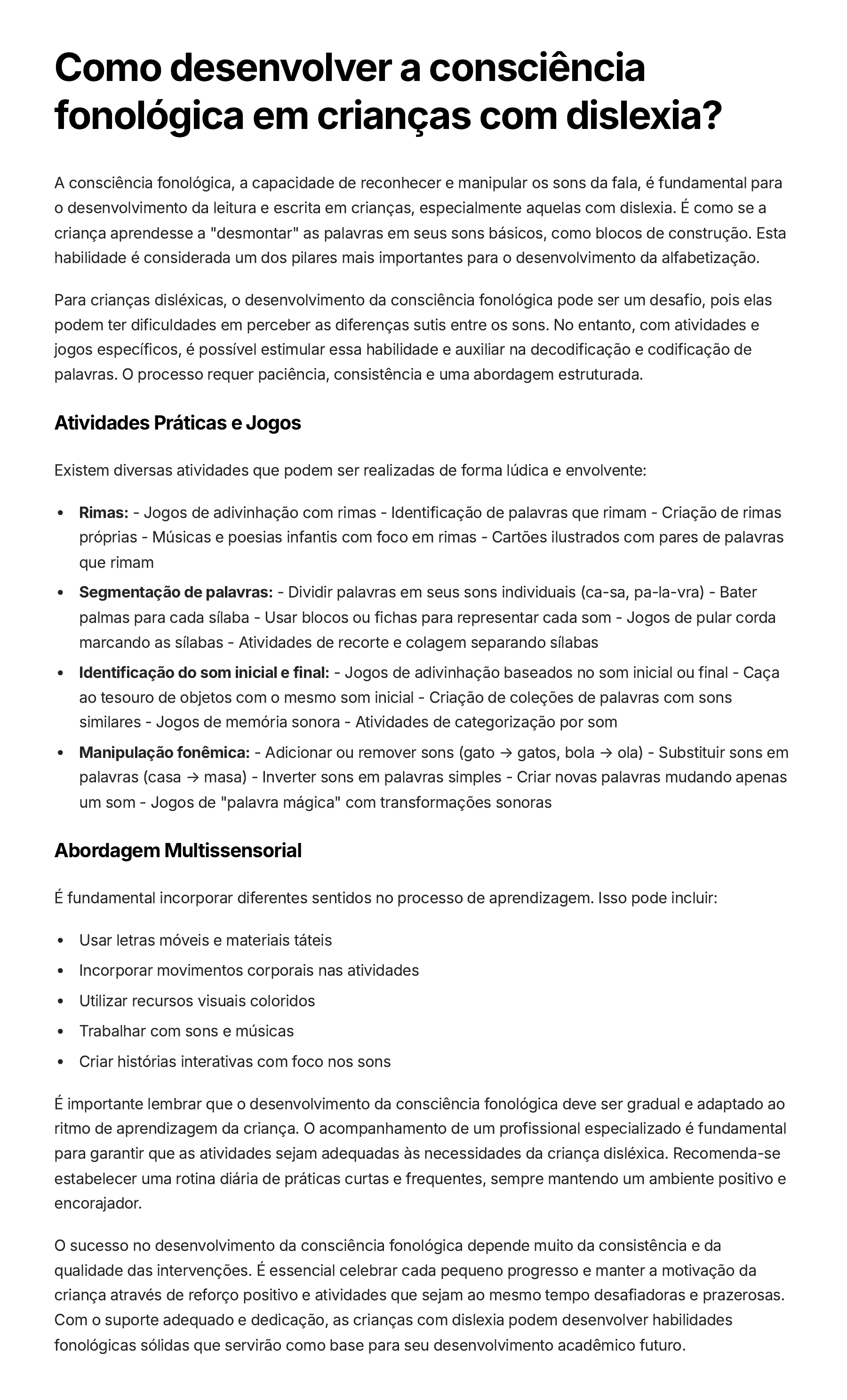 Como desenvolver a consciência fonológica em crianças com dislexia? A consciência fonológica, a capacidade de reconhecer e manipular os sons da fala, é fundamental para o desenvolvimento da leitura e escrita em crianças, especialmente aquelas com dislexia. É como se a criança aprendesse a "desmontar" as palavras em seus sons básicos, como blocos de construção. Esta habilidade é considerada um dos pilares mais importantes para o desenvolvimento da alfabetização. Para crianças disléxicas, o desenvolvimento da consciência fonológica pode ser um desafio, pois elas podem ter dificuldades em perceber as diferenças sutis entre os sons. No entanto, com atividades e jogos específicos, é possível estimular essa habilidade e auxiliar na decodificação e codificação de palavras. O processo requer paciência, consistência e uma abordagem estruturada. Atividades Práticas e Jogos Existem diversas atividades que podem ser realizadas de forma lúdica e envolvente: Rimas: - Jogos de adivinhação com rimas - Identificação de palavras que rimam - Criação de rimas próprias - Músicas e poesias infantis com foco em rimas - Cartões ilustrados com pares de palavras que rimam Segmentação de palavras: - Dividir palavras em seus sons individuais (ca-sa, pa-la-vra) - Bater palmas para cada sílaba - Usar blocos ou fichas para representar cada som - Jogos de pular corda marcando as sílabas - Atividades de recorte e colagem separando sílabas Identificação do som inicial e final: - Jogos de adivinhação baseados no som inicial ou final - Caça ao tesouro de objetos com o mesmo som inicial - Criação de coleções de palavras com sons similares - Jogos de memória sonora - Atividades de categorização por som Manipulação fonêmica: - Adicionar ou remover sons (gato → gatos, bola → ola) - Substituir sons em palavras (casa → masa) - Inverter sons em palavras simples - Criar novas palavras mudando apenas um som - Jogos de "palavra mágica" com transformações sonoras Abordagem Multissensorial É fundamental incorporar diferentes sentidos no processo de aprendizagem. Isso pode incluir: Usar letras móveis e materiais táteis Incorporar movimentos corporais nas atividades Utilizar recursos visuais coloridos Trabalhar com sons e músicas Criar histórias interativas com foco nos sons É importante lembrar que o desenvolvimento da consciência fonológica deve ser gradual e adaptado ao ritmo de aprendizagem da criança. O acompanhamento de um profissional especializado é fundamental para garantir que as atividades sejam adequadas às necessidades da criança disléxica. Recomenda-se estabelecer uma rotina diária de práticas curtas e frequentes, sempre mantendo um ambiente positivo e encorajador. O sucesso no desenvolvimento da consciência fonológica depende muito da consistência e da qualidade das intervenções. É essencial celebrar cada pequeno progresso e manter a motivação da criança através de reforço positivo e atividades que sejam ao mesmo tempo desafiadoras e prazerosas. Com o suporte adequado e dedicação, as crianças com dislexia podem desenvolver habilidades fonológicas sólidas que servirão como base para seu desenvolvimento acadêmico futuro.