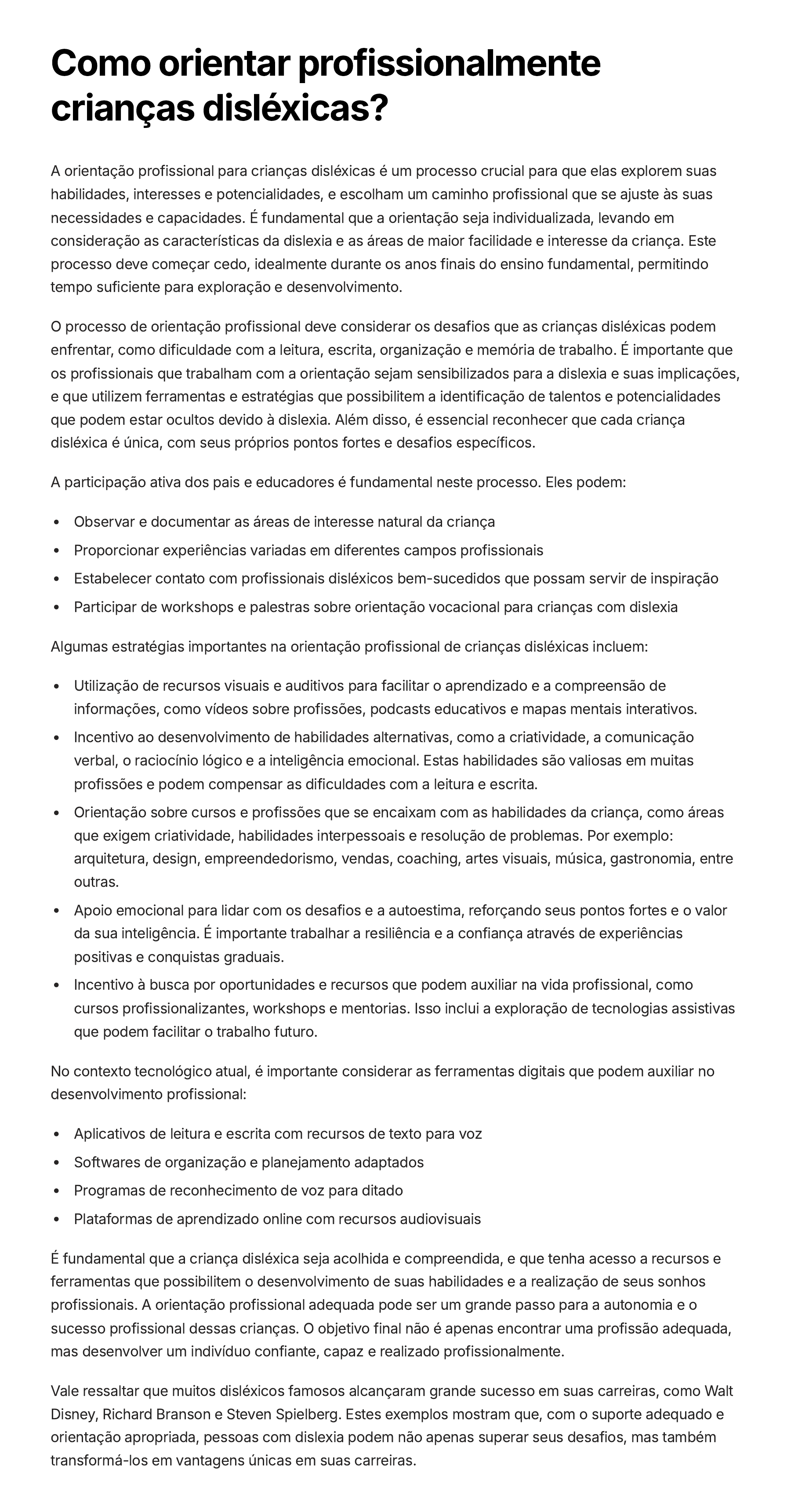 Como orientar profissionalmente crianças disléxicas? A orientação profissional para crianças disléxicas é um processo crucial para que elas explorem suas habilidades, interesses e potencialidades, e escolham um caminho profissional que se ajuste às suas necessidades e capacidades. É fundamental que a orientação seja individualizada, levando em consideração as características da dislexia e as áreas de maior facilidade e interesse da criança. Este processo deve começar cedo, idealmente durante os anos finais do ensino fundamental, permitindo tempo suficiente para exploração e desenvolvimento. O processo de orientação profissional deve considerar os desafios que as crianças disléxicas podem enfrentar, como dificuldade com a leitura, escrita, organização e memória de trabalho. É importante que os profissionais que trabalham com a orientação sejam sensibilizados para a dislexia e suas implicações, e que utilizem ferramentas e estratégias que possibilitem a identificação de talentos e potencialidades que podem estar ocultos devido à dislexia. Além disso, é essencial reconhecer que cada criança disléxica é única, com seus próprios pontos fortes e desafios específicos. A participação ativa dos pais e educadores é fundamental neste processo. Eles podem: Observar e documentar as áreas de interesse natural da criança Proporcionar experiências variadas em diferentes campos profissionais Estabelecer contato com profissionais disléxicos bem-sucedidos que possam servir de inspiração Participar de workshops e palestras sobre orientação vocacional para crianças com dislexia Algumas estratégias importantes na orientação profissional de crianças disléxicas incluem: Utilização de recursos visuais e auditivos para facilitar o aprendizado e a compreensão de informações, como vídeos sobre profissões, podcasts educativos e mapas mentais interativos. Incentivo ao desenvolvimento de habilidades alternativas, como a criatividade, a comunicação verbal, o raciocínio lógico e a inteligência emocional. Estas habilidades são valiosas em muitas profissões e podem compensar as dificuldades com a leitura e escrita. Orientação sobre cursos e profissões que se encaixam com as habilidades da criança, como áreas que exigem criatividade, habilidades interpessoais e resolução de problemas. Por exemplo: arquitetura, design, empreendedorismo, vendas, coaching, artes visuais, música, gastronomia, entre outras. Apoio emocional para lidar com os desafios e a autoestima, reforçando seus pontos fortes e o valor da sua inteligência. É importante trabalhar a resiliência e a confiança através de experiências positivas e conquistas graduais. Incentivo à busca por oportunidades e recursos que podem auxiliar na vida profissional, como cursos profissionalizantes, workshops e mentorias. Isso inclui a exploração de tecnologias assistivas que podem facilitar o trabalho futuro. No contexto tecnológico atual, é importante considerar as ferramentas digitais que podem auxiliar no desenvolvimento profissional: Aplicativos de leitura e escrita com recursos de texto para voz Softwares de organização e planejamento adaptados Programas de reconhecimento de voz para ditado Plataformas de aprendizado online com recursos audiovisuais É fundamental que a criança disléxica seja acolhida e compreendida, e que tenha acesso a recursos e ferramentas que possibilitem o desenvolvimento de suas habilidades e a realização de seus sonhos profissionais. A orientação profissional adequada pode ser um grande passo para a autonomia e o sucesso profissional dessas crianças. O objetivo final não é apenas encontrar uma profissão adequada, mas desenvolver um indivíduo confiante, capaz e realizado profissionalmente. Vale ressaltar que muitos disléxicos famosos alcançaram grande sucesso em suas carreiras, como Walt Disney, Richard Branson e Steven Spielberg. Estes exemplos mostram que, com o suporte adequado e orientação apropriada, pessoas com dislexia podem não apenas superar seus desafios, mas também transformá-los em vantagens únicas em suas carreiras.