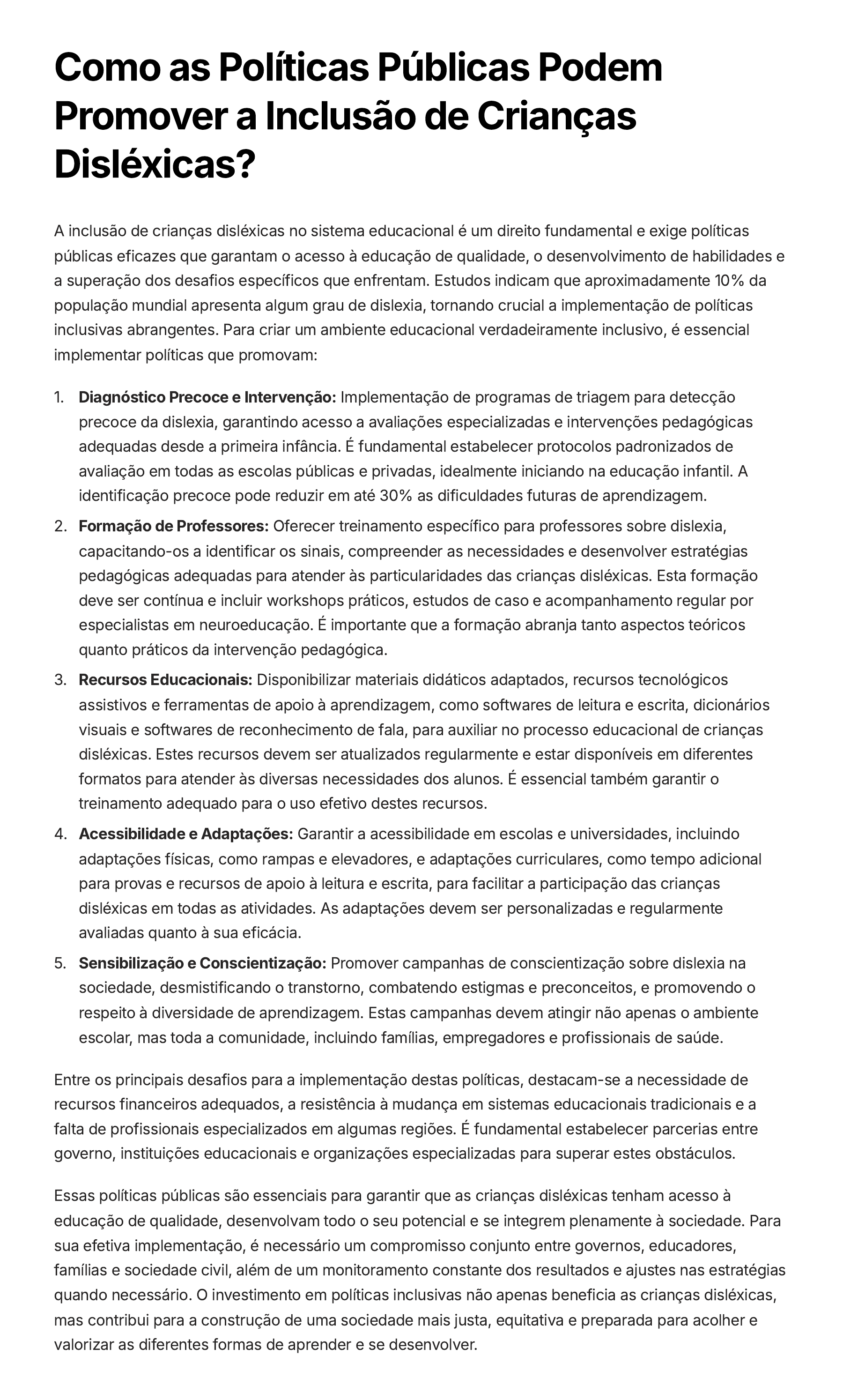 Como as Políticas Públicas Podem Promover a Inclusão de Crianças Disléxicas? A inclusão de crianças disléxicas no sistema educacional é um direito fundamental e exige políticas públicas eficazes que garantam o acesso à educação de qualidade, o desenvolvimento de habilidades e a superação dos desafios específicos que enfrentam. Estudos indicam que aproximadamente 10% da população mundial apresenta algum grau de dislexia, tornando crucial a implementação de políticas inclusivas abrangentes. Para criar um ambiente educacional verdadeiramente inclusivo, é essencial implementar políticas que promovam: Diagnóstico Precoce e Intervenção: Implementação de programas de triagem para detecção precoce da dislexia, garantindo acesso a avaliações especializadas e intervenções pedagógicas adequadas desde a primeira infância. É fundamental estabelecer protocolos padronizados de avaliação em todas as escolas públicas e privadas, idealmente iniciando na educação infantil. A identificação precoce pode reduzir em até 30% as dificuldades futuras de aprendizagem. 1. Formação de Professores: Oferecer treinamento específico para professores sobre dislexia, capacitando-os a identificar os sinais, compreender as necessidades e desenvolver estratégias pedagógicas adequadas para atender às particularidades das crianças disléxicas. Esta formação deve ser contínua e incluir workshops práticos, estudos de caso e acompanhamento regular por especialistas em neuroeducação. É importante que a formação abranja tanto aspectos teóricos quanto práticos da intervenção pedagógica. 2. Recursos Educacionais: Disponibilizar materiais didáticos adaptados, recursos tecnológicos assistivos e ferramentas de apoio à aprendizagem, como softwares de leitura e escrita, dicionários visuais e softwares de reconhecimento de fala, para auxiliar no processo educacional de crianças disléxicas. Estes recursos devem ser atualizados regularmente e estar disponíveis em diferentes formatos para atender às diversas necessidades dos alunos. É essencial também garantir o treinamento adequado para o uso efetivo destes recursos. 3. Acessibilidade e Adaptações: Garantir a acessibilidade em escolas e universidades, incluindo adaptações físicas, como rampas e elevadores, e adaptações curriculares, como tempo adicional para provas e recursos de apoio à leitura e escrita, para facilitar a participação das crianças disléxicas em todas as atividades. As adaptações devem ser personalizadas e regularmente avaliadas quanto à sua eficácia. 4. Sensibilização e Conscientização: Promover campanhas de conscientização sobre dislexia na sociedade, desmistificando o transtorno, combatendo estigmas e preconceitos, e promovendo o respeito à diversidade de aprendizagem. Estas campanhas devem atingir não apenas o ambiente escolar, mas toda a comunidade, incluindo famílias, empregadores e profissionais de saúde. 5. Entre os principais desafios para a implementação destas políticas, destacam-se a necessidade de recursos financeiros adequados, a resistência à mudança em sistemas educacionais tradicionais e a falta de profissionais especializados em algumas regiões. É fundamental estabelecer parcerias entre governo, instituições educacionais e organizações especializadas para superar estes obstáculos. Essas políticas públicas são essenciais para garantir que as crianças disléxicas tenham acesso à educação de qualidade, desenvolvam todo o seu potencial e se integrem plenamente à sociedade. Para sua efetiva implementação, é necessário um compromisso conjunto entre governos, educadores, famílias e sociedade civil, além de um monitoramento constante dos resultados e ajustes nas estratégias quando necessário. O investimento em políticas inclusivas não apenas beneficia as crianças disléxicas, mas contribui para a construção de uma sociedade mais justa, equitativa e preparada para acolher e valorizar as diferentes formas de aprender e se desenvolver.