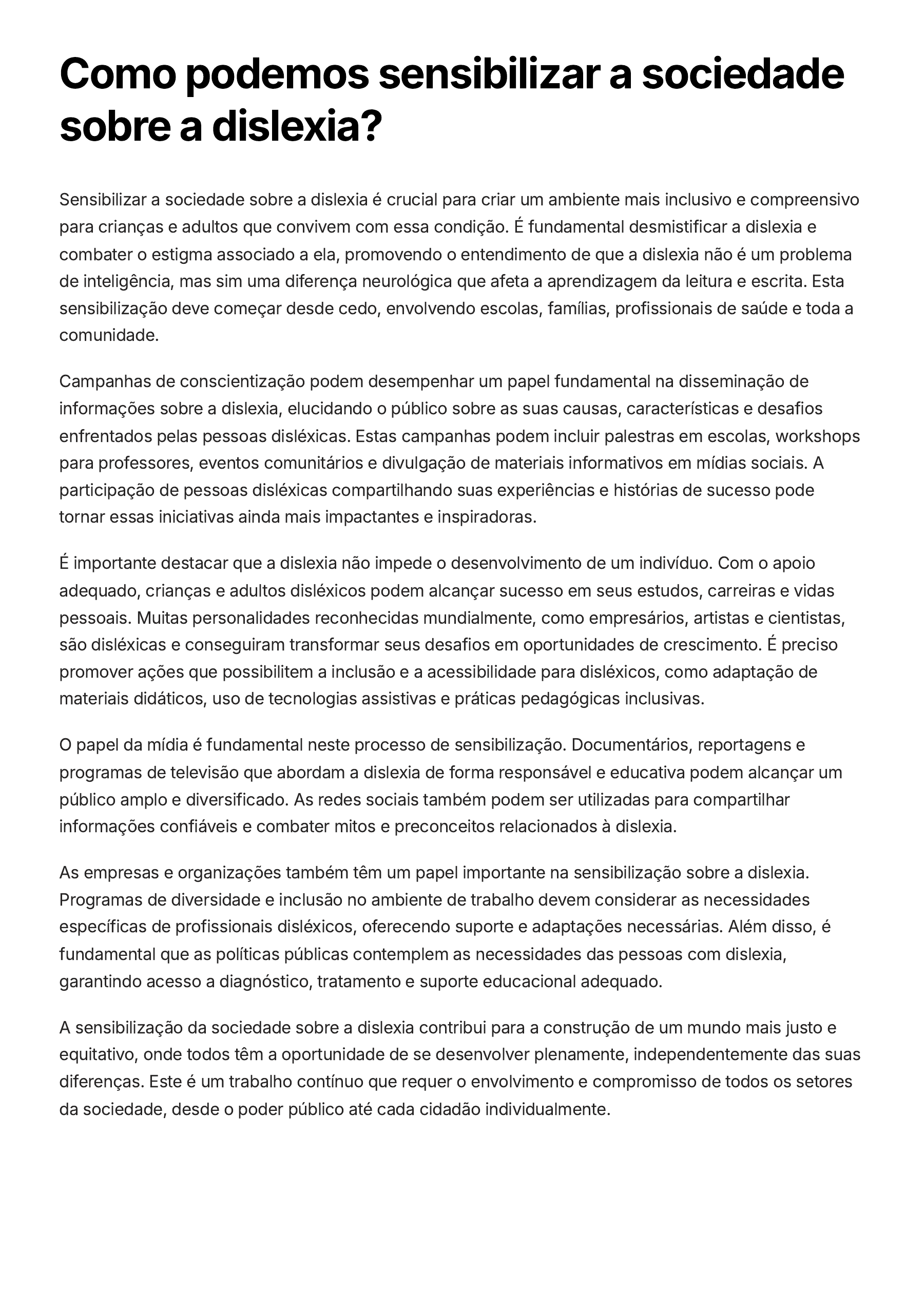 Como podemos sensibilizar a sociedade sobre a dislexia? Sensibilizar a sociedade sobre a dislexia é crucial para criar um ambiente mais inclusivo e compreensivo para crianças e adultos que convivem com essa condição. É fundamental desmistificar a dislexia e combater o estigma associado a ela, promovendo o entendimento de que a dislexia não é um problema de inteligência, mas sim uma diferença neurológica que afeta a aprendizagem da leitura e escrita. Esta sensibilização deve começar desde cedo, envolvendo escolas, famílias, profissionais de saúde e toda a comunidade. Campanhas de conscientização podem desempenhar um papel fundamental na disseminação de informações sobre a dislexia, elucidando o público sobre as suas causas, características e desafios enfrentados pelas pessoas disléxicas. Estas campanhas podem incluir palestras em escolas, workshops para professores, eventos comunitários e divulgação de materiais informativos em mídias sociais. A participação de pessoas disléxicas compartilhando suas experiências e histórias de sucesso pode tornar essas iniciativas ainda mais impactantes e inspiradoras. É importante destacar que a dislexia não impede o desenvolvimento de um indivíduo. Com o apoio adequado, crianças e adultos disléxicos podem alcançar sucesso em seus estudos, carreiras e vidas pessoais. Muitas personalidades reconhecidas mundialmente, como empresários, artistas e cientistas, são disléxicas e conseguiram transformar seus desafios em oportunidades de crescimento. É preciso promover ações que possibilitem a inclusão e a acessibilidade para disléxicos, como adaptação de materiais didáticos, uso de tecnologias assistivas e práticas pedagógicas inclusivas. O papel da mídia é fundamental neste processo de sensibilização. Documentários, reportagens e programas de televisão que abordam a dislexia de forma responsável e educativa podem alcançar um público amplo e diversificado. As redes sociais também podem ser utilizadas para compartilhar informações confiáveis e combater mitos e preconceitos relacionados à dislexia. As empresas e organizações também têm um papel importante na sensibilização sobre a dislexia. Programas de diversidade e inclusão no ambiente de trabalho devem considerar as necessidades específicas de profissionais disléxicos, oferecendo suporte e adaptações necessárias. Além disso, é fundamental que as políticas públicas contemplem as necessidades das pessoas com dislexia, garantindo acesso a diagnóstico, tratamento e suporte educacional adequado. A sensibilização da sociedade sobre a dislexia contribui para a construção de um mundo mais justo e equitativo, onde todos têm a oportunidade de se desenvolver plenamente, independentemente das suas diferenças. Este é um trabalho contínuo que requer o envolvimento e compromisso de todos os setores da sociedade, desde o poder público até cada cidadão individualmente.