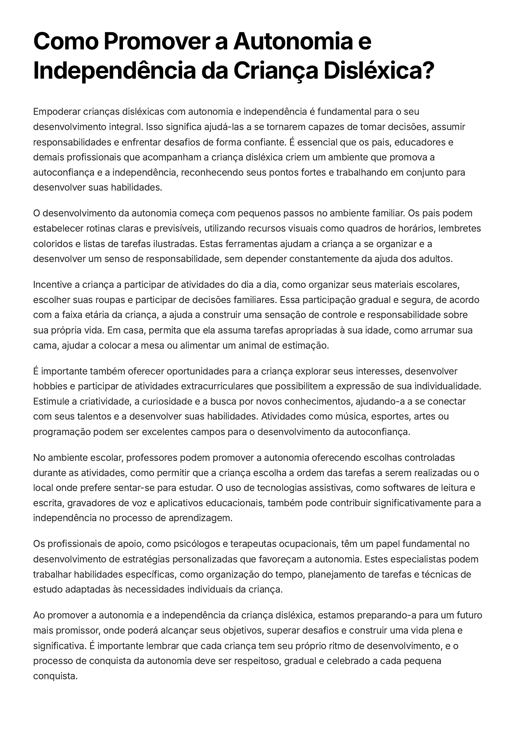 Como Promover a Autonomia e Independência da Criança Disléxica? Empoderar crianças disléxicas com autonomia e independência é fundamental para o seu desenvolvimento integral. Isso significa ajudá-las a se tornarem capazes de tomar decisões, assumir responsabilidades e enfrentar desafios de forma confiante. É essencial que os pais, educadores e demais profissionais que acompanham a criança disléxica criem um ambiente que promova a autoconfiança e a independência, reconhecendo seus pontos fortes e trabalhando em conjunto para desenvolver suas habilidades. O desenvolvimento da autonomia começa com pequenos passos no ambiente familiar. Os pais podem estabelecer rotinas claras e previsíveis, utilizando recursos visuais como quadros de horários, lembretes coloridos e listas de tarefas ilustradas. Estas ferramentas ajudam a criança a se organizar e a desenvolver um senso de responsabilidade, sem depender constantemente da ajuda dos adultos. Incentive a criança a participar de atividades do dia a dia, como organizar seus materiais escolares, escolher suas roupas e participar de decisões familiares. Essa participação gradual e segura, de acordo com a faixa etária da criança, a ajuda a construir uma sensação de controle e responsabilidade sobre sua própria vida. Em casa, permita que ela assuma tarefas apropriadas à sua idade, como arrumar sua cama, ajudar a colocar a mesa ou alimentar um animal de estimação. É importante também oferecer oportunidades para a criança explorar seus interesses, desenvolver hobbies e participar de atividades extracurriculares que possibilitem a expressão de sua individualidade. Estimule a criatividade, a curiosidade e a busca por novos conhecimentos, ajudando-a a se conectar com seus talentos e a desenvolver suas habilidades. Atividades como música, esportes, artes ou programação podem ser excelentes campos para o desenvolvimento da autoconfiança. No ambiente escolar, professores podem promover a autonomia oferecendo escolhas controladas durante as atividades, como permitir que a criança escolha a ordem das tarefas a serem realizadas ou o local onde prefere sentar-se para estudar. O uso de tecnologias assistivas, como softwares de leitura e escrita, gravadores de voz e aplicativos educacionais, também pode contribuir significativamente para a independência no processo de aprendizagem. Os profissionais de apoio, como psicólogos e terapeutas ocupacionais, têm um papel fundamental no desenvolvimento de estratégias personalizadas que favoreçam a autonomia. Estes especialistas podem trabalhar habilidades específicas, como organização do tempo, planejamento de tarefas e técnicas de estudo adaptadas às necessidades individuais da criança. Ao promover a autonomia e a independência da criança disléxica, estamos preparando-a para um futuro mais promissor, onde poderá alcançar seus objetivos, superar desafios e construir uma vida plena e significativa. É importante lembrar que cada criança tem seu próprio ritmo de desenvolvimento, e o processo de conquista da autonomia deve ser respeitoso, gradual e celebrado a cada pequena conquista.