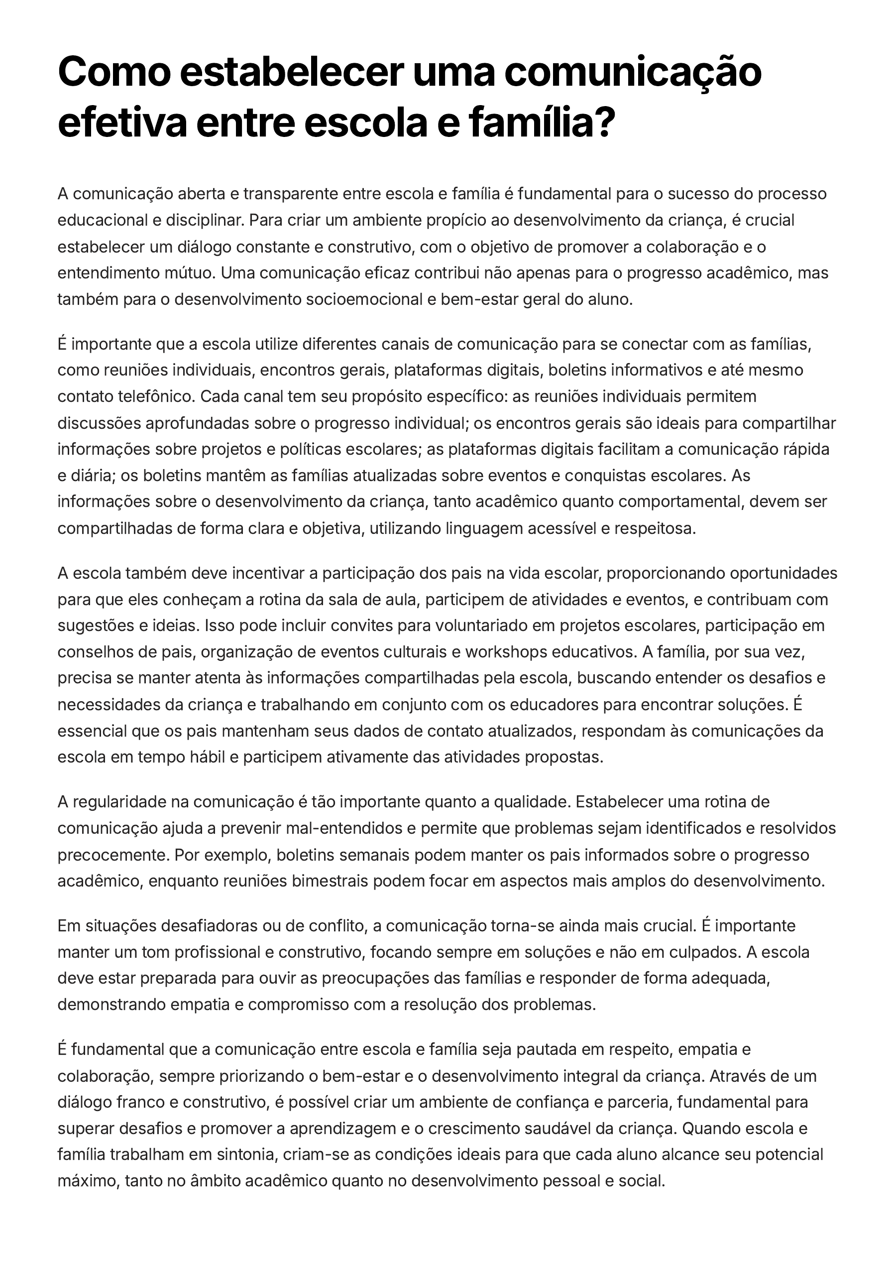 Como estabelecer uma comunicação efetiva entre escola e família? A comunicação aberta e transparente entre escola e família é fundamental para o sucesso do processo educacional e disciplinar. Para criar um ambiente propício ao desenvolvimento da criança, é crucial estabelecer um diálogo constante e construtivo, com o objetivo de promover a colaboração e o entendimento mútuo. Uma comunicação eficaz contribui não apenas para o progresso acadêmico, mas também para o desenvolvimento socioemocional e bem-estar geral do aluno. É importante que a escola utilize diferentes canais de comunicação para se conectar com as famílias, como reuniões individuais, encontros gerais, plataformas digitais, boletins informativos e até mesmo contato telefônico. Cada canal tem seu propósito específico: as reuniões individuais permitem discussões aprofundadas sobre o progresso individual; os encontros gerais são ideais para compartilhar informações sobre projetos e políticas escolares; as plataformas digitais facilitam a comunicação rápida e diária; os boletins mantêm as famílias atualizadas sobre eventos e conquistas escolares. As informações sobre o desenvolvimento da criança, tanto acadêmico quanto comportamental, devem ser compartilhadas de forma clara e objetiva, utilizando linguagem acessível e respeitosa. A escola também deve incentivar a participação dos pais na vida escolar, proporcionando oportunidades para que eles conheçam a rotina da sala de aula, participem de atividades e eventos, e contribuam com sugestões e ideias. Isso pode incluir convites para voluntariado em projetos escolares, participação em conselhos de pais, organização de eventos culturais e workshops educativos. A família, por sua vez, precisa se manter atenta às informações compartilhadas pela escola, buscando entender os desafios e necessidades da criança e trabalhando em conjunto com os educadores para encontrar soluções. É essencial que os pais mantenham seus dados de contato atualizados, respondam às comunicações da escola em tempo hábil e participem ativamente das atividades propostas. A regularidade na comunicação é tão importante quanto a qualidade. Estabelecer uma rotina de comunicação ajuda a prevenir mal-entendidos e permite que problemas sejam identificados e resolvidos precocemente. Por exemplo, boletins semanais podem manter os pais informados sobre o progresso acadêmico, enquanto reuniões bimestrais podem focar em aspectos mais amplos do desenvolvimento. Em situações desafiadoras ou de conflito, a comunicação torna-se ainda mais crucial. É importante manter um tom profissional e construtivo, focando sempre em soluções e não em culpados. A escola deve estar preparada para ouvir as preocupações das famílias e responder de forma adequada, demonstrando empatia e compromisso com a resolução dos problemas. É fundamental que a comunicação entre escola e família seja pautada em respeito, empatia e colaboração, sempre priorizando o bem-estar e o desenvolvimento integral da criança. Através de um diálogo franco e construtivo, é possível criar um ambiente de confiança e parceria, fundamental para superar desafios e promover a aprendizagem e o crescimento saudável da criança. Quando escola e família trabalham em sintonia, criam-se as condições ideais para que cada aluno alcance seu potencial máximo, tanto no âmbito acadêmico quanto no desenvolvimento pessoal e social.