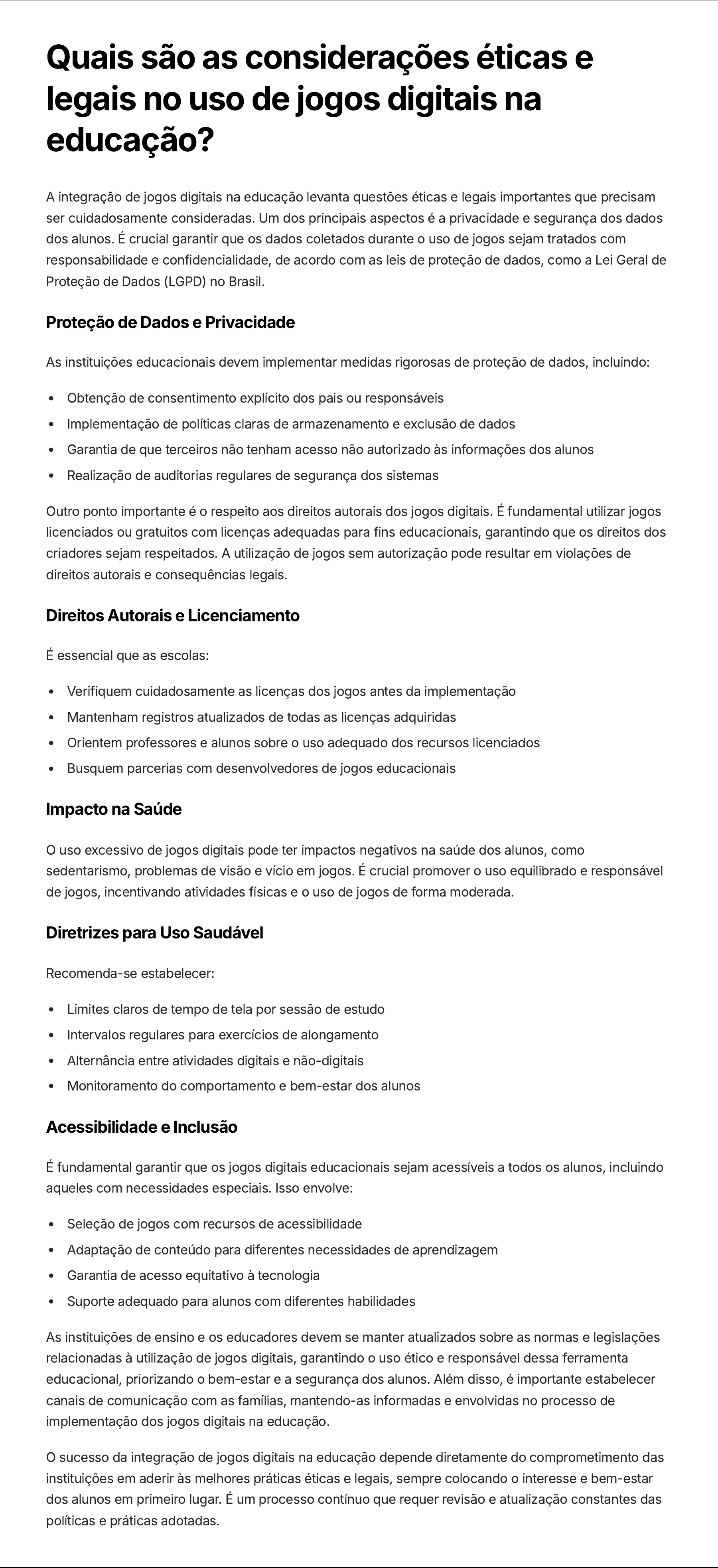 Quais são as considerações éticas e legais no uso de jogos digitais na educação? A integração de jogos digitais na educação levanta questões éticas e legais importantes que precisam ser cuidadosamente consideradas. Um dos principais aspectos é a privacidade e segurança dos dados dos alunos. É crucial garantir que os dados coletados durante o uso de jogos sejam tratados com responsabilidade e confidencialidade, de acordo com as leis de proteção de dados, como a Lei Geral de Proteção de Dados (LGPD) no Brasil. Proteção de Dados e Privacidade As instituições educacionais devem implementar medidas rigorosas de proteção de dados, incluindo: Obtenção de consentimento explícito dos pais ou responsáveis Implementação de políticas claras de armazenamento e exclusão de dados Garantia de que terceiros não tenham acesso não autorizado às informações dos alunos Realização de auditorias regulares de segurança dos sistemas Outro ponto importante é o respeito aos direitos autorais dos jogos digitais. É fundamental utilizar jogos licenciados ou gratuitos com licenças adequadas para fins educacionais, garantindo que os direitos dos criadores sejam respeitados. A utilização de jogos sem autorização pode resultar em violações de direitos autorais e consequências legais. Direitos Autorais e Licenciamento É essencial que as escolas: Verifiquem cuidadosamente as licenças dos jogos antes da implementação Mantenham registros atualizados de todas as licenças adquiridas Orientem professores e alunos sobre o uso adequado dos recursos licenciados Busquem parcerias com desenvolvedores de jogos educacionais Impacto na Saúde O uso excessivo de jogos digitais pode ter impactos negativos na saúde dos alunos, como sedentarismo, problemas de visão e vício em jogos. É crucial promover o uso equilibrado e responsável de jogos, incentivando atividades físicas e o uso de jogos de forma moderada. Diretrizes para Uso Saudável Recomenda-se estabelecer: Limites claros de tempo de tela por sessão de estudo Intervalos regulares para exercícios de alongamento Alternância entre atividades digitais e não-digitais Monitoramento do comportamento e bem-estar dos alunos Acessibilidade e Inclusão É fundamental garantir que os jogos digitais educacionais sejam acessíveis a todos os alunos, incluindo aqueles com necessidades especiais. Isso envolve: Seleção de jogos com recursos de acessibilidade Adaptação de conteúdo para diferentes necessidades de aprendizagem Garantia de acesso equitativo à tecnologia Suporte adequado para alunos com diferentes habilidades As instituições de ensino e os educadores devem se manter atualizados sobre as normas e legislações relacionadas à utilização de jogos digitais, garantindo o uso ético e responsável dessa ferramenta educacional, priorizando o bem-estar e a segurança dos alunos. Além disso, é importante estabelecer canais de comunicação com as famílias, mantendo-as informadas e envolvidas no processo de implementação dos jogos digitais na educação. O sucesso da integração de jogos digitais na educação depende diretamente do comprometimento das instituições em aderir às melhores práticas éticas e legais, sempre colocando o interesse e bem-estar dos alunos em primeiro lugar. É um processo contínuo que requer revisão e atualização constantes das políticas e práticas adotadas.