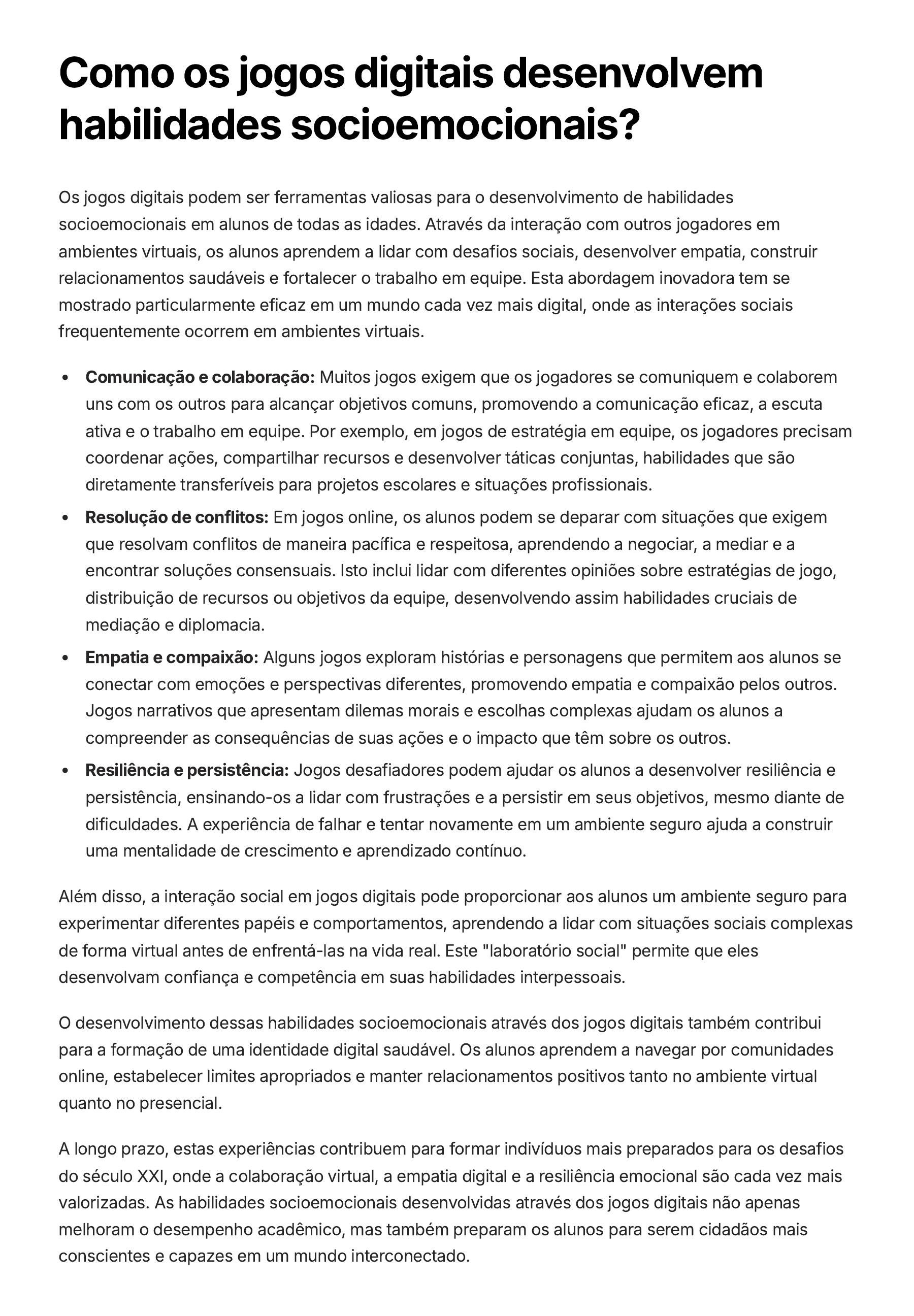 Como os jogos digitais desenvolvem habilidades socioemocionais? Os jogos digitais podem ser ferramentas valiosas para o desenvolvimento de habilidades socioemocionais em alunos de todas as idades. Através da interação com outros jogadores em ambientes virtuais, os alunos aprendem a lidar com desafios sociais, desenvolver empatia, construir relacionamentos saudáveis e fortalecer o trabalho em equipe. Esta abordagem inovadora tem se mostrado particularmente eficaz em um mundo cada vez mais digital, onde as interações sociais frequentemente ocorrem em ambientes virtuais. Comunicação e colaboração: Muitos jogos exigem que os jogadores se comuniquem e colaborem uns com os outros para alcançar objetivos comuns, promovendo a comunicação eficaz, a escuta ativa e o trabalho em equipe. Por exemplo, em jogos de estratégia em equipe, os jogadores precisam coordenar ações, compartilhar recursos e desenvolver táticas conjuntas, habilidades que são diretamente transferíveis para projetos escolares e situações profissionais. Resolução de conflitos: Em jogos online, os alunos podem se deparar com situações que exigem que resolvam conflitos de maneira pacífica e respeitosa, aprendendo a negociar, a mediar e a encontrar soluções consensuais. Isto inclui lidar com diferentes opiniões sobre estratégias de jogo, distribuição de recursos ou objetivos da equipe, desenvolvendo assim habilidades cruciais de mediação e diplomacia. Empatia e compaixão: Alguns jogos exploram histórias e personagens que permitem aos alunos se conectar com emoções e perspectivas diferentes, promovendo empatia e compaixão pelos outros. Jogos narrativos que apresentam dilemas morais e escolhas complexas ajudam os alunos a compreender as consequências de suas ações e o impacto que têm sobre os outros. Resiliência e persistência: Jogos desafiadores podem ajudar os alunos a desenvolver resiliência e persistência, ensinando-os a lidar com frustrações e a persistir em seus objetivos, mesmo diante de dificuldades. A experiência de falhar e tentar novamente em um ambiente seguro ajuda a construir uma mentalidade de crescimento e aprendizado contínuo. Além disso, a interação social em jogos digitais pode proporcionar aos alunos um ambiente seguro para experimentar diferentes papéis e comportamentos, aprendendo a lidar com situações sociais complexas de forma virtual antes de enfrentá-las na vida real. Este "laboratório social" permite que eles desenvolvam confiança e competência em suas habilidades interpessoais. O desenvolvimento dessas habilidades socioemocionais através dos jogos digitais também contribui para a formação de uma identidade digital saudável. Os alunos aprendem a navegar por comunidades online, estabelecer limites apropriados e manter relacionamentos positivos tanto no ambiente virtual quanto no presencial. A longo prazo, estas experiências contribuem para formar indivíduos mais preparados para os desafios do século XXI, onde a colaboração virtual, a empatia digital e a resiliência emocional são cada vez mais valorizadas. As habilidades socioemocionais desenvolvidas através dos jogos digitais não apenas melhoram o desempenho acadêmico, mas também preparam os alunos para serem cidadãos mais conscientes e capazes em um mundo interconectado.