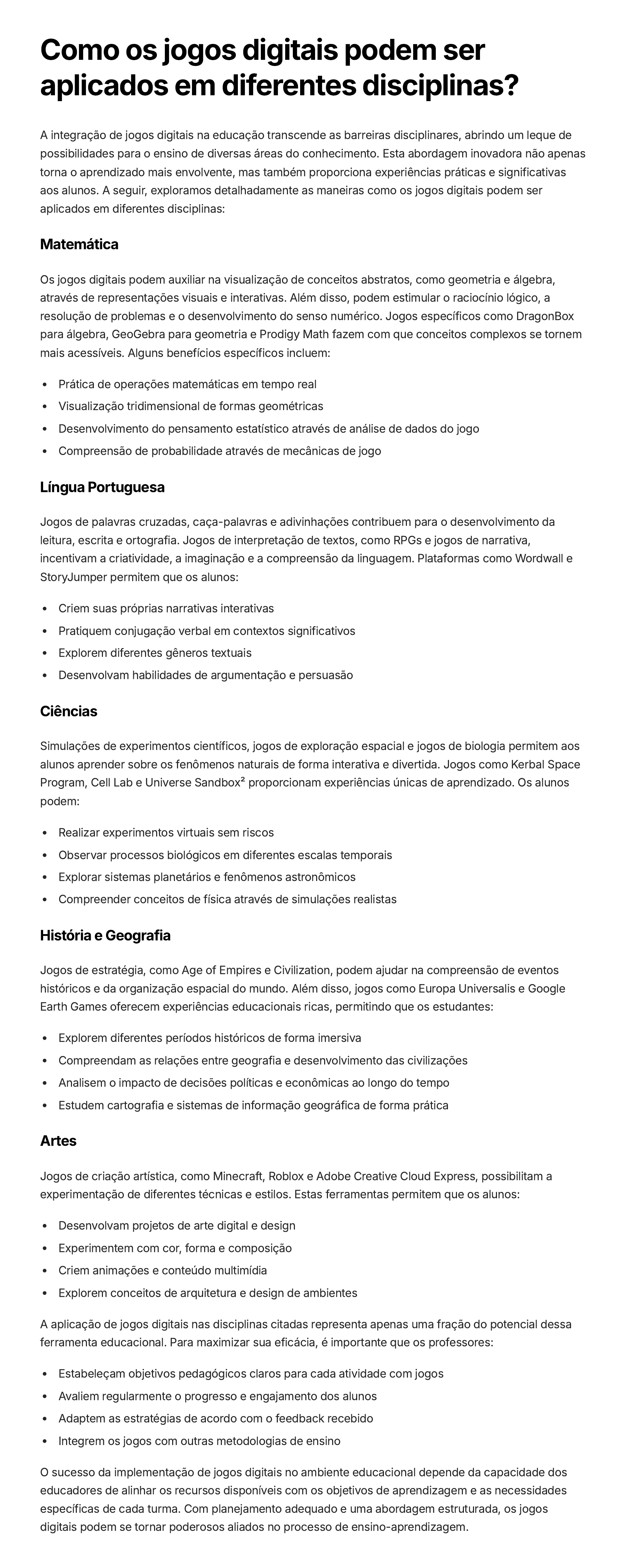 Como os jogos digitais podem ser aplicados em diferentes disciplinas? A integração de jogos digitais na educação transcende as barreiras disciplinares, abrindo um leque de possibilidades para o ensino de diversas áreas do conhecimento. Esta abordagem inovadora não apenas torna o aprendizado mais envolvente, mas também proporciona experiências práticas e significativas aos alunos. A seguir, exploramos detalhadamente as maneiras como os jogos digitais podem ser aplicados em diferentes disciplinas: Matemática Os jogos digitais podem auxiliar na visualização de conceitos abstratos, como geometria e álgebra, através de representações visuais e interativas. Além disso, podem estimular o raciocínio lógico, a resolução de problemas e o desenvolvimento do senso numérico. Jogos específicos como DragonBox para álgebra, GeoGebra para geometria e Prodigy Math fazem com que conceitos complexos se tornem mais acessíveis. Alguns benefícios específicos incluem: Prática de operações matemáticas em tempo real Visualização tridimensional de formas geométricas Desenvolvimento do pensamento estatístico através de análise de dados do jogo Compreensão de probabilidade através de mecânicas de jogo Língua Portuguesa Jogos de palavras cruzadas, caça-palavras e adivinhações contribuem para o desenvolvimento da leitura, escrita e ortografia. Jogos de interpretação de textos, como RPGs e jogos de narrativa, incentivam a criatividade, a imaginação e a compreensão da linguagem. Plataformas como Wordwall e StoryJumper permitem que os alunos: Criem suas próprias narrativas interativas Pratiquem conjugação verbal em contextos significativos Explorem diferentes gêneros textuais Desenvolvam habilidades de argumentação e persuasão Ciências Simulações de experimentos científicos, jogos de exploração espacial e jogos de biologia permitem aos alunos aprender sobre os fenômenos naturais de forma interativa e divertida. Jogos como Kerbal Space Program, Cell Lab e Universe Sandbox² proporcionam experiências únicas de aprendizado. Os alunos podem: Realizar experimentos virtuais sem riscos Observar processos biológicos em diferentes escalas temporais Explorar sistemas planetários e fenômenos astronômicos Compreender conceitos de física através de simulações realistas História e Geografia Jogos de estratégia, como Age of Empires e Civilization, podem ajudar na compreensão de eventos históricos e da organização espacial do mundo. Além disso, jogos como Europa Universalis e Google Earth Games oferecem experiências educacionais ricas, permitindo que os estudantes: Explorem diferentes períodos históricos de forma imersiva Compreendam as relações entre geografia e desenvolvimento das civilizações Analisem o impacto de decisões políticas e econômicas ao longo do tempo Estudem cartografia e sistemas de informação geográfica de forma prática Artes Jogos de criação artística, como Minecraft, Roblox e Adobe Creative Cloud Express, possibilitam a experimentação de diferentes técnicas e estilos. Estas ferramentas permitem que os alunos: Desenvolvam projetos de arte digital e design Experimentem com cor, forma e composição Criem animações e conteúdo multimídia Explorem conceitos de arquitetura e design de ambientes A aplicação de jogos digitais nas disciplinas citadas representa apenas uma fração do potencial dessa ferramenta educacional. Para maximizar sua eficácia, é importante que os professores: Estabeleçam objetivos pedagógicos claros para cada atividade com jogos Avaliem regularmente o progresso e engajamento dos alunos Adaptem as estratégias de acordo com o feedback recebido Integrem os jogos com outras metodologias de ensino O sucesso da implementação de jogos digitais no ambiente educacional depende da capacidade dos educadores de alinhar os recursos disponíveis com os objetivos de aprendizagem e as necessidades específicas de cada turma. Com planejamento adequado e uma abordagem estruturada, os jogos digitais podem se tornar poderosos aliados no processo de ensino-aprendizagem.