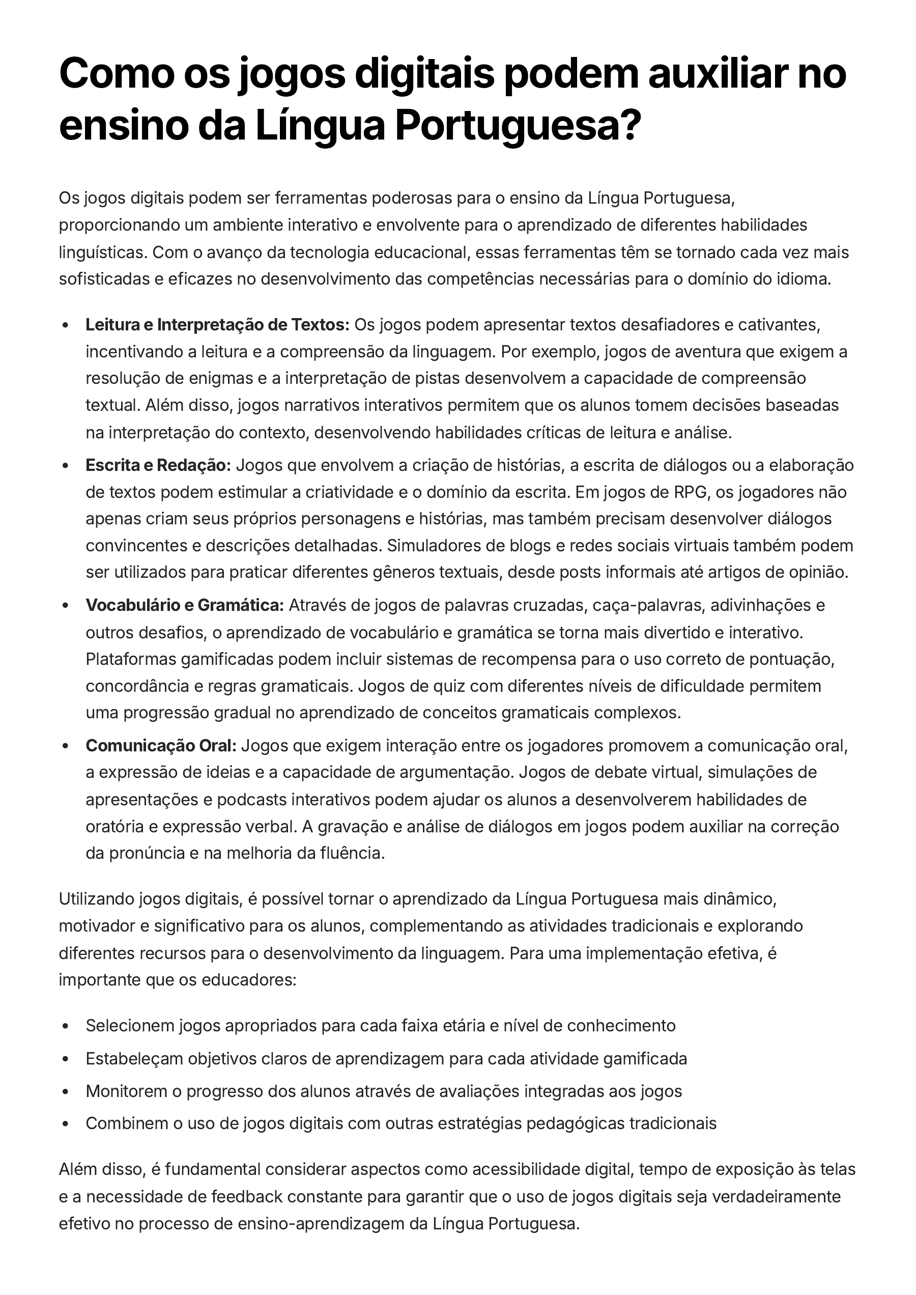 Como os jogos digitais podem auxiliar no ensino da Língua Portuguesa? Os jogos digitais podem ser ferramentas poderosas para o ensino da Língua Portuguesa, proporcionando um ambiente interativo e envolvente para o aprendizado de diferentes habilidades linguísticas. Com o avanço da tecnologia educacional, essas ferramentas têm se tornado cada vez mais sofisticadas e eficazes no desenvolvimento das competências necessárias para o domínio do idioma. Leitura e Interpretação de Textos: Os jogos podem apresentar textos desafiadores e cativantes, incentivando a leitura e a compreensão da linguagem. Por exemplo, jogos de aventura que exigem a resolução de enigmas e a interpretação de pistas desenvolvem a capacidade de compreensão textual. Além disso, jogos narrativos interativos permitem que os alunos tomem decisões baseadas na interpretação do contexto, desenvolvendo habilidades críticas de leitura e análise. Escrita e Redação: Jogos que envolvem a criação de histórias, a escrita de diálogos ou a elaboração de textos podem estimular a criatividade e o domínio da escrita. Em jogos de RPG, os jogadores não apenas criam seus próprios personagens e histórias, mas também precisam desenvolver diálogos convincentes e descrições detalhadas. Simuladores de blogs e redes sociais virtuais também podem ser utilizados para praticar diferentes gêneros textuais, desde posts informais até artigos de opinião. Vocabulário e Gramática: Através de jogos de palavras cruzadas, caça-palavras, adivinhações e outros desafios, o aprendizado de vocabulário e gramática se torna mais divertido e interativo. Plataformas gamificadas podem incluir sistemas de recompensa para o uso correto de pontuação, concordância e regras gramaticais. Jogos de quiz com diferentes níveis de dificuldade permitem uma progressão gradual no aprendizado de conceitos gramaticais complexos. Comunicação Oral: Jogos que exigem interação entre os jogadores promovem a comunicação oral, a expressão de ideias e a capacidade de argumentação. Jogos de debate virtual, simulações de apresentações e podcasts interativos podem ajudar os alunos a desenvolverem habilidades de oratória e expressão verbal. A gravação e análise de diálogos em jogos podem auxiliar na correção da pronúncia e na melhoria da fluência. Utilizando jogos digitais, é possível tornar o aprendizado da Língua Portuguesa mais dinâmico, motivador e significativo para os alunos, complementando as atividades tradicionais e explorando diferentes recursos para o desenvolvimento da linguagem. Para uma implementação efetiva, é importante que os educadores: Selecionem jogos apropriados para cada faixa etária e nível de conhecimento Estabeleçam objetivos claros de aprendizagem para cada atividade gamificada Monitorem o progresso dos alunos através de avaliações integradas aos jogos Combinem o uso de jogos digitais com outras estratégias pedagógicas tradicionais Além disso, é fundamental considerar aspectos como acessibilidade digital, tempo de exposição às telas e a necessidade de feedback constante para garantir que o uso de jogos digitais seja verdadeiramente efetivo no processo de ensino-aprendizagem da Língua Portuguesa.