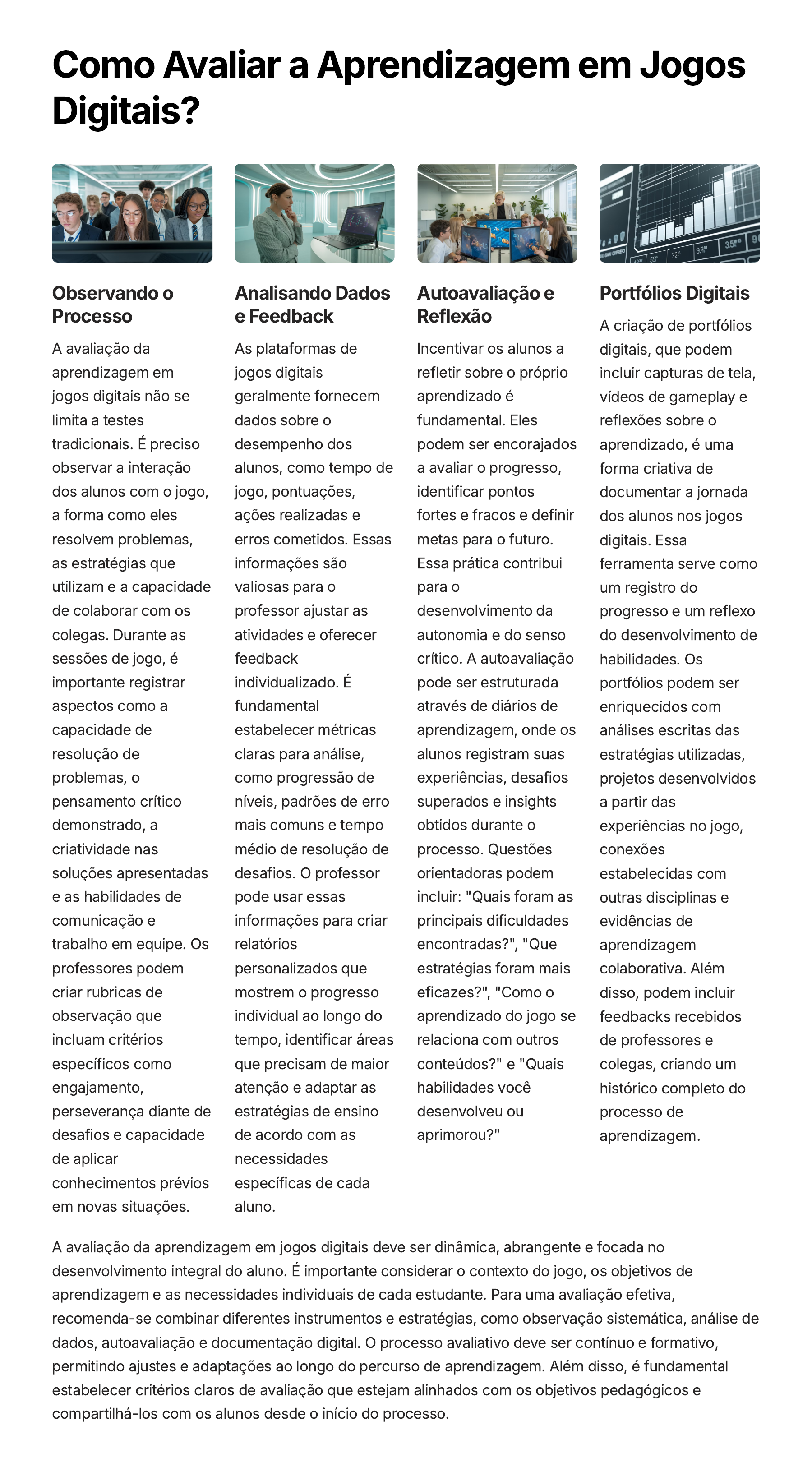 Como Avaliar a Aprendizagem em Jogos Digitais? Observando o Processo A avaliação da aprendizagem em jogos digitais não se limita a testes tradicionais. É preciso observar a interação dos alunos com o jogo, a forma como eles resolvem problemas, as estratégias que utilizam e a capacidade de colaborar com os colegas. Durante as sessões de jogo, é importante registrar aspectos como a capacidade de resolução de problemas, o pensamento crítico demonstrado, a criatividade nas soluções apresentadas e as habilidades de comunicação e trabalho em equipe. Os professores podem criar rubricas de observação que incluam critérios específicos como engajamento, perseverança diante de desafios e capacidade de aplicar conhecimentos prévios em novas situações. Analisando Dados e Feedback As plataformas de jogos digitais geralmente fornecem dados sobre o desempenho dos alunos, como tempo de jogo, pontuações, ações realizadas e erros cometidos. Essas informações são valiosas para o professor ajustar as atividades e oferecer feedback individualizado. É fundamental estabelecer métricas claras para análise, como progressão de níveis, padrões de erro mais comuns e tempo médio de resolução de desafios. O professor pode usar essas informações para criar relatórios personalizados que mostrem o progresso individual ao longo do tempo, identificar áreas que precisam de maior atenção e adaptar as estratégias de ensino de acordo com as necessidades específicas de cada aluno. Autoavaliação e Reflexão Incentivar os alunos a refletir sobre o próprio aprendizado é fundamental. Eles podem ser encorajados a avaliar o progresso, identificar pontos fortes e fracos e definir metas para o futuro. Essa prática contribui para o desenvolvimento da autonomia e do senso crítico. A autoavaliação pode ser estruturada através de diários de aprendizagem, onde os alunos registram suas experiências, desafios superados e insights obtidos durante o processo. Questões orientadoras podem incluir: "Quais foram as principais dificuldades encontradas?", "Que estratégias foram mais eficazes?", "Como o aprendizado do jogo se relaciona com outros conteúdos?" e "Quais habilidades você desenvolveu ou aprimorou?" Portfólios Digitais A criação de portfólios digitais, que podem incluir capturas de tela, vídeos de gameplay e reflexões sobre o aprendizado, é uma forma criativa de documentar a jornada dos alunos nos jogos digitais. Essa ferramenta serve como um registro do progresso e um reflexo do desenvolvimento de habilidades. Os portfólios podem ser enriquecidos com análises escritas das estratégias utilizadas, projetos desenvolvidos a partir das experiências no jogo, conexões estabelecidas com outras disciplinas e evidências de aprendizagem colaborativa. Além disso, podem incluir feedbacks recebidos de professores e colegas, criando um histórico completo do processo de aprendizagem. A avaliação da aprendizagem em jogos digitais deve ser dinâmica, abrangente e focada no desenvolvimento integral do aluno. É importante considerar o contexto do jogo, os objetivos de aprendizagem e as necessidades individuais de cada estudante. Para uma avaliação efetiva, recomenda-se combinar diferentes instrumentos e estratégias, como observação sistemática, análise de dados, autoavaliação e documentação digital. O processo avaliativo deve ser contínuo e formativo, permitindo ajustes e adaptações ao longo do percurso de aprendizagem. Além disso, é fundamental estabelecer critérios claros de avaliação que estejam alinhados com os objetivos pedagógicos e compartilhá-los com os alunos desde o início do processo.