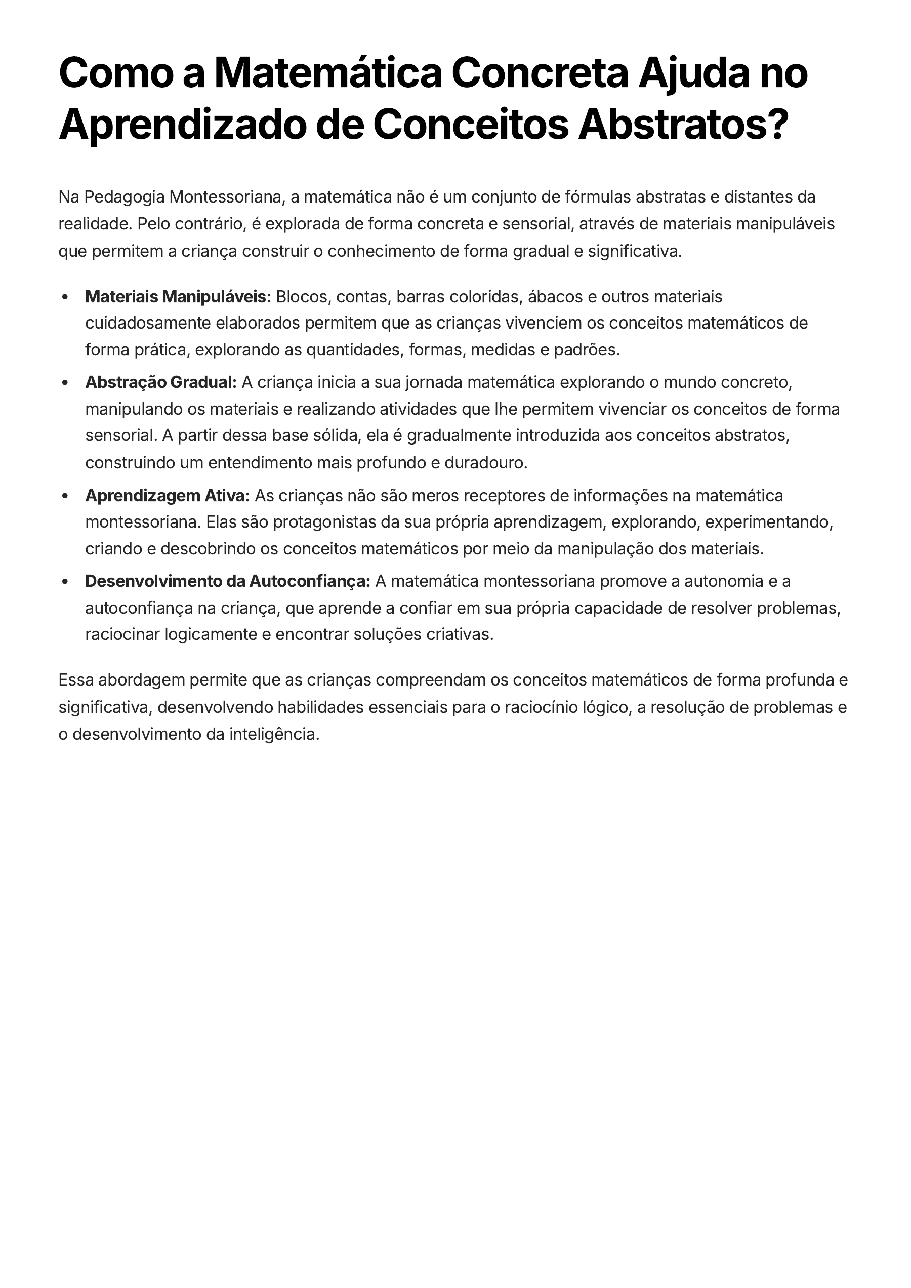 Como a Matemática Concreta Ajuda no Aprendizado de Conceitos Abstratos? Na Pedagogia Montessoriana, a matemática não é um conjunto de fórmulas abstratas e distantes da realidade. Pelo contrário, é explorada de forma concreta e sensorial, através de materiais manipuláveis que permitem a criança construir o conhecimento de forma gradual e significativa. Materiais Manipuláveis: Blocos, contas, barras coloridas, ábacos e outros materiais cuidadosamente elaborados permitem que as crianças vivenciem os conceitos matemáticos de forma prática, explorando as quantidades, formas, medidas e padrões. Abstração Gradual: A criança inicia a sua jornada matemática explorando o mundo concreto, manipulando os materiais e realizando atividades que lhe permitem vivenciar os conceitos de forma sensorial. A partir dessa base sólida, ela é gradualmente introduzida aos conceitos abstratos, construindo um entendimento mais profundo e duradouro. Aprendizagem Ativa: As crianças não são meros receptores de informações na matemática montessoriana. Elas são protagonistas da sua própria aprendizagem, explorando, experimentando, criando e descobrindo os conceitos matemáticos por meio da manipulação dos materiais. Desenvolvimento da Autoconfiança: A matemática montessoriana promove a autonomia e a autoconfiança na criança, que aprende a confiar em sua própria capacidade de resolver problemas, raciocinar logicamente e encontrar soluções criativas. Essa abordagem permite que as crianças compreendam os conceitos matemáticos de forma profunda e significativa, desenvolvendo habilidades essenciais para o raciocínio lógico, a resolução de problemas e o desenvolvimento da inteligência. Como a Educação Cósmica Integra Todo o Conhecimento? A Educação Cósmica, um pilar fundamental da Pedagogia Montessoriana, promove uma visão holística do conhecimento, conectando o indivíduo ao universo de forma integrada e significativa. Essa abordagem abrange a história da humanidade, a evolução da vida na Terra, os sistemas planetários e as leis que regem o cosmos, despertando a curiosidade e a compreensão da criança sobre seu lugar no mundo. A Educação Cósmica não se limita à memorização de fatos, mas incentiva a criança a investigar, questionar e buscar respostas para suas próprias indagações. Através de atividades práticas, jogos, pesquisas e observações, a criança desenvolve a capacidade de pensar criticamente, solucionar problemas e construir seu próprio conhecimento. Através da Educação Cósmica, a criança compreende que tudo no universo está interligado e que o conhecimento é um processo contínuo de descoberta. Essa abordagem promove a consciência ambiental, o respeito pela vida e a busca por soluções para os desafios globais, fomentando uma mentalidade crítica e transformadora nas crianças. Como preparamos nossos alunos para a vida através da autonomia e independência? A pedagogia Montessori enfatiza a importância da preparação para a vida, cultivando a autonomia e independência em cada criança. Essa preparação permeia todo o processo educativo, preparando os alunos para os desafios e responsabilidades da vida adulta. As escolas Montessori oferecem um ambiente estruturado e propício à autogestão, permitindo que as crianças desenvolvam habilidades essenciais para a vida, como: Organização e planejamento Tomada de decisões e resolução de problemas Autodisciplina e responsabilidade Comunicação assertiva e trabalho em equipe Criatividade e iniciativa pessoal Através de atividades práticas e desafiadoras, as crianças aprendem a se auto-servir, cuidando de seus materiais, organizando seu espaço de trabalho e assumindo responsabilidades por suas ações. Essa experiência de independência e autoconfiança assegura que os alunos se tornem indivíduos capazes de enfrentar os desafios do futuro, buscando soluções e realizando seus objetivos com segurança e criatividade. Como a escola prepara os alunos para outros níveis de ensino? A Escola Montessoriana, ao preparar seus alunos para a vida, também os prepara para transições suaves e enriquecedoras para outros níveis de ensino. A filosofia montessoriana enfatiza a autonomia e a autoconfiança, preparando os alunos para os desafios de novos ambientes educacionais. Essa preparação se manifesta através do desenvolvimento de habilidades essenciais, como a capacidade de aprendizado independente, a organização, a comunicação e a colaboração, que são fundamentais para o sucesso em qualquer contexto escolar. A transição para o ensino fundamental, por exemplo, é facilitada pela experiência de aprendizado autônomo e centrado no aluno que a criança vivencia na escola montessoriana. O desenvolvimento da capacidade de autogestão e da busca por conhecimento, além do domínio das ferramentas básicas de aprendizado, como a leitura, escrita e matemática, proporciona uma base sólida para a continuidade da educação. A familiaridade com diferentes métodos de aprendizagem e a capacidade de se adaptar a novos ambientes tornam a transição para o ensino fundamental mais natural e menos desafiadora. A escola montessoriana também se destaca na preparação dos alunos para a vida após o ensino fundamental, seja para o ensino médio, para o mercado de trabalho ou para a vida universitária. A ênfase em habilidades socioemocionais e no desenvolvimento da autonomia garante que os alunos estejam preparados para enfrentar os desafios do futuro com confiança e capacidade de adaptação. O foco em habilidades essenciais, como a comunicação, o trabalho em equipe e a resolução de problemas, é crucial para o sucesso em qualquer etapa da vida. Para garantir uma transição suave e exitosa, a Escola Montessoriana realiza um acompanhamento personalizado de cada aluno durante todo o processo, incluindo a comunicação com as instituições de ensino que os receberão. A escola tamb