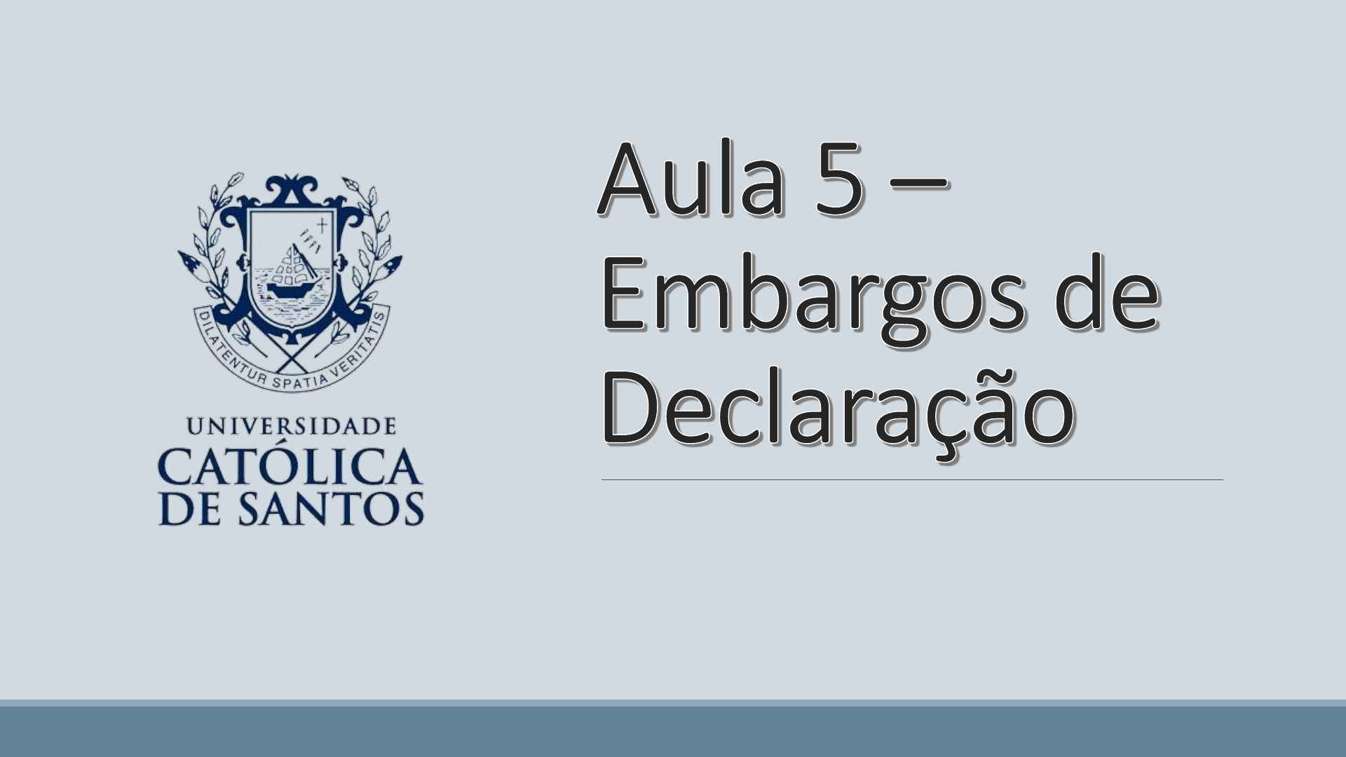 Aula 5 – Embargos de Declaração PROF ME. GABRIEL D IOGO UNIVERS IDADE CATÓLICA DE SANTOS PRÁTICA TRABALHISTA Com base no enunciado do caso 5, suponha que a sentença proferida tenha sido de parcial procedência pela condenação da Reclamada em arcar com as verbas rescisórias diante do reconhecimento do vínculo empregatício, bem como, fixado os honorários sucumbenciais em favor do patrono da Reclamante. Contudo, durante a tramitação dos autos, o Reclamante apresentou pedido de gratuidade de justiça diante da alteração de sua condição financeira, apresentando inclusive documentos de gastos médicos e comprovação de situação de desemprego. Ocorre que no momento da prolação da sentença, não houve qualquer passagem pelo Magistrado quanto a concessão ou não da gratuidade de justiça, constatando-se evidente omissão. No caso em tela, apresente a medida judicial cabível em representação do Reclamante para sanar a omissão da sentença quanto a apreciação da gratuidade de justiça. Apresentação do Caso Alexandre Dias ingressou com Reclamação Trabalhista em face da empresa Frutas Docinhas ME, em razão da rescisão do vínculo laborativo sem justa causa. Alexandre exercia a função de vendedor de frutas no local, laborando em 44 horas semanais e percebendo um valor de R$ 1.800,00 (hum mil e oitocentos reais) pagos mensalmente em dinheiro com recibo pela empresa. Dentre a fundamentação da Reclamação Trabalhista apresentada, Alexandre objetiva o reconhecimento do vínculo empregatício com a devida anotação de entrada e saída da empresa em CTPS, o recolhimento das contribuições previdenciárias que não teriam sido pagas, indenização referente ao seguro-desemprego, e ainda, o depósito do FGTS com a indenização de 40% em conta vinculada. Enunciado do Caso 5 A empresa Reclamada apresentou contestação apontando preliminar de incompetência da Justiça do Trabalho, posto que a relação seria da esfera cível por Alexandre ser um prestador de serviços fora do vínculo empregatício. Quanto ao mérito da defesa em si, alega que não há existência de vínculo empregatício, justamente pela autonomia de Alexandre e a ausência de subordinação na função. Ouvida as partes em audiência, ficou constatado que de fato existia requisito de subordinação, através do depoimento fidedigno das testemunhas arroladas. A ação tramitou em Itapecerica da Serra, na Primeira Vara. Com base nas informações apresentadas, na condição de Juiz do Trabalho da 1ª Vara de Itapecerica da Serra, prolate a sentença do caso descrito. Enunciado do Caso 5 ➢ Estamos diante de uma hipótese recursal que difere de outros de sua categoria; ➢O embargos de declaração tem como objeto não alcançar a reforma do mérito, mas esclarecer determinado ponto da decisão embargada que não restou clara; ➢ Buscamos a fundamentação no art. 897-A da CLT, cujo objeto será: A) omissão, obscuridade ou contradição do julgado (trata-se do chamado efeito integrativo ou completivo, que tem por finalidade trazer maior clareza à decisão); B) quando houver denegação de recurso por manifesto equívoco no exame dos pressupostos recursais objetivos/extrínsecos, i.e., nos requisitos da tempestividade, preparo, regularidade formal e adequação; C) Para correção de erro material da decisão; Embargos de Declaração ➢ Também é utilizado para fins de prequestionamento; Súmula 297 do TST - Incumbe à parte interessada, desde que a matéria haja sido invocada no recurso principal, opor embargos declaratórios objetivando o pronunciamento sobre o tema, sob pena de preclusão; ➢ É importante ressaltar que os embargos cabem tanto de sentença quanto de acórdão. Com relação às decisões interlocutórias, há dúvidas doutrinárias, mas entendimento predominante é no sentido de seu cabimento – especialmente diante da redação do art. 1.022 do CPC, que menciona seu cabimento contra “qualquer decisão judicial”. Embargos de Declaração Art. 897-A Caberão embargos de declaração da sentença ou acórdão, no prazo de cinco dias, devendo seu julgamento ocorrer na primeira audiência ou sessão subseqüente a sua apresentação, registrado na certidão, admitido efeito modificativo da decisão nos casos de omissão e contradição no julgado e manifesto equívoco no exame dos pressupostos extrínsecos do recurso. § 1o Os erros materiais poderão ser corrigidos de ofício ou a requerimento de qualquer das partes § 2o Eventual efeito modificativo dos embargos de declaração somente poderá ocorrer em virtude da correção de vício na decisão embargada e desde que ouvida a parte contrária, no prazo de 5 (cinco) dias § 3o Os embargos de declaração interrompem o prazo para interposição de outros recursos, por qualquer das partes, salvo quando intempestivos, irregular a representação da parte ou ausente a sua assinatura. Embargos de Declaração 1. COMPETÊNCIA - Diferentemente dos demais recursos, os embargos de declaração são apresentados em uma única peça, dirigida ao juízo prolator da decisão. Como regra geral, não haverá abertura de prazo para a parte contrária se manifestar (salvo efeito modificativo), e o próprio julgador acolherá ou não os embargos; 2. PREPARO E PRAZO – Não há preparo (art. 1.023, caput, CPC) e o prazo será de 5 dias salvo no caso que o embargante ser PJ de direito público em que será em dobro (OJ 192 TST); Requisitos formais ➢ Deve ser feito direcionado ao juízo que tramita a demanda; ➢ Por ser uma peça durante a tramitação dos autos, já sabemos para qual juízo a peça será direcionada; ➢ Devemos observar a localidade de competência daquele juízo; ➢ Vejamos o exemplo: Excelentíssimo Senhor Doutor Juiz do Trabalho da 1a Vara do Trabalho de Itapecerica da Serra Endereçamento ➢ Considerando que os autos já estão tramitando, não haverá necessidade de qualificar nenhuma das partes, mas lembrand