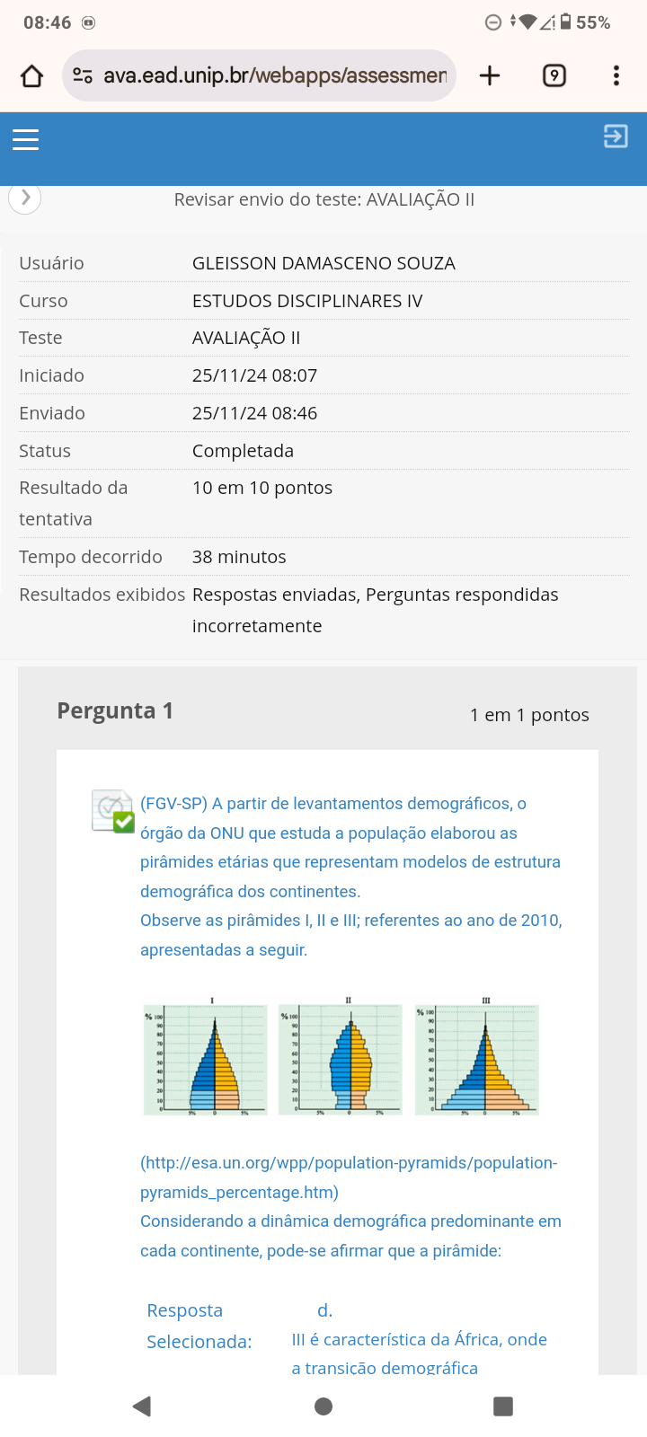 08:46 Li 55% ava.ead.unip.br/webapps/assessmen + 9 > Revisar envio do teste: AVALIAÇÃO Usuário GLEISSON DAMASCENO SOUZA Curso ESTUDOS DISCIPLINARES IV Teste AVALIAÇÃO Iniciado 25/11/24 08:07 Enviado 25/11/24 08:46 Status Completada Resultado da 10 em 10 pontos tentativa Tempo decorrido 38 minutos Resultados exibidos Respostas enviadas, Perguntas respondidas incorretamente Pergunta 1 1 em 1 pontos (FGV-SP) A partir de levantamentos demográficos, órgão da ONU que estuda a população elaborou as pirâmides etárias que representam modelos de estrutura demográfica dos continentes. Observe as pirâmides I, e III; referentes ao ano de 2010, apresentadas a seguir III % % 100 % (http://esa.un.org/wpp/population-pyramids/population pyramids_percentage.htm) Considerando a dinâmica demográfica predominante em cada continente, pode-se afirmar que a pirâmide: Resposta d. Selecionada: III é característica da África, onde a demográfica