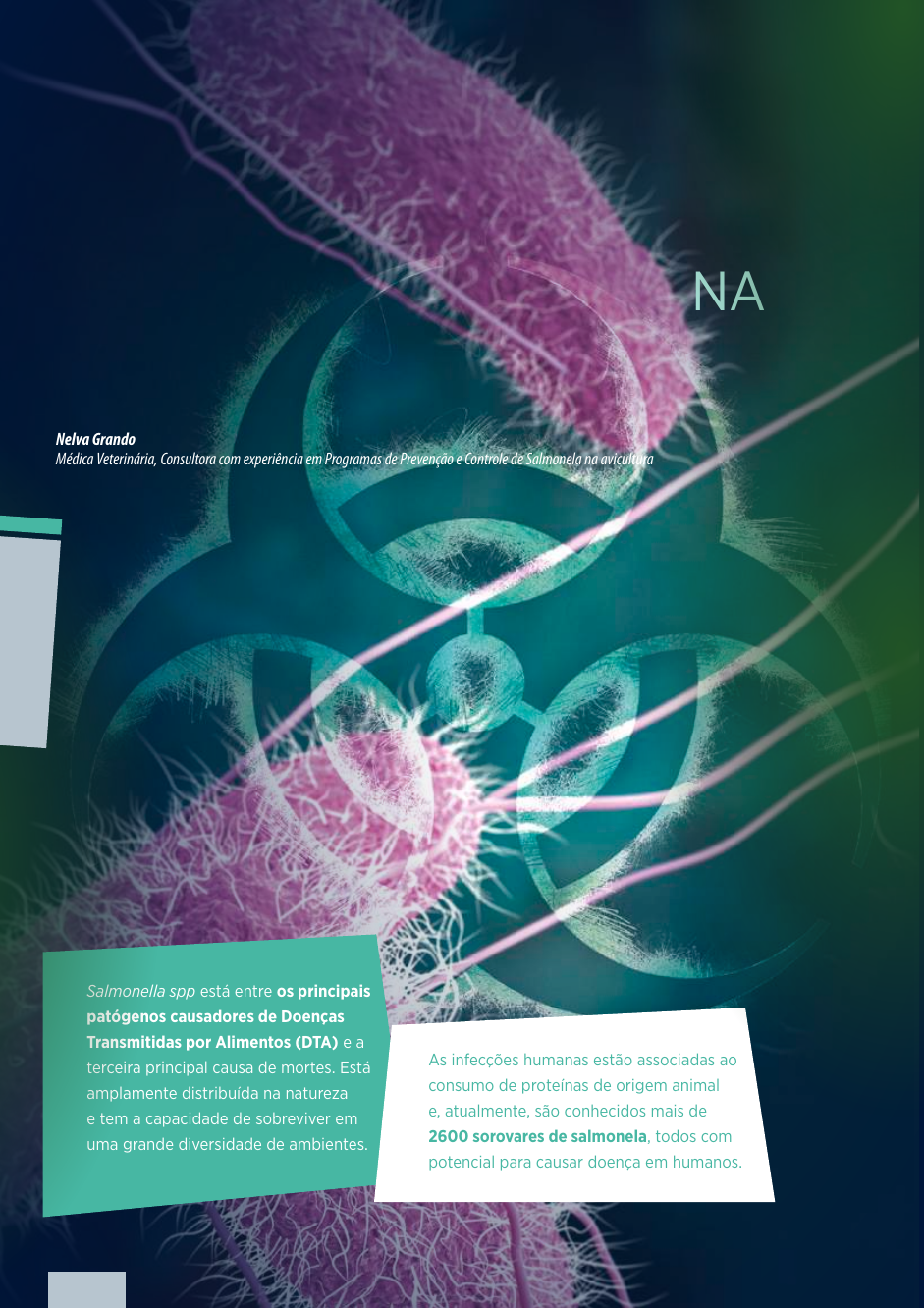 <p>NA</p><p>Nelva Grando</p><p>Médica Veterinária, Consultora com experiência em Programas de Prevenção e Controle de Salmonela na avicultura</p><p>Salmonella spp está entre os principais</p><p>patógenos causadores de Doenças</p><p>Transmitidas por Alimentos (DTA) e a</p><p>terceira principal causa de mortes. Está</p><p>amplamente distribuída na natureza</p><p>e tem a capacidade de sobreviver em</p><p>uma grande diversidade de ambientes.</p><p>As infecções humanas estão associadas ao</p><p>consumo de proteínas de origem animal</p><p>e, atualmente, são conhecidos mais de</p><p>2600 sorovares de salmonela, todos com</p><p>potencial para causar doença em humanos.</p><p>SALMONELA E</p><p>BIOSSEGURIDADE</p><p>PRODUÇÃO AVÍCOLA</p><p>6</p><p>bi</p><p>os</p><p>se</p><p>gu</p><p>ri</p><p>da</p><p>de</p><p>aviNews Brasil Julho 2021 | Salmonela e Biosseguridade na Produção AvícolaaviNews Brasil Julho 2021 | Salmonela e Biosseguridade na Produção Avícola</p><p>O indicador de higiene de</p><p>processo amplamente utilizado</p><p>pelos organismos brasileiros e</p><p>internacionais é a presença de</p><p>salmonela em carcaças de aves.</p><p>A entrada de salmonela no</p><p>abatedouro se dá através</p><p>de aves encaminhadas ao abate e, no</p><p>presente momento, não se conhece</p><p>medidas que sejam eficazes em</p><p>reduzir, ou eliminar completamente a</p><p>salmonela no abatedouro.</p><p>Portanto, compreender a epidemiologia</p><p>dos sorovares é fundamental para</p><p>controlar e minimizar os impactos que</p><p>ela causa, e estabelecer as medidas de</p><p>mitigação.</p><p>Estas precisam ser implantadas</p><p>em toda a cadeia produtiva, para</p><p>que consigamos reduzir os níveis</p><p>de contaminação e enviar ao</p><p>abatedouro aves com ausência de</p><p>salmonela, ou com baixíssima carga</p><p>e, assim, ter o produto final dentro</p><p>dos requisitos mínimos exigidos.</p><p>PRESENÇA EM CARCAÇAS DE AVES</p><p>Porém, os mais comumente</p><p>evidenciados são os sorovares:</p><p>Salmonella Thyphimurium e</p><p>Salmonella Enteritidis.</p><p>Salmonela é um patógeno que tem</p><p>implicações além da saúde pública,</p><p>causando também perdas</p><p>econômicas devido às</p><p>restrições de comércio.</p><p>BIOSSEGURIDADE</p><p>PRODUÇÃO AVÍCOLA</p><p>7</p><p>bi</p><p>os</p><p>se</p><p>gu</p><p>ri</p><p>da</p><p>de</p><p>aviNews Brasil Julho 2021 | Salmonela e Biosseguridade na Produção Avícola</p><p>As medidas de mitigação para</p><p>o risco salmonela devem ser</p><p>implementadas na cadeia de</p><p>produção de aves, iniciando-se</p><p>no nível hierárquico mais elevado,</p><p>até o abatedouro, controles esses</p><p>comumente chamados de “da granja</p><p>à mesa”.</p><p>Sabe-se que fatores ambientais</p><p>oferecem oportunidades para</p><p>a sobrevivência de salmonelas</p><p>e, consequentemente, facilitam</p><p>a sua transmissão. Algumas</p><p>salmonelas sobrevivem por muito</p><p>tempo fora dos hospedeiros</p><p>MEDIDAS DE MITIGAÇÃO</p><p>GENÉTICA ABATE ALMAZENAMENTO CONSUMO</p><p>ALIMENTAÇÃO</p><p>BIOSSEGURIDADE</p><p>BEM-ESTAR</p><p>RASTREABILIDADE</p><p>TRANSPORTE PROCESSAMENTO DISTRIBUÇÃO</p><p>BOAS PRÁCTICAS DE PRODUÇÃO</p><p>PROPRIEDADE RURAL AGROINDÚSTRIA CONSUMIDOR</p><p>BOAS PRÁCTICAS DE PRODUÇÃO</p><p>CONTAMINATED</p><p>MATERIALS</p><p>ESTIMATED</p><p>SURVIVAL TIME, d</p><p>REFERENCE 1</p><p>Cloth 228 Blackman et. al [23]</p><p>Dried cattle feces ≥1,000 Blackman et. al [23]</p><p>Dried rosemary 203 Amel and Anima [104]</p><p>Dried whole egg ≥4 Blackman et. al [23]</p><p>Earth and pasture 200 Blackman et. al [23]</p><p>Eggshells >365 Danyluk et el. [105]</p><p>Fresh parsely 161 Aruscavage et. al [106]</p><p>Lettuce 63 Aruscavage et. al [106]</p><p>Plastic coverslips 93 Blackman et. al [23]</p><p>Poultry feces ≥9 Blackman et. al [23]</p><p>Poultry feed ≥98 Juven et. al [23]</p><p>Roach pellets 199 Blackman et. al [23]</p><p>Rodent feces 148 Blackman et. al [23]</p><p>Spray - dried milk ≥120 Aruscavage et. al [106]</p><p>Sweeper dust 300 Blackman et. al [23]</p><p>Tomatoes 49 Beckers et. al [108]</p><p>Wash and wear fabric ≥70 Wilkoff et. al [109]</p><p>8</p><p>bi</p><p>os</p><p>se</p><p>gu</p><p>ri</p><p>da</p><p>de</p><p>aviNews Brasil Julho 2021 | Salmonela e Biosseguridade na Produção Avícola</p><p>As salmonelas, de maneira geral,</p><p>têm uma diversidade de formas de</p><p>introdução em uma granja.</p><p>Sendo assim, as medidas para</p><p>prevenir a entrada e disseminação</p><p>devem ser conjuntas e uma</p><p>somatória.</p><p>Visando cada detalhe, com objetivo</p><p>claro e preciso de reduzir os níveis</p><p>de contaminação ambiental e,</p><p>consequentemente, nas aves.</p><p>FONTES DE CONTAMINAÇÃO</p><p>As principais fontes de contaminação</p><p>são:</p><p>ave de um dia,</p><p>ração,</p><p>água,</p><p>pessoas,</p><p>pragas (roedores, moscas,</p><p>cascudinhos) e</p><p>insumos para cama.</p><p>Identificadas as potenciais fontes de contaminação, se faz necessária a adoção de medidas</p><p>de mitigação para cada uma delas.</p><p>Estas medidas são chamadas de Programas de Boas Práticas de Produção e ou de</p><p>Biosseguridade</p><p>9</p><p>bi</p><p>os</p><p>se</p><p>gu</p><p>ri</p><p>da</p><p>de</p><p>aviNews Brasil Julho 2021 | Salmonela e Biosseguridade na Produção Avícola</p><p>BIOSSEGURIDADE</p><p>LIMPEZA E DESINFECÇÃO</p><p>A biosseguridade na avicultura tem</p><p>como objetivo:</p><p>A biosseguridade se faz através de</p><p>barreiras físicas (cercas, telas, pisos) e de</p><p>procedimentos como limpeza e desinfecção,</p><p>controle de pragas, controle de fluxo de</p><p>pessoas, veículos e equipamentos etc.</p><p>Umas das medidas de maior relevância</p><p>para reduzir a pressão de infecção é a</p><p>de limpeza e desinfecção. Procedimento</p><p>este aplicado aos veículos e materiais que</p><p>entram nas granjas, como também em</p><p>pessoas, onde 
