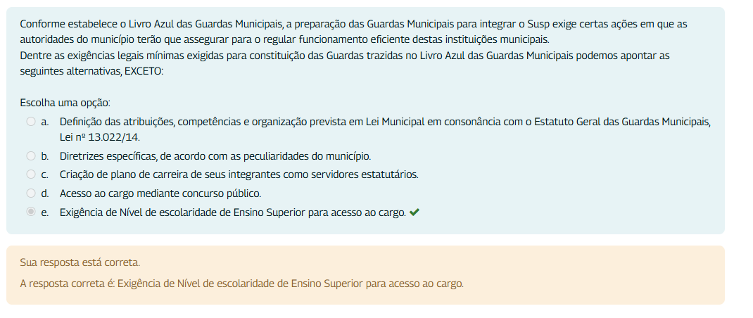 Conforme estabelece Livro Azul das Guardas Municipais, a preparação das Guardas Municipais para integrar o Susp exige certas ações em que as autoridades do município terão que assegurar para regular funcionamento eficiente destas instituições municipais. Dentre as exigências legais mínimas exigidas para constituição das Guardas trazidas no Livro Azul das Guardas Municipais podemos apontar as seguintes alternativas, EXCETO: Escolha uma opção: a. Definição das atribuições, competências e organização prevista em Lei Municipal em consonância com o Estatuto Geral das Guardas Municipais, Lei n° 13.022/14. b. Diretrizes específicas, de acordo com as peculiaridades do município. Criação de plano de carreira de seus integrantes como servidores d. Acesso ao cargo mediante concurso público e. Exigência de Nível de escolaridade de Ensino Superior para acesso ao cargo. Sua resposta está correta. A resposta correta Exigência de Nível de escolaridade de Ensino Superior para acesso ao cargo.