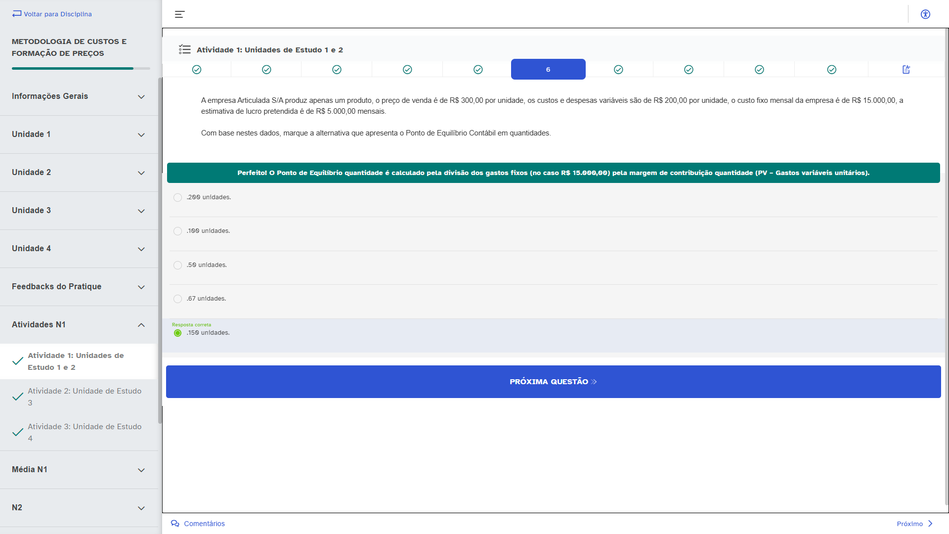 Voltar para Disciplina * METODOLOGIA DE CUSTOS E FORMAÇÃO DE PREÇOS Atividade 1: Unidades de Estudo 1 e 2 6 Informações Gerais A empresa Articulada S/A produz apenas um produto, o preço de venda é de R$ 300,00 por unidade, os custos e despesas variáveis são de por unidade, o custo fixo mensal da empresa é de R$ 15.000,00, a estimativa de lucro pretendida é de mensais. Unidade 1 Com base nestes dados, marque a alternativa que apresenta o Ponto de Equilíbrio Contábil em quantidades. Unidade 2 Perfeito! Ponto de quantidade é calculado pela divisão dos gastos fixos (no caso R$ 15.000,00) pela margem de contribuição quantidade (PV - Gastos variáveis unitários). Unidade 3 Unidade 4 .50 Feedbacks do Pratique .67 Atividades N1 Resposta correta .150 Atividade 1: Unidades de Estudo 1 e 2 PRÓXIMA QUESTÃO Atividade 2: Unidade de Estudo 3 Atividade 3: Unidade de Estudo 4 Média N1 N2 Comentários Próximo >