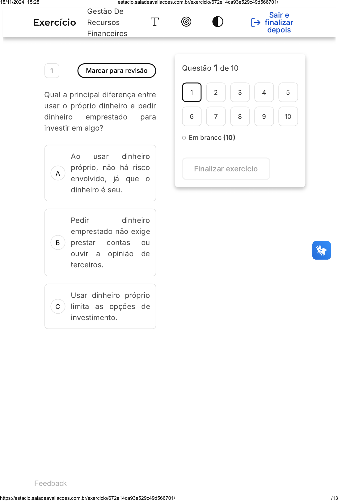 A B C 1 Marcar para revisão Qual a principal diferença entre usar o próprio dinheiro e pedir dinheiro emprestado para investir em algo? Ao usar dinheiro próprio, não há risco envolvido, já que o dinheiro é seu. Pedir dinheiro emprestado não exige prestar contas ou ouvir a opinião de terceiros. Usar dinheiro próprio limita as opções de investimento. Questão 1 de 10 Em branco �10� 1 2 3 4 5 6 7 8 9 10 Finalizar exercício Exercício Gestão De Recursos Financeiros Sair e finalizar depois Feedback 18/11/2024, 15:28 estacio.saladeavaliacoes.com.br/exercicio/672e14ca93e529c49d566701/ https://estacio.saladeavaliacoes.com.br/exercicio/672e14ca93e529c49d566701/ 1/13 D E A B C Pedir dinheiro emprestado aumenta a liberdade de escolha na tomada de decisões. Pedir dinheiro emprestado pode funcionar como uma orientação para evitar erros na tomada de decisões. 2 Marcar para revisão Existem diferentes tipos de investimentos que podem ser feitos. Cada um deles é mais adequado para determinada situação. Qual é a definição de investimento? Gastar dinheiro em bens de consumo duráveis. Comprar bens de consumo duráveis ou não. Guardar dinheiro em uma conta bancária. 18/11/2024, 15:28 estacio.saladeavaliacoes.com.br/exercicio/672e14ca93e529c49d566701/ https://estacio.saladeavaliacoes.com.br/exercicio/672e14ca93e529c49d566701/ 2/13 D E A B C D E Utilizar o dinheiro para gerar mais dinheiro no futuro. Tomar empréstimos para financiar projetos pessoais. 3 Marcar para revisão O valor a se pagar no futuro por um empréstimo feito hoje em um banco varia conforme: I � A taxa de juros; II � O tempo; III � O valor que se paga por mês. Está correto o que se afirma em: Apenas I Apenas II Apenas III I e III I, II e III 18/11/2024, 15:28 estacio.saladeavaliacoes.com.br/exercicio/672e14ca93e529c49d566701/ https://estacio.saladeavaliacoes.com.br/exercicio/672e14ca93e529c49d566701/ 3/13 A B C 4 Marcar para revisão Ao aceitar o dinheiro de terceiros, você concorda em cumprir as políticas de pagamento que regulamentam o reembolso do empréstimo. Qual é a importância de entender as políticas de pagamento ao pegar um empréstimo? Não é importante entender as políticas de pagamento, já que o dinheiro é seu para usar como quiser. As políticas de pagamento são irrelevantes, uma vez que o dinheiro deve ser devolvido de qualquer forma. É importante entender as políticas de pagamento, pois isso garante que você conseguirá pagar o empréstimo de acordo com as suas possibilidades. 18/11/2024, 15:28 estacio.saladeavaliacoes.com.br/exercicio/672e14ca93e529c49d566701/ https://estacio.saladeavaliacoes.com.br/exercicio/672e14ca93e529c49d566701/ 4/13 D E A B C As políticas de pagamento são importantes apenas para os bancos e outras entidades financeiras, não para os clientes. Não é necessário ler o contrato com atenção, já que as políticas de pagamento são sempre iguais em todos os empréstimos. 5 Marcar para revisão Existem diversas opções de investimentos. Qual das alternativas a seguir é uma forma de investimento que apresenta um risco alto para aqueles que não têm um conhecimento técnico profundo? Caderneta de poupança. CDB. Tesouro Direto 18/11/2024, 15:28 estacio.saladeavaliacoes.com.br/exercicio/672e14ca93e529c49d566701/ https://estacio.saladeavaliacoes.com.br/exercicio/672e14ca93e529c49d566701/ 5/13 D E A B C Títulos públicos. Ações. 6 Marcar para revisão Perdas no processo produtivo são muito comuns e devem ser registradas, a fim de se chegar a um cálculo correto de custos e despesas. Assinale a alternativa que se configura como uma perda. Ter um cano de água quebrado jorrando água até seu conserto. Usar um pouco de esmalte a mais, a fim de realizar um bom serviço de manicure. Passar alguns minutos a mais ensinando em sala de aula, para que todos entendam a matéria. 18/11/2024, 15:28 estacio.saladeavaliacoes.com.br/exercicio/672e14ca93e529c49d566701/ https://estacio.saladeavaliacoes.com.br/exercicio/672e14ca93e529c49d566701/ 6/13 D E A B C Gastar mais gasolina durante a entrega devido a um engarrafamento. Jogar fora a sobra de massa de pão que não pode ser aproveitada pela padaria durante a produção. 7 Marcar para revisão No Brasil Pré-colonial, as tribos não possuíam uma moeda única que permitisse que ambas pudessem mensurar sua mão de obra, custos de produção e despesas. Desse modo, quando precisavam adquirir produtos de outras tribos (tais como alimentos), essas tribos dependiam da troca. A troca de mercadorias que era realizada por elas tem o nome de: Auditoria. Escambo monetário. Compra e venda. 18/11/2024, 15:28 estacio.saladeavaliacoes.com.br/exercicio/672e14ca93e529c49d566701/ https://estacio.saladeavaliacoes.com.br/exercicio/672e14ca93e529c49d566701/ 7/13 D E A B Sistema único de troca. Escambo. 8 Marcar para revisão Qual é a maior diferença entre a taxa de juros e o prazo de pagamento? A taxa de juros se refere ao valor que uma pessoa receberá ao final do empréstimo, enquanto o prazo de pagamento se refere ao tempo que uma pessoa tem para pagar o empréstimo. A taxa de juros se refere a uma porcentagem que irá incidir sobre um valor emprestado, enquanto o prazo de pagamento se refere a um período, nunca maior do que 5 anos, que alguém possui para pagar o empréstimo. 18/11/2024, 15:28 estacio.saladeavaliacoes.com.br/exercicio/672e14ca93e529c49d566701/ https://estacio.saladeavaliacoes.com.br/exercicio/672e14ca93e529c49d566701/ 8/13 C D E A taxa de juros se refere a uma porcentagem que irá incidir sobre um valor emprestado, enquanto o prazo de pagamento se refere ao tempo que uma pessoa tem para pagar o empréstimo. O prazo de pagamento é o tempo que alguém tem para terminar de pagar um empréstimo, e a taxa de juros é uma porcentagem que sempre se altera com o tempo e que influenciará o valor enquanto alguém pagar um empréstimo. O prazo de pagamento é um valor final que o banco exige para quitar o emprést