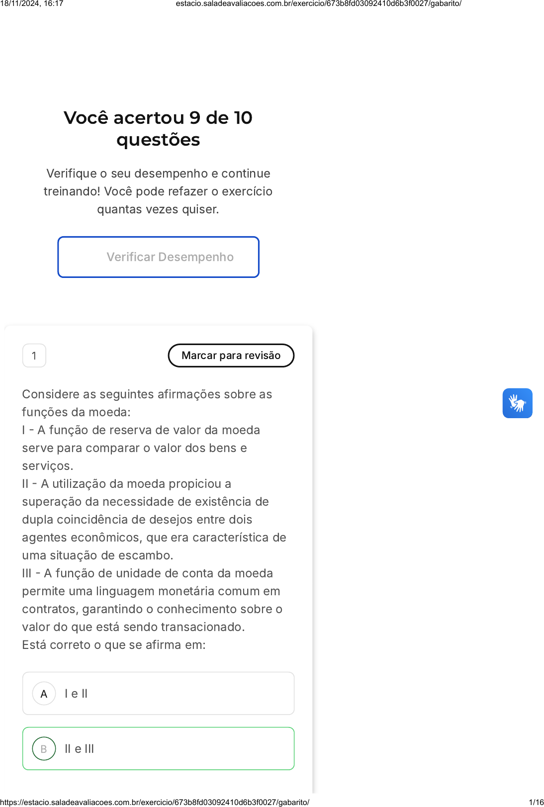 Você acertou 9 de 10 questões Verifique o seu desempenho e continue treinando! Você pode refazer o exercício quantas vezes quiser. Verificar Desempenho A B 1 Marcar para revisão Considere as seguintes afirmações sobre as funções da moeda: I � A função de reserva de valor da moeda serve para comparar o valor dos bens e serviços. II � A utilização da moeda propiciou a superação da necessidade de existência de dupla coincidência de desejos entre dois agentes econômicos, que era característica de uma situação de escambo. III � A função de unidade de conta da moeda permite uma linguagem monetária comum em contratos, garantindo o conhecimento sobre o valor do que está sendo transacionado. Está correto o que se afirma em: I e II II e III 18/11/2024, 16:17 estacio.saladeavaliacoes.com.br/exercicio/673b8fd03092410d6b3f0027/gabarito/ https://estacio.saladeavaliacoes.com.br/exercicio/673b8fd03092410d6b3f0027/gabarito/ 1/16 C D E Apenas III Apenas I I e III Resposta correta Parabéns, você selecionou a alternativa correta. Confira o gabarito comentado! Gabarito Comentado A afirmação I está incorreta. A função de reserva de valor da moeda não serve para comparar o valor dos bens e serviços, mas sim para manter o poder de compra ao longo do tempo. A função que permite comparar o valor de bens e serviços é a função de denominador comum monetário. A afirmação II está correta. A utilização da moeda realmente superou a necessidade de existência de dupla coincidência de desejos entre dois agentes econômicos, que era uma característica do escambo. Com a moeda, é possível realizar transações sem a necessidade de uma troca direta de bens ou serviços. A afirmação III também está correta. A função de unidade de conta da moeda permite uma linguagem monetária comum em contratos, garantindo o conhecimento sobre o valor do que está sendo transacionado. Isso facilita as negociações e dá segurança aos agentes econômicos. 18/11/2024, 16:17 estacio.saladeavaliacoes.com.br/exercicio/673b8fd03092410d6b3f0027/gabarito/ https://estacio.saladeavaliacoes.com.br/exercicio/673b8fd03092410d6b3f0027/gabarito/ 2/16 A B Portanto, as afirmações II e III estão corretas, o que corresponde à alternativa B. 2 Marcar para revisão Apesar de muitas vezes na linguagem coloquial os termos custos, gasto e despesas serem usados como sinônimos, para a contabilidade financeira existem diferenças cruciais entre esses conceitos. Qual a diferença entre gastos, custos, despesas e perdas em uma empresa? Gastos são as saídas de dinheiro relacionadas à produção do produto, custos são as saídas de dinheiro não diretamente ligadas à produção, despesas são as saídas de dinheiro ligadas à produção e perdas são as saídas de dinheiro inevitáveis na produção. Gastos são todas saídas de dinheiro da empresa, custos são as saídas de dinheiro diretamente ligadas à produção, despesas são as saídas de dinheiro não diretamente ligadas à produção e perdas são as saídas de dinheiro inevitáveis na produção. 18/11/2024, 16:17 estacio.saladeavaliacoes.com.br/exercicio/673b8fd03092410d6b3f0027/gabarito/ https://estacio.saladeavaliacoes.com.br/exercicio/673b8fd03092410d6b3f0027/gabarito/ 3/16 C D E Gastos são as saídas de dinheiro não diretamente ligadas à produção, custos são as saídas de dinheiro diretamente ligadas à produção, despesas são as saídas de dinheiro ligadas à produção e perdas são as saídas de dinheiro inevitáveis na produção. Gastos são as saídas de dinheiro não diretamente ligadas à produção, custos são as saídas de dinheiro não diretamente ligadas à produção, despesas são as saídas de dinheiro diretamente ligadas à produção e perdas são as saídas de dinheiro inevitáveis na produção. Gastos são as saídas de dinheiro ligadas à produção do produto, custos são as saídas de dinheiro diretamente ligadas à produção, despesas são as saídas de dinheiro não diretamente ligadas à produção e perdas são as saídas de dinheiro não inevitáveis na produção. Resposta correta Parabéns, você selecionou a alternativa correta. Confira o gabarito comentado! Gabarito Comentado Gastos - Toda saída de dinheiro da empresa. Custos - Toda saída de recursos financeiros que está diretamente ligada àExercicio Gestão De Recursos Financeiros Sair 18/11/2024, 16:17 estacio.saladeavaliacoes.com.br/exercicio/673b8fd03092410d6b3f0027/gabarito/ https://estacio.saladeavaliacoes.com.br/exercicio/673b8fd03092410d6b3f0027/gabarito/ 4/16 A B C D E produção de seu produto ou à prestação de serviço. Despesas - Toda saída de dinheiro que não está diretamente ligada à produção do bem ou à prestação de serviço. Perdas - são as saídas de dinheiro inevitáveis na produção. 3 Marcar para revisão O valor a se pagar no futuro por um empréstimo feito hoje em um banco varia conforme: I � A taxa de juros; II � O tempo; III � O valor que se paga por mês. Está correto o que se afirma em: Apenas I Apenas II Apenas III I e III I, II e III Resposta correta Parabéns, você selecionou a alternativa correta. Confira o gabarito comentado! Questão 5 de 10 Corretas �9� Incorretas �1� Em branco �0� 1 2 3 4 5 6 7 8 9 10 18/11/2024, 16:17 estacio.saladeavaliacoes.com.br/exercicio/673b8fd03092410d6b3f0027/gabarito/ https://estacio.saladeavaliacoes.com.br/exercicio/673b8fd03092410d6b3f0027/gabarito/ 5/16 A B C Gabarito Comentado As variáveis que influenciam o valor a ser pago no futuro por um empréstimo são a taxa de juros, o tempo de pagamento e o valor que se paga por mês. A taxa de juros é a porcentagem que o banco cobra sobre o valor emprestado. O tempo de pagamento é o período durante o qual o empréstimo será pago. E o valor que se paga por mês é a quantia que o tomador do empréstimo se compromete a pagar mensalmente. Portanto, todas as afirmações do enunciado estão corret