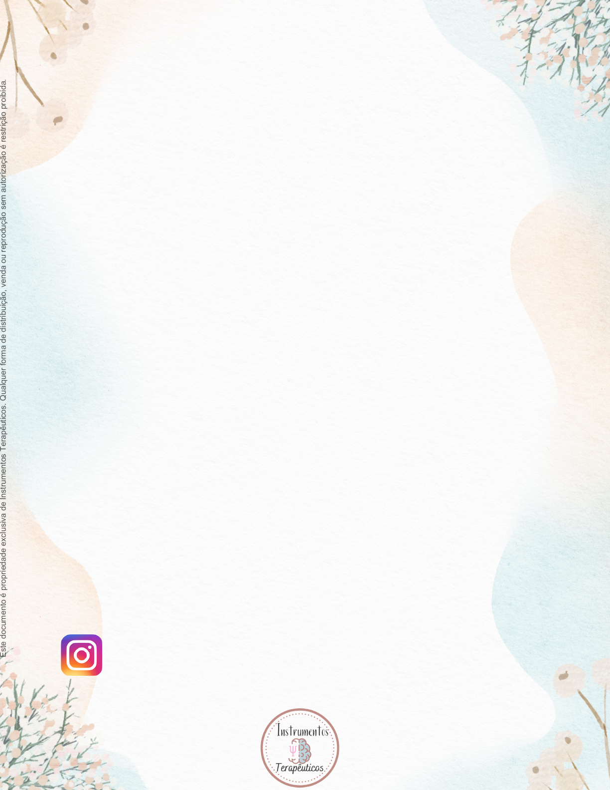 IMPORTANTE Está expressamente proibido a comercialização, reprodução total e parcial, compartilhamento dos arquivos com demais pessoas por meio de redes sociais (whatsapp, facebook, entre outros). Os direitos autorais da Instrumentos Terapêuticos estão expressamente instalados no material e constitui violação a esses direitos qualquer forma de utilização e exposição sem a autorização expressa ou citada/referenciada da marca. No mesmo sentido, caso violado os direitos autorais, este ato constituirá crime previsto no artigo 184 da lei 6.895/80, sujeitando-se ainda à busca e apreensão e indenizações de ordem material e moral, previsto na lei 9.610/98. @psi.instrumentosE st e do cu m en to é p ro pr ie da de e xc lu si va d e In st ru m en to s Te ra pê ut ic os . Q ua lq ue r f or m a de d is tri bu iç ão , v en da o u re pr od uç ão s em a ut or iz aç ão é re st riç ão p ro ib id a.