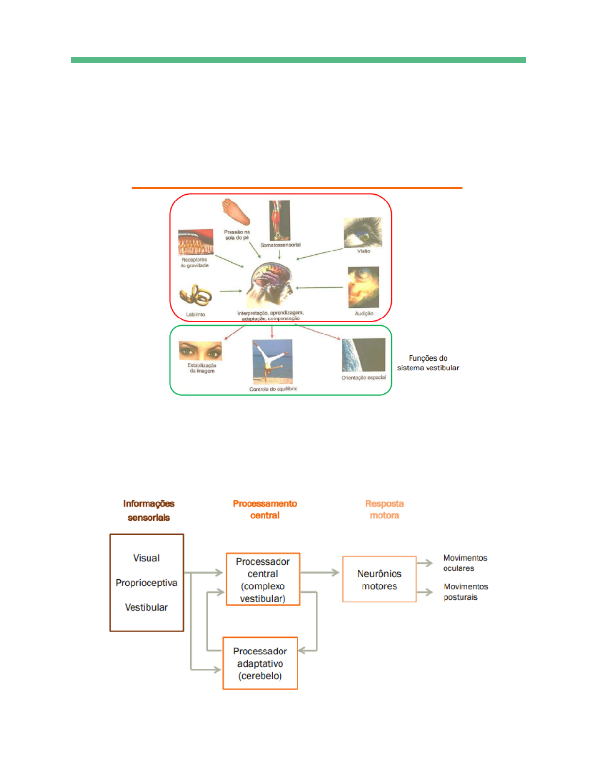 Avaliação e Reabilitação vestibular Anatomofisiologia Vestibular Manutenção do equilíbrio ● Depende de informações visuais, proprioceptivas e vestibulares. Visual ● A visão auxilia na orientação espacial ● Movimentos vestibulo-oculares: quando o indivíduo se move ● Movimentos optocinéticos: quando o mundo externo se move (ex: ônibus em movimento, quando nos movimentamos vendo algo parado…) Proprioceptivo ● Responde às alterações de posição do corpo; ● Controla a atividade muscular para respostas a mudanças no ambiente ou pela vontade do indivíduo; ● Os músculos do pescoço são sensíveis aos movimentos da cabeça em relação ao tronco. Sistema Vestibular Periférico ● Localizado dentro do osso temporal —- orelha interna ● Estrutura óssea: Labirinto ósseo ● Estrutura membranosa: Labirinto membranoso ● Entre Labirinto Ósseo e Membranoso: Perilinfa ● Preenche o Labirinto Membranoso: Endolinfa ● Duas unidades anatômicas e funcionais: ➔ Canais semicirculares (anterior/superior, posterior/inferior e lateral/horizontal) ★ Equilíbrio dinâmico (movimentação de cabeça) ★ 3 cristas (dentro da cúpula da ampola) ➔ Órgãos otolíticos (utrículo e sáculo) ★ Equilíbrio estático (aceleração linear e postural e força gravitacional) ★ 2 máculas ● Cinco receptores sensoriais presentes nos CSCs e nos órgãos otolíticos: ➔ Canais semicirculares – 3 cristas (dentro da cúpula da ampola) ➔ Órgãos otolíticos (utrículo e sáculo) – 2 máculas Canais semicirculares ● 3 canais: ➔ lateral/horizontal ➔ anterior/superior ➔ Posterior/inferior ● Os canais semicirculares abrangem os 3 planos espaciais e trabalham em pares sinérgicos bilateralmente. (Cada par sinérgico passa informação de um plano espacial) ➔ CSC lateral direito – CSC lateral esquerdo ➔ CSC posterior direito – CSC anterior esquerdo ➔ CSC anterior direito – CSC posterior esquerdo ● Em cada canal existe uma dilatação terminal chamada ampola ● Crista ampular - composta por células ciliadas sensoriais ● Cílios mergulhados em massa gelatinosa formando a cúpula da crista ampular Vestíbulo - órgãos otolíticos ● 2 órgãos: sáculo (vertical) e utrículo (horizontal) ● Em cada um deles existe uma mácula, na qual estão as células ciliadas ● Cílios mergulhados em massa gelatinosa chamada de membrana otolítica ● Na membrana otolítica também estão os cristais de carbonato de cálcio denominados otocônias ou otólitos Canais semicirculares VS órgãos otolíticos CSCs Órgãos otolíticos Ampola Mácula Cúpula Membrana otolítica Crista ampular — Células ciliadas Células ciliadas Endolinfa Otólitos (obs: não tem endolinfa dentro da mácula Células ciliadas ● Presentes na crista ampular dos CSCs e na mácula dos órgãos otolíticos ● Possui diversos estereocílios organizados em relação ao seu tamanho, em ordem crescente, na direção de um único cinocílio ● Importantes para o envio de sinais para o SNC - inervadas por fibras do nervo vestibular - converte estímulo mecânico em impulso neural ● Despolariza quando um movimento angular, aceleração linear ou movimento gravitacional gera movimento da endolinfa na direção ao feixe de cílios ➔ Deflexão dos estereocílios em direção ao cinocílio promove a despolarização/estimulação ➔ Deflexão dos estereocílios em direção ao cinocílio promove a despolarização/estimulação Sistema Nervoso ● VIII par craniano – nervo vestíbulo-coclear ● 4 núcleos vestibulares: ➔ NV superior ➔ NV medial ➔ NV lateral ➔ NV inferior ● Quatro núcleos vestibulares de cada lado do tronco encefálico (IV ventrículo): ➔ Núcleo vestibular superior e núcleo vestibular medial: ★ Envia informações para que ocorram movimentos de correção dos olhos e para o posicionamento adequado de cabeça e pescoço ➔ Núcleo vestibular lateral: ★ Envia informações para o posicionamento corporal adequado ➔ Núcleo vestibular inferior: ★ Envia informações para o cerebelo e formação reticular ● Cerebelo: Importante no controle de movimentos (como fixação e perseguição) ● Formação Reticular ➔ Conjunto de células e fibras nervosas espalhadas pelo tronco encefálico. ➔ Interliga sistemas e recebe informações sensoriais promovendo alertas ou bloqueando no SNC. ➔ Importante no processo de correção de movimentos oculares. Funcionamento dos canais semicirculares ● Captam a aceleração angular da cabeça ➔ CSC lateral/horizontal: rotação da cabeça para direita ou esquerda ➔ CSC anterior/superior: movimentação da cabeça para cima e para baixo ➔ CSC posterior: movimentação da cabeça para cima e para baixo ● Movimentos da cabeça movimentam a endolinfa ● Corrente endolinfática ➔ Em direção à ampola: ampulípeta – cúpula em direção ao utrículo ➔ Em direção oposto à ampola: ampulífuga – cúpula em direção ao CSC ● CSCs laterais: corrente ampulípeta é excitatória (despolarização) ● CSCs verticais: corrente ampulífuga é excitatória (despolarização) Funcionamento dos órgãos otolíticos ● Captam a aceleração linear da cabeça ➔ Utrículo: mácula na posição horizontal, sensível a movimentos no plano horizontal ➔ Sáculo: mácula na posição vertical, sensível a aceleração vertical ● Mudanças na posição da cabeça e movimentos com aceleração linear movimentos dos otólitos sobre a camada gelatinosa, com consequente inclinação dos cílios Vias vestibulares ● Vias vestibulares centrais: ➔ Reflexo vestíbulo-ocular (RVO) ➔ Reflexo vestíbulo-espinal (RVE) ● Outros… ➔ Reflexo vestibulocólico ➔ Reflexo cervicólico ➔ Reflexo cérvico-ocular ➔ Reflexo cérvicoespinal Reflexo vestibulo-ocular ● Responsável por estabilizar a imagem na retina durante movimentos rápidos da cabeça. ● Desencadeia movimentos oculares na mesma veloc