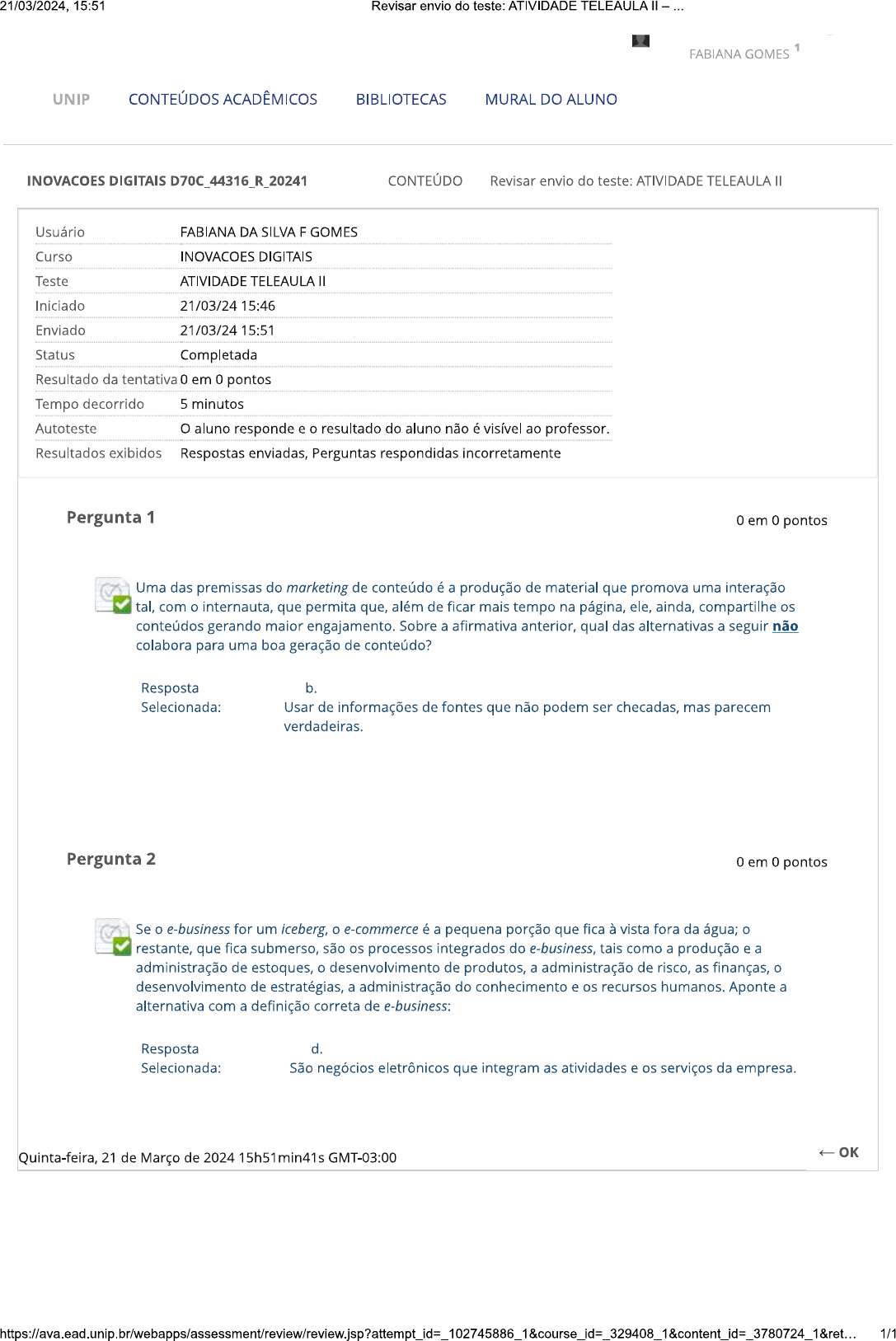 <p>21/03/2024, 15:51 Revisar envio do teste: ATIVIDADE TELEAULA UNIP CONTEÚDOS ACADÊMICOS BIBLIOTECAS MURAL DO ALUNO INOVACOES DIGITAIS D70C_44316_R_20241 CONTEÚDO Revisar envio do teste: ATIVIDADE TELEAULA Usuário Curso INOVACOES DIGITAIS Teste ATIVIDADE TELEAULA Iniciado 21/03/24 15:46 Enviado 21/03/24 15:51 Status Completada Resultado da tentativa 0 em 0 pontos Tempo decorrido 5 minutos Autoteste O aluno responde e o resultado do aluno não é visível ao professor. Resultados exibidos Respostas enviadas, Perguntas respondidas incorretamente Pergunta 1 0 em 0 pontos Uma das premissas do marketing de conteúdo é a produção de material que promova uma interação tal, com o internauta, que permita que, além de ficar mais tempo na página, ele, ainda, compartilhe os conteúdos gerando maior engajamento. Sobre a afirmativa anterior, qual das alternativas a seguir não colabora para uma boa geração de conteúdo? Resposta b. Selecionada: Usar de informações de fontes que não podem ser checadas, mas parecem verdadeiras. Pergunta 2 0 em 0 pontos Se o e-business for um iceberg, o e-commerce é a pequena porção que fica à vista fora da água; o restante, que fica submerso, são os processos integrados do e-business, tais como a produção e a administração de estoques, o desenvolvimento de produtos, a administração de risco, as finanças, o desenvolvimento de estratégias, a administração do conhecimento e os recursos humanos. Aponte a alternativa com a definição correta de e-business: Resposta d. Selecionada: São negócios eletrônicos que integram as atividades e os serviços da empresa. Quinta-feira, 21 de Março de 2024 15h51 min41s GMT-03:00 OK 1/1</p>