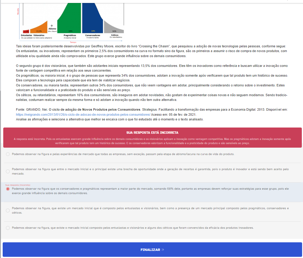 Abismo 34% 34% 16% Entuslastas Visionários Pragmáticos Conservadores On Amaloria inicial tardia Tempo Tais ideias foram posteriormente desenvolvidas por Geoffrey escritor do livro "Crossing the que pesquisou a adoção de novas tecnologias pelas conforme segue: Os entusiastas, ou representam os primeiros dos consumidores na curva no formato sino da figura, são os primeiros a assumir 0 risco de compra de novos produtos, com utilidade e/ou qualidade ainda não comprovados. Este grupo exerce grande influência sobre os demais O segundo grupo é dos que são adotantes iniciais representando dos Eles têm os inovadores como referência e buscam utilizar a inovação como fonte de vantagem competitiva em relação aos seus Os ou maioria inicial, é grupo de pessoas que representa 34% dos adotam a inovação somente após verificarem que tal produto tem um de Eles compram a tecnologia pela capacidade que ela tem de viabilizar Os conservadores, ou maioria representam outros 34% dos que não veem vantagens em adotar, principalmente considerando retorno sobre Estes valorizam a funcionalidade e a praticidade do produto e são ao preço. Os ou representam 16% dos são inseguros em adotar não gostam de experimentar coisas novas e não seguem Sendo tradicio- costumam realizar sempre da mesma forma e adotam a inovação quando não tem outra Fonte: GRANDO ciclo de adoção de Novos Produtos pelos Consumidores Facilitando a transformação das empresas para a Economia Digital 2013. Disponível em: 05 de fev. de Analise as afirmações e selecione a alternativa que melhor se encaixa com que foi estudado até momento e texto SUA RESPOSTA ESTÁ INCORRETA A resposta está incorreta. Pois os entusiastas exercem grande sobre os demais consumidores e os visionários aplicam a inovação como vantagem competitiva. Mas pragmáticos adotam a inovação somente após verificarem que tal produto tem um de sucesso. E conservadores valorizam a funcionalidade a praticidade do produto e são sensiveis ao preço Podemos observar na figura e pelas experiencias de mercado que todas as sem passam pela etapa de abismo/lacuna na curva de vida do Podemos observar na figura que entre mercado inicial e principal existe uma brecha de oportunidade onde a geração de receitas é pois produto inovador está sendo bem aceito pelo mercado. Sua resposta Podemos observar na figura que os conservadores e representam a maior parte do somando 68% portanto as empresas devem reforçar suas estratégias para esse pois ele exerce grande influência sobre os demais Podemos observar na figura. que existe um mercado inicial que é composto pelos entusiastas e bem como a presença de um mercado principal composto pelos conservadores e Podemos observar na que existe mercado inicial composto pelos entusiastas e visionários e alguns dos céticos que foram convencidos da eficácia dos produtos FINALIZAR