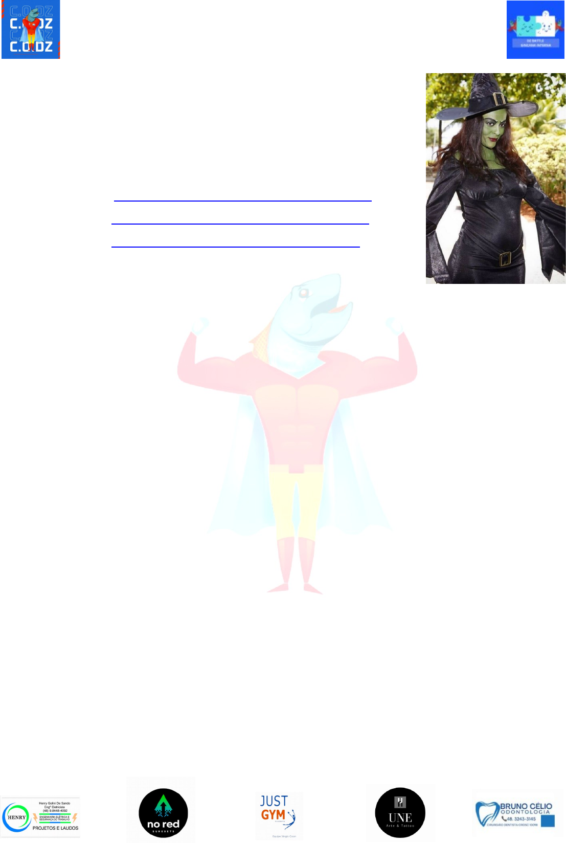 Prova 06: Título: A ilha da Magia As lendas das bruxas são presentes em Santa Catarina, principalmente em Florianópolis, que é conhecida como a “ilha da magia”. Nesta prova queremos que apresentem aos jurados uma bruxa, que deve realizar uma performance da música sorteada no local indicado pela CODZ. Música 1 - https://youtu.be/4V90AmXnguw?si=O1NpKrcYSSf6wVL1 Música 2 - https://youtu.be/OdpcwMdE8eo?si=guVUBkzrN81qsusX Música 3 - https://youtu.be/OBeVDXx1bIQ?si=jihDiBf0WDVNxQls Regras da performance: > Tempo máximo 2min30seg. > Tempo mínimo de apresentação: 1min30seg. > Participação de 1 (um) integrante da equipe devidamente inscrito. > O tempo inicial e final do cumprimento da tarefa será cronometrado pela CODZ sempre com a autorização do líder da equipe. > A performance deve conter três etapas, 1) o desfile com local de início e fim demarcado pela CODZ, 2) performance/apresentação de um trecho de no mínimo 1 minuto da música, 3) ao fim da performance, a personagem deve sair pelo local de entrada (desfile) sendo obrigatório uma risada característica do seu personagem durante sua saída. > A apresentação da equipe será avaliada pelo corpo de jurados, com notas de 5,0 a 10,0 em cada um dos critérios: 1) Figurino; 2) Maquiagem; 3) Criatividade; 4) Interpretação. > Caso a equipe descumpra quaisquer uma das regras desta tarefa, esta poderá ser penalizada com o desconto de 1 ponto na somatória final das notas dos jurados. Instruções: Realizem a apresentação conforme solicitado. Entrega: A partir das 16:00 do dia 29/10/2023 no local designado pela CODZ. Pontuação: (CADEADA) CODZ – Comissão Organizadora DaZumbanho – Biguaçu/SC - outubro 2023 image1.jpeg image2.jpeg image3.png image4.jpeg image10.jpeg image5.png image6.png image7.png image8.png image9.png