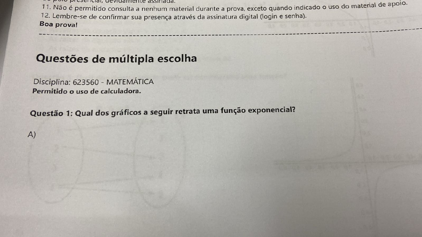 dSsinlddd.:INdO e permitido consulta a nenhum material durante a prova, exceto quando indicado o uso do maternalde dpo 12. Lembre-se de confirmar sua presença através da assinaturadigital (login e senha). Boa prova! Questões de múltipla escolha Disciplina: 623560 - MATEMÁTICA Permitido o uso de calculadora. Questão 1: Qual dos gráficos a seguir retrata uma função exponencial? A) h.0 h2,0 .0 ho.o 70 L -90-80-70-6 -5.0 -4� -30 -20 -10 B,0 2,0 20 1,0 2,0 30 40 B) 4,0 30 20 10 50 -4,0 -30 -20 10/10 2,0 30 4,0 50 60 70 80 20 C) 40 30 2,0 10 20 -6,0 -50 -40 -30 -2,0 10 1,0 :2,0 -3,0 -4,0 5,0 -6,0 70 10 20 30 40 50 6,0 D) 79 -70 -80 50-40 -30-20 10 E) .0 20 -10 10 2,0 30 4,0 50 6,0 6 7 8. 9 7 5p 40 *D-60 50 -4.0 -30-20 404 10 20 30 4,0 50 60 D P 12 Bt Questão 2:Encontre as raízes da equação x(x +2) + x(x + 1) =x* + 4 A) As raízes da equação são x' = 1ex'= -4 B) As raízes da equação são x'= -1ex"=4 C) As raízes da equacão são x'=8ex'=2 D) As raízes da equação são x' =-8ex" = -2 E) Aénegativo, por isso não há raízes para essa equação. Questão3:Qual dos itens a seguir podeserconsiderado uma função? A) R;A�B B 2 3 2 �3 4 B) RA-+B 2 3 4 5 B C R:A�B B 2 3 4 5 D) E) +4 12 e8 B Questão 4: Resolva o sistema de equaçõeseassinale a alternativa correta(r+y=3 lx-y=9 A) x=4ey=3 B) X=0,5 ey=3 C) x=3ey=4 D) x=6ey=-3 X=-3ey= 6 Questão 5: Indiqueo resultado da express�o 12 A) 21 nRTANcão ,G+)+)-G),numérica B) 12 D) 12 E) 15 Questão 6: Indique qual das alternativas a seguir representa o gráfico da função de 2° grau f(x 4,0 20 A) -7D -60 50 -40 -8.0 -2.0 41.0 -20 -30 -4,0 5.0 -6.0 10 2,0 30 40 5,0 6,0 -70 -6,0 5,0-4,0 -3D -20 1,0 50 4,0 3,0 20 .0 1.0 20 3,0 4,0 5,0 6,0ono1,0 -20 30 ne B) -50 -6,0 1.70 7D -60 -30 -4O -3,0 -20M0 1 1,0 2,0 3A 1020 90 4,0 5.0 60 C) 50 -60 2.0 D) 70 -6O 50 -4D -30 -20-10 -2,0 30 10 50 -60 10 2,0 30 4dn 50 60 5.0 |4D .70-60-5,0 -40 -3,0 -2,0 10 10 2,0 30 4,0 5,0 6,0 -1.0 2.0 E) Questão 7:A partir dos conceitos de conjunto, pertinência e relações de inclus�o, qua errada? A) As relações de pertinência podem ocorrer entre conjuntos. B) As relações de inclusão ocorrem entre conjuntos. C) As relações de pertinência podem ocorrer entre elementos e conjuntos. ) Eum erro dizer que um elemento estácontido em um conjunto. ) Éum erro dizer que um conjunto contém um elemento. uestão 8: Possuo R$ 5.300,00em notas de R$ 50,00eR$ 100,00,totalizando80not ecadavalor? 26 notas de R$ 50,00e 54 notas de R$ 100,00. 34 notas de R$ 50,00e 46 notas de R$ 100,00. 46 notas de R$ 50,00e 34 notas de R$ 100,00. 54 notas de R$ 50,00e26 notas de R$ 100,00. E) 14 notasdeR$ 50,00e16 notas de R$ 100,00. Questão 9: Dado f(x) =2x+6,determine ozeroda função. A) 2 B) O C) 3 D) -3 E) 8 Questão 10:Indique o resultado da expressão numérica (2+[1+3]-[4+(2-1)1) A) 0 B) 1 C) 2 D) 3 E) 4 -Gabarito matemática QUESTÄO ALTERNATIVA CORRETA 1 A A 4 D D E A D D 10 B