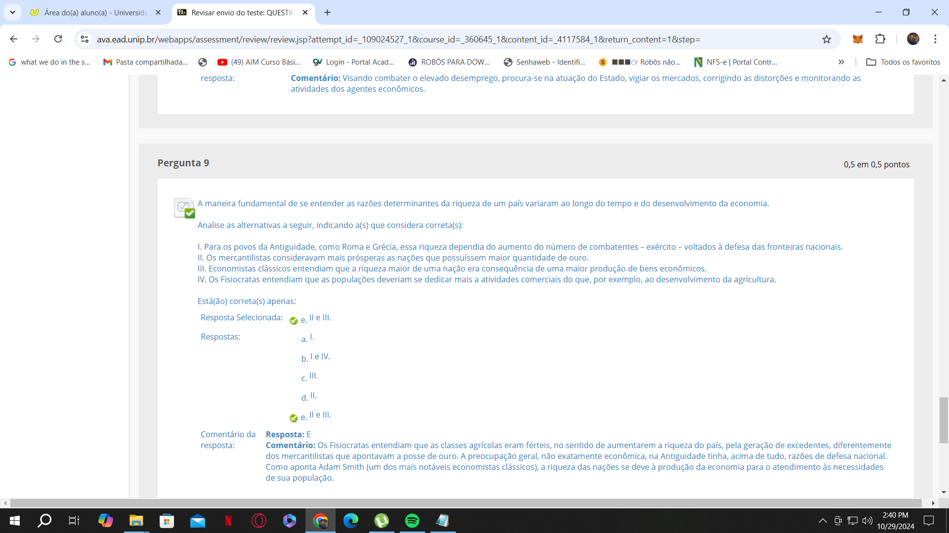 Área do(a) aluno(a) Universida Revisar envio do teste: QUESTIC + what we do in the S... Pasta compartilhada.. (49) AIM Curso Bási... Login Portal Acad... ROBÔS PARA Senhaweb Identifi.. Robôs não... NFS-e Portal Contr... Todos os favoritos resposta: Comentário: Visando combater elevado desemprego, procura-se na atuação do Estado, vigiar os mercados, corrigindo as distorções e monitorando as atividades dos agentes Pergunta 9 0,5 em 0,5 pontos A maneira fundamental de se entender as razões determinantes da riqueza de um país variaram ao longo do tempo e do desenvolvimento da economia. Analise as alternativas a seguir, indicando a(s) que considera correta(s): I. Para os povos da Antiguidade, como Roma e Grécia, essa riqueza dependia do aumento do número de combatentes exército - voltados à defesa das fronteiras nacionais. II. Os mercantilistas consideravam mais prósperas as nações que maior quantidade de ouro. III. Economistas clássicos entendiam que a riqueza maior de uma nação era consequência de uma maior produção de bens IV. Os Fisiocratas entendiam que as populações deveriam se dedicar mais a atividades comerciais do que, por exemplo, ao desenvolvimento da agricultura. Está(ão) correta(s) apenas: Resposta Selecionada e. III. Respostas: a. I. b. IV. III. d. II. e. III. Comentário da Resposta: E resposta: Comentário: Os Fisiocratas entendiam que as classes agrícolas eram férteis, no sentido de aumentarem a riqueza do país, pela geração de excedentes, diferentemente dos mercantilistas que apontavam a posse de ouro. A preocupação geral, não exatamente econômica, na Antiguidade tinha, acima de tudo, razões de defesa nacional. Como aponta Adam Smith (um dos mais notáveis economistas clássicos), a riqueza das nações se deve à produção da economia para atendimento às necessidades de sua população. 2:40 PM N 10/29/2024