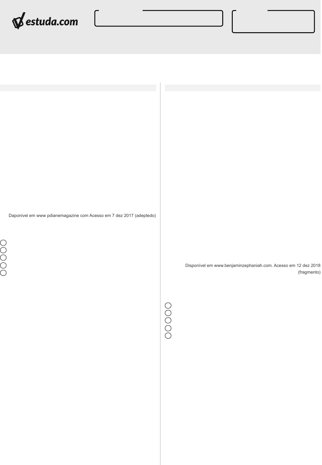 Esta prova foi gerada pela Estuda.com ENEM 2021 1° Dia (Prova Azul) ENEM a b c d e Questão 1 We are now a nation obsessed with the cult of celebrity. Celebrities have replaced the classic notion of the hero. But instead of being respected for talent, courage or Intelligence, it is money, style and image the deciding factors in what commands respect. Image is everything. Their image is painstakingly constructed by a multitude of different image consultants to carve out the most profitable celebrity they can. Then society is right behind them, believing in everything that celebrity believes In. Companies know that people will buy a product if a celebrity has it too. Itis as if the person buying the product feels thal they now have some kind of comection with the celebrity and that some of their perceived happiness will now be passed onto the consumer. So to look at it one way, the cult of celebrity is really nothing more than a sophisticated marketing scheme. Celebrities though cannot be blamed for all negative aspects of society. In reality society is to blame. We are the people who seemed to have lost lhe ability to think for ourselves. I suppose it's easier to be told what to think, rather than challenging what we are told. The reason we are swamped by celebrity is because there is a demand for it. O texto, que aborda questões referentes ao tema do culto à celebridade, tem o objetivo de destacar os méritos das celebridades. criticar o consumismo das celebridades. ressaltar a necessidade de reflexão dos fãs. culpar as celebridades pela obsessão dos fãs. valorizar o marketing pessoal das celebridades. ENEM a b c d e Questão 2 The British (serves 60 million) Take some Picts, Celts and Silures And let them settle, Then overrun them with Roman conquerors. Remove the Romans after approximately 400 years Add lots of Norman French to some Angles, Saxons, Jules and Vikings, then stir vigorously. [...] Sprinkle some fresh Indians, Malaysians, Bosnians, lraqis and Bangladeshis together with some Afghans, Spanish, Turkish, Kurdish, Japanese And Palestinians Then add to the meliting pot. Leave the ingredients to simmer. As they mix and blend allow their languages to flourish Binding them together with English. Allow time to be cool. Add some unity, understanding, and respect for the future, Serve with justice And enjoy. Note: All the ingredients are equally important. Treating one ingredient better than another will leave a bitter unpleasant taste. Warning: An unequal spread of justice will damage the people and cause pain. Give justice and equality to all. Ao descrever o processo de formação da Inglaterra, o autor do poema recorre a características de outro gênero textual para evidenciar a riqueza da mistura cultural. um legado de origem geográfica. um impacto de natureza histórica. um problema de estratificação social. a questão da intolerância linguística. CURSINHO POPULAR Nome do aluno ENEM 2021 1° Dia (Prova Azul) Avaliação Daponivel em www pdianemagazine com Acesso em 7 dez 2017 (adeptedo) Disponível em www.benjaminzephaniah.com. Acesso em 12 dez 2018 (fragmento) ENEM a b c d e Questão 3 Becoming Back in lhe ancestral homeland of Michelle Obama, black women were rarety granted the honorific Miss or Mrs., but were addressed by their first name, or simply as “gal” or “auntie” or worse. This so openly demeaned them that many black women, long after they had left the South, refused to answer if called by their first name. A mother and father in 1970s Texas named their newborm “Miss” so that white people would have no choice but to address their daughter by that title. Black women were meant for the field or the kitchen, or for use as they saw fit. They were, by definition, not ladies. The very idea of a black woman as first lady of the land, well, that would have been unlhinkable. A critica do livro de memórias de Michelle Obama, ex-primeira- dama dos EUA, aborda a história das relações humanas na cidade natal da autora. Nesse contexto, o uso do vocábulo "unthinkable" ressalta que a ascensão social era improvável. a mudança de nome era impensável. a origem do indivíduo era irrelevante. o trabalho feminino era inimaginável. o comportamento parental era irresponsável. ENEM a b c d e Questão 4 A presença de “at odds with” na fala da personagem do cartum revela o(a) necessidade de acessar informações confiáveis. dificuldade de conciliar diferentes anseios. desejo de dominar novas tecnologias. desafio de permanecer imparcial. vontade de ler notícias positivas. ENEM a b c d e Questão 5 Exterior: Between The Museums — Day CELINE Americans always think Europe is perfect. But such beauty and history can be really oppressive. It reduces the individual to nothing. It just reminds you all the time you are just a little speck in a long history, where in America you feel like you could be making history. That's why I like Los Angeles because it is so... JESSE Ugly? CELINE No, I was going to say “neutral”. It's like looking at a blank canvas. I think people go to places like Venice on their honeymoon to make sure they are not going to fight I for the first two weeks of their marriage because they'll be too busy looking around at all the beautiful things. That's I what people call a romantic place — somewhere where the prettiness will contain your primary violent instinct. A real good honeymoon spot would be like somewhere in New Jersey. Considerando-se o olhar dos personagens, esse trecho do roteiro de um filme permite reconhecer que a avaliação sobre um lugar depende do(a) beleza do próprio local. perspectiva do visitante. contexto histórico do local. tempo de permanência no local. finalidade da viagem do visitante. ENEM a b c d e Questão 6 Um asteroide de cerca de um mil metros de diâmetro, viajando a 288 mil quilômetros por hora, passou a uma distância insignificante — em termos cósmicos — da Terra, pouco mais do dobro da dist