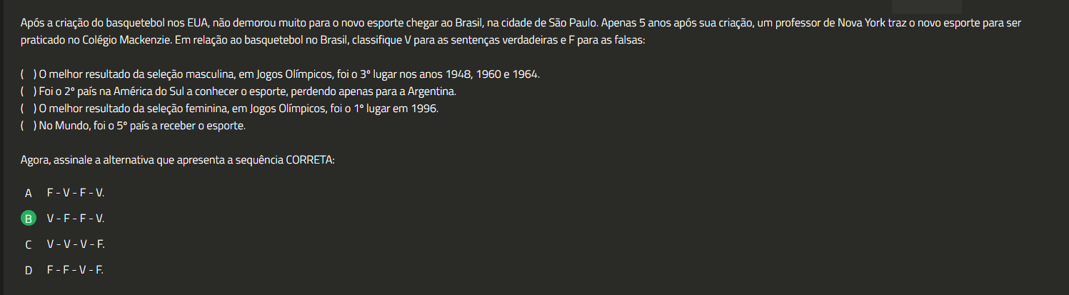 Após a criação do basquetebol nos EUA, não demorou muito para novo esporte chegar ao Brasil, na cidade de São Paulo. Apenas 5 anos após sua criação, um professor de Nova York traz novo esporte para ser praticado no Colégio Mackenzie. Em relação ao basquetebol no Brasil, classifique V para as sentenças verdadeiras e F para as falsas: ( ) melhor resultado da seleção masculina, em Jogos Olímpicos, foi 3° lugar nos anos 1948, 1960 e 1964. ( ) Foi país na América do Sul a conhecer esporte, perdendo apenas para a ( melhor resultado da seleção feminina, em Jogos Olímpicos, foi 1° lugar em 1996. ( ) No Mundo, foi 5° país a receber esporte. Agora, assinale a alternativa que apresenta a seguência CORRETA: A B V - F F V. D