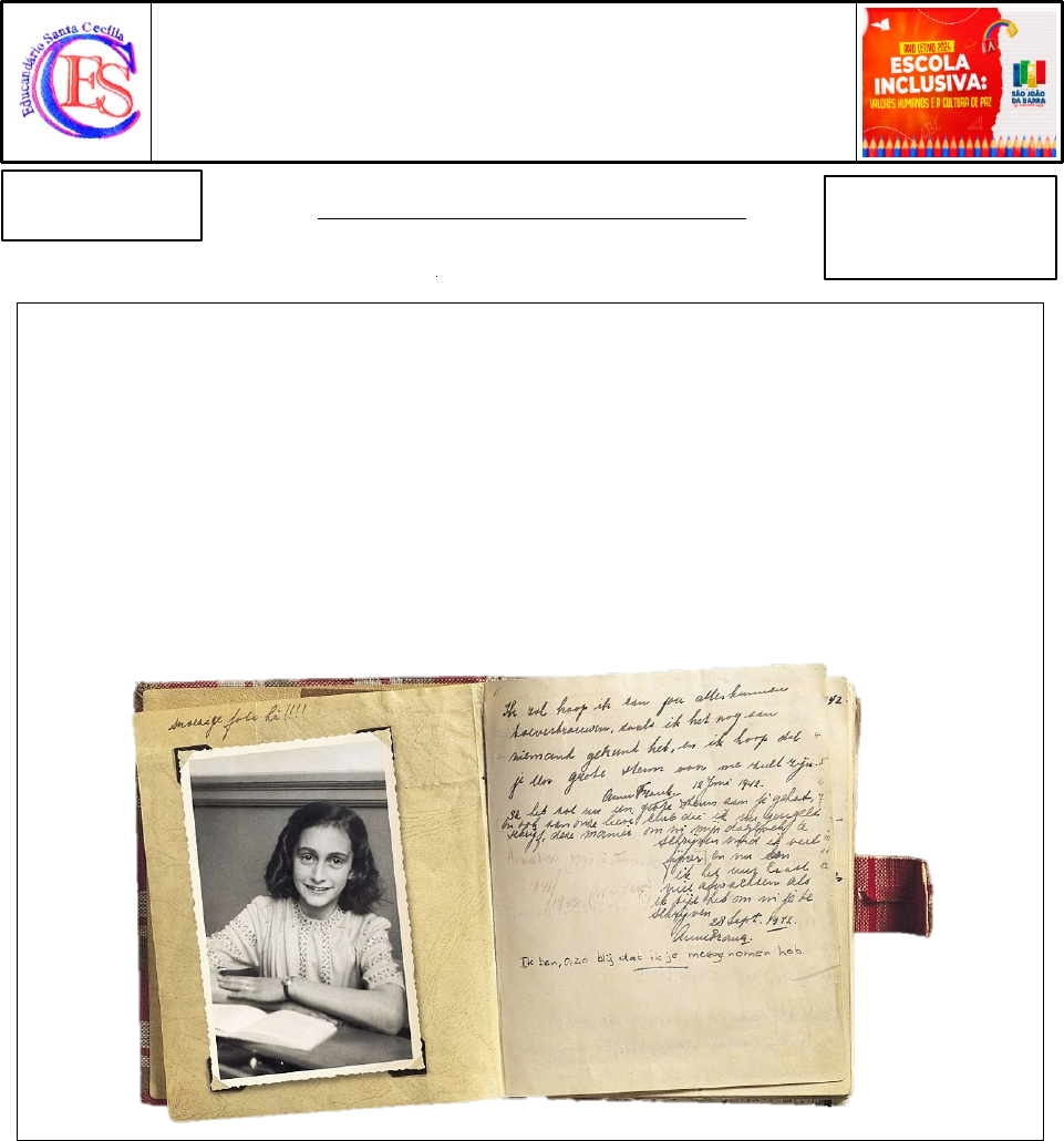 Escola: _____________________________________________ Aluna: ______________________________________________ Professora: __________________ – 5° Ano – Turma: 501 Data: ________________________________ Valor do Teste: 7 Nota: ______ Valor da Feira de Fontes Históricas: 3 Nota: ______ Atividade Avaliativa de História 1- Leia o texto para responder às questões: O diário de Anne Frank O Diário de Anne Frank foi escrito pela então adolescente Anne Frank, no período que se estende de 1942 a 1º de agosto de 1944. Ela viveu em um dos contextos mais difíceis da história da Humanidade: a Segunda Guerra Mundial. Ela conta nas páginas todas as dificuldades que ela e a sua família viveram durante a guerra. Seu diário foi encontrado e publicado como livro, para que todos pudessem conhecer aquele período histórico que a menina viveu. - Lendo o diário percebemos a importância dele para compreendermos um período histórico do passado, do qual não fizemos parte, mas através da leitura podemos conhecer características a seu respeito. (0,5 cada) a) O que são fontes históricas e qual sua importância para os historiadores? ____________________________________________________________________________________________________________________________________________________________________ __________________________________________________________________________________ b) Que tipo de fonte histórica é o Diário de Anne Frank? __________________________________________________________________________________ c) Que período histórica o diário de Anne Frank nos ajuda a conhecer? __________________________________________________________________________________ 2- As fontes históricas podem ser escritas, visuais, orais e imateriais. Observe as imagens abaixo e numere os quadrinhos de acordo com o tipo de fonte histórica retratado em cada uma: (0,2 cada)1- Fonte oral 2- Fonte visual 3- Fonte escrita 4- Fonte imaterial Documento original da Lei Áurea, que aboliu a escravidão. Entrevista gravada de Jô Soares com o Sílvio Santos. Fóssil de dinossauro que viveu entre 156 milhões e 151 milhões de anos atrás. O frevo é uma expressão musical que surgiu no século XIX. Foto antiga. 3- Sobre a Feira de Fontes Históricas, responda: (0,5 cada) a) Qual ou quais objetos você trouxe para expor? __________________________________________________________________________________ __________________________________________________________________________________ b) Que tipo de fonte histórica é cada objeto que você trouxe? __________________________________________________________________________________ __________________________________________________________________________________ c) Qual a importância das fontes históricas que você expôs para a turma? __________________________________________________________________________________ __________________________________________________________________________________ 4- O município de São João da Barra é repleto de patrimônios culturais. Cite 3 exemplos de cada um desses patrimônios sanjoanenses, de acordo com a classificação abaixo: (0,5 cada) a) Patrimônio Cultural Material: ________________________________________________________ __________________________________________________________________________________ b) Patrimônio Cultural Imaterial: ________________________________________________________ __________________________________________________________________________________ 5- Relacione as colunas colocando as letras de acordo com a definição de cada conceito abaixo: (0,5 cada) A. História B. Memória C. Fontes Históricas D. Marcos de Memória image7.jpeg image8.jpeg image9.jpeg image10.jpeg image11.jpeg image12.png image2.png image3.png image4.png image5.png image6.png