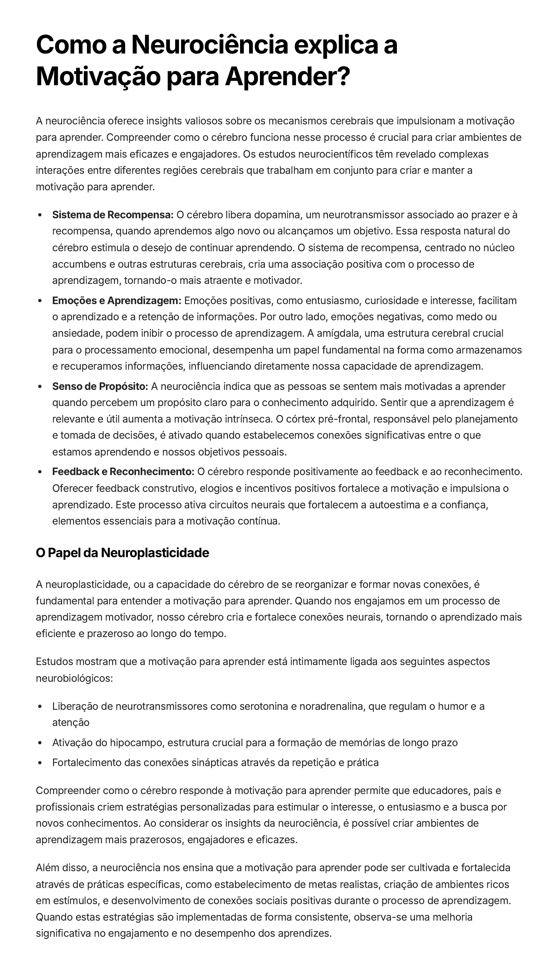 Como a Neurociência explica a Motivação para Aprender? A neurociência oferece insights valiosos sobre os mecanismos cerebrais que impulsionam a motivação para aprender. Compreender como o cérebro funciona nesse processo é crucial para criar ambientes de aprendizagem mais eficazes e engajadores. Os estudos neurocientíficos têm revelado complexas interações entre diferentes regiões cerebrais que trabalham em conjunto para criar e manter a motivação para aprender. Sistema de Recompensa: O cérebro libera dopamina, um neurotransmissor associado ao prazer e à recompensa, quando aprendemos algo novo ou alcançamos um objetivo. Essa resposta natural do cérebro estimula o desejo de continuar aprendendo. O sistema de recompensa, centrado no núcleo accumbens e outras estruturas cerebrais, cria uma associação positiva com o processo de aprendizagem, tornando-o mais atraente e motivador. Emoções e Aprendizagem: Emoções positivas, como entusiasmo, curiosidade e interesse, facilitam o aprendizado e a retenção de informações. Por outro lado, emoções negativas, como medo ou ansiedade, podem inibir o processo de aprendizagem. A amígdala, uma estrutura cerebral crucial para o processamento emocional, desempenha um papel fundamental na forma como armazenamos e recuperamos informações, influenciando diretamente nossa capacidade de aprendizagem. Senso de Propósito: A neurociência indica que as pessoas se sentem mais motivadas a aprender quando percebem um propósito claro para o conhecimento adquirido. Sentir que a aprendizagem é relevante e útil aumenta a motivação intrínseca. O córtex pré-frontal, responsável pelo planejamento e tomada de decisões, é ativado quando estabelecemos conexões significativas entre o que estamos aprendendo e nossos objetivos pessoais. Feedback e Reconhecimento: O cérebro responde positivamente ao feedback e ao reconhecimento. Oferecer feedback construtivo, elogios e incentivos positivos fortalece a motivação e impulsiona o aprendizado. Este processo ativa circuitos neurais que fortalecem a autoestima e a confiança, elementos essenciais para a motivação contínua. O Papel da Neuroplasticidade A neuroplasticidade, ou a capacidade do cérebro de se reorganizar e formar novas conexões, é fundamental para entender a motivação para aprender. Quando nos engajamos em um processo de aprendizagem motivador, nosso cérebro cria e fortalece conexões neurais, tornando o aprendizado mais eficiente e prazeroso ao longo do tempo. Estudos mostram que a motivação para aprender está intimamente ligada aos seguintes aspectos neurobiológicos: Liberação de neurotransmissores como serotonina e noradrenalina, que regulam o humor e a atenção Ativação do hipocampo, estrutura crucial para a formação de memórias de longo prazo Fortalecimento das conexões sinápticas através da repetição e prática Compreender como o cérebro responde à motivação para aprender permite que educadores, pais e profissionais criem estratégias personalizadas para estimular o interesse, o entusiasmo e a busca por novos conhecimentos. Ao considerar os insights da neurociência, é possível criar ambientes de aprendizagem mais prazerosos, engajadores e eficazes. Além disso, a neurociência nos ensina que a motivação para aprender pode ser cultivada e fortalecida através de práticas específicas, como estabelecimento de metas realistas, criação de ambientes ricos em estímulos, e desenvolvimento de conexões sociais positivas durante o processo de aprendizagem. Quando estas estratégias são implementadas de forma consistente, observa-se uma melhoria significativa no engajamento e no desempenho dos aprendizes.