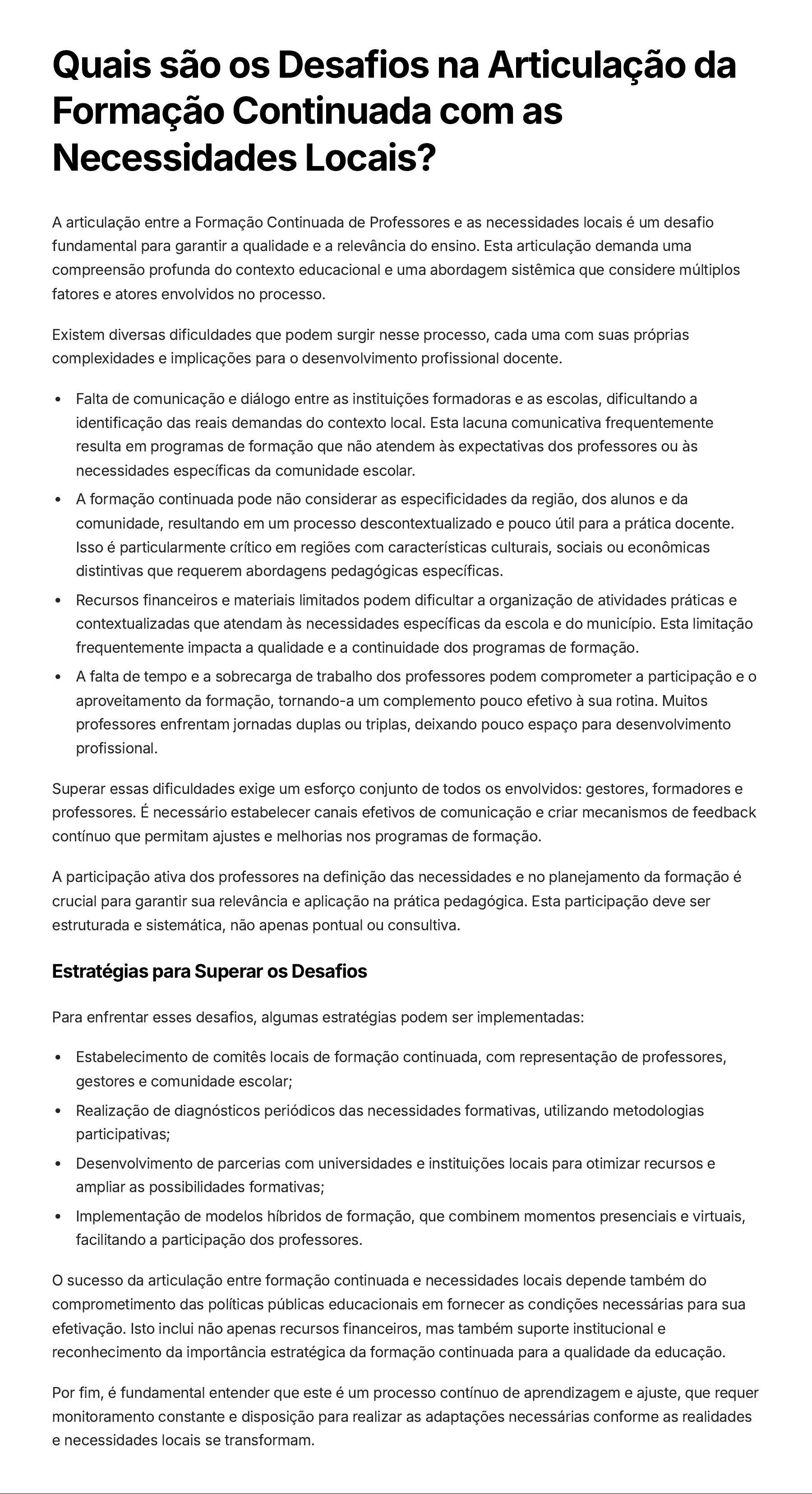 Quais são os Desafios na Articulação da Formação Continuada com as Necessidades Locais? A articulação entre a Formação Continuada de Professores e as necessidades locais é um desafio fundamental para garantir a qualidade e a relevância do ensino. Esta articulação demanda uma compreensão profunda do contexto educacional e uma abordagem sistêmica que considere múltiplos fatores e atores envolvidos no processo. Existem diversas dificuldades que podem surgir nesse processo, cada uma com suas próprias complexidades e implicações para o desenvolvimento profissional docente. Falta de comunicação e diálogo entre as instituições formadoras e as escolas, dificultando a identificação das reais demandas do contexto local. Esta lacuna comunicativa frequentemente resulta em programas de formação que não atendem às expectativas dos professores ou às necessidades específicas da comunidade escolar. A formação continuada pode não considerar as especificidades da região, dos alunos e da comunidade, resultando em um processo descontextualizado e pouco útil para a prática docente. Isso é particularmente crítico em regiões com características culturais, sociais ou econômicas distintivas que requerem abordagens pedagógicas específicas. Recursos financeiros e materiais limitados podem dificultar a organização de atividades práticas e contextualizadas que atendam às necessidades específicas da escola e do município. Esta limitação frequentemente impacta a qualidade e a continuidade dos programas de formação. A falta de tempo e a sobrecarga de trabalho dos professores podem comprometer a participação e o aproveitamento da formação, tornando-a um complemento pouco efetivo à sua rotina. Muitos professores enfrentam jornadas duplas ou triplas, deixando pouco espaço para desenvolvimento profissional. Superar essas dificuldades exige um esforço conjunto de todos os envolvidos: gestores, formadores e professores. É necessário estabelecer canais efetivos de comunicação e criar mecanismos de feedback contínuo que permitam ajustes e melhorias nos programas de formação. A participação ativa dos professores na definição das necessidades e no planejamento da formação é crucial para garantir sua relevância e aplicação na prática pedagógica. Esta participação deve ser estruturada e sistemática, não apenas pontual ou consultiva. Estratégias para Superar os Desafios Para enfrentar esses desafios, algumas estratégias podem ser implementadas: Estabelecimento de comitês locais de formação continuada, com representação de professores, gestores e comunidade escolar; Realização de diagnósticos periódicos das necessidades formativas, utilizando metodologias participativas; Desenvolvimento de parcerias com universidades e instituições locais para otimizar recursos e ampliar as possibilidades formativas; Implementação de modelos híbridos de formação, que combinem momentos presenciais e virtuais, facilitando a participação dos professores. O sucesso da articulação entre formação continuada e necessidades locais depende também do comprometimento das políticas públicas educacionais em fornecer as condições necessárias para sua efetivação. Isto inclui não apenas recursos financeiros, mas também suporte institucional e reconhecimento da importância estratégica da formação continuada para a qualidade da educação. Por fim, é fundamental entender que este é um processo contínuo de aprendizagem e ajuste, que requer monitoramento constante e disposição para realizar as adaptações necessárias conforme as realidades e necessidades locais se transformam.