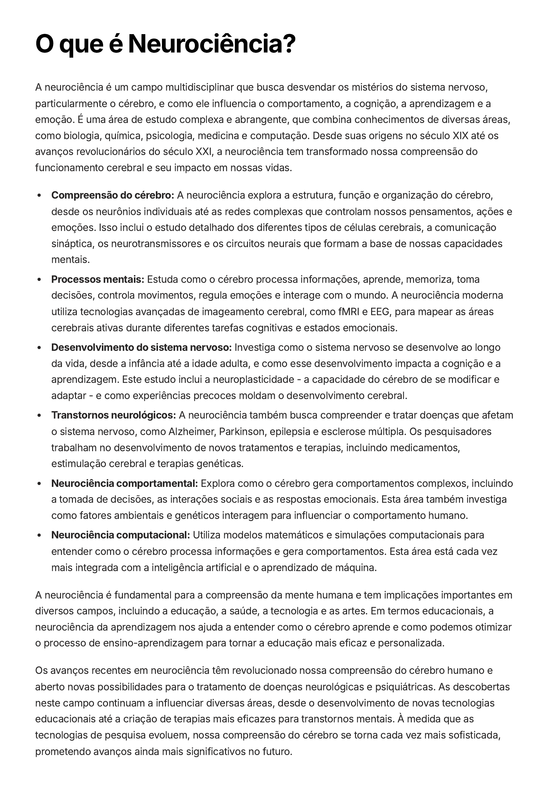 O que é Neurociência? A neurociência é um campo multidisciplinar que busca desvendar os mistérios do sistema nervoso, particularmente o cérebro, e como ele influencia o comportamento, a cognição, a aprendizagem e a emoção. É uma área de estudo complexa e abrangente, que combina conhecimentos de diversas áreas, como biologia, química, psicologia, medicina e computação. Desde suas origens no século XIX até os avanços revolucionários do século XXI, a neurociência tem transformado nossa compreensão do funcionamento cerebral e seu impacto em nossas vidas. Compreensão do cérebro: A neurociência explora a estrutura, função e organização do cérebro, desde os neurônios individuais até as redes complexas que controlam nossos pensamentos, ações e emoções. Isso inclui o estudo detalhado dos diferentes tipos de células cerebrais, a comunicação sináptica, os neurotransmissores e os circuitos neurais que formam a base de nossas capacidades mentais. Processos mentais: Estuda como o cérebro processa informações, aprende, memoriza, toma decisões, controla movimentos, regula emoções e interage com o mundo. A neurociência moderna utiliza tecnologias avançadas de imageamento cerebral, como fMRI e EEG, para mapear as áreas cerebrais ativas durante diferentes tarefas cognitivas e estados emocionais. Desenvolvimento do sistema nervoso: Investiga como o sistema nervoso se desenvolve ao longo da vida, desde a infância até a idade adulta, e como esse desenvolvimento impacta a cognição e a aprendizagem. Este estudo inclui a neuroplasticidade - a capacidade do cérebro de se modificar e adaptar - e como experiências precoces moldam o desenvolvimento cerebral. Transtornos neurológicos: A neurociência também busca compreender e tratar doenças que afetam o sistema nervoso, como Alzheimer, Parkinson, epilepsia e esclerose múltipla. Os pesquisadores trabalham no desenvolvimento de novos tratamentos e terapias, incluindo medicamentos, estimulação cerebral e terapias genéticas. Neurociência comportamental: Explora como o cérebro gera comportamentos complexos, incluindo a tomada de decisões, as interações sociais e as respostas emocionais. Esta área também investiga como fatores ambientais e genéticos interagem para influenciar o comportamento humano. Neurociência computacional: Utiliza modelos matemáticos e simulações computacionais para entender como o cérebro processa informações e gera comportamentos. Esta área está cada vez mais integrada com a inteligência artificial e o aprendizado de máquina. A neurociência é fundamental para a compreensão da mente humana e tem implicações importantes em diversos campos, incluindo a educação, a saúde, a tecnologia e as artes. Em termos educacionais, a neurociência da aprendizagem nos ajuda a entender como o cérebro aprende e como podemos otimizar o processo de ensino-aprendizagem para tornar a educação mais eficaz e personalizada. Os avanços recentes em neurociência têm revolucionado nossa compreensão do cérebro humano e aberto novas possibilidades para o tratamento de doenças neurológicas e psiquiátricas. As descobertas neste campo continuam a influenciar diversas áreas, desde o desenvolvimento de novas tecnologias educacionais até a criação de terapias mais eficazes para transtornos mentais. À medida que as tecnologias de pesquisa evoluem, nossa compreensão do cérebro se torna cada vez mais sofisticada, prometendo avanços ainda mais significativos no futuro.
