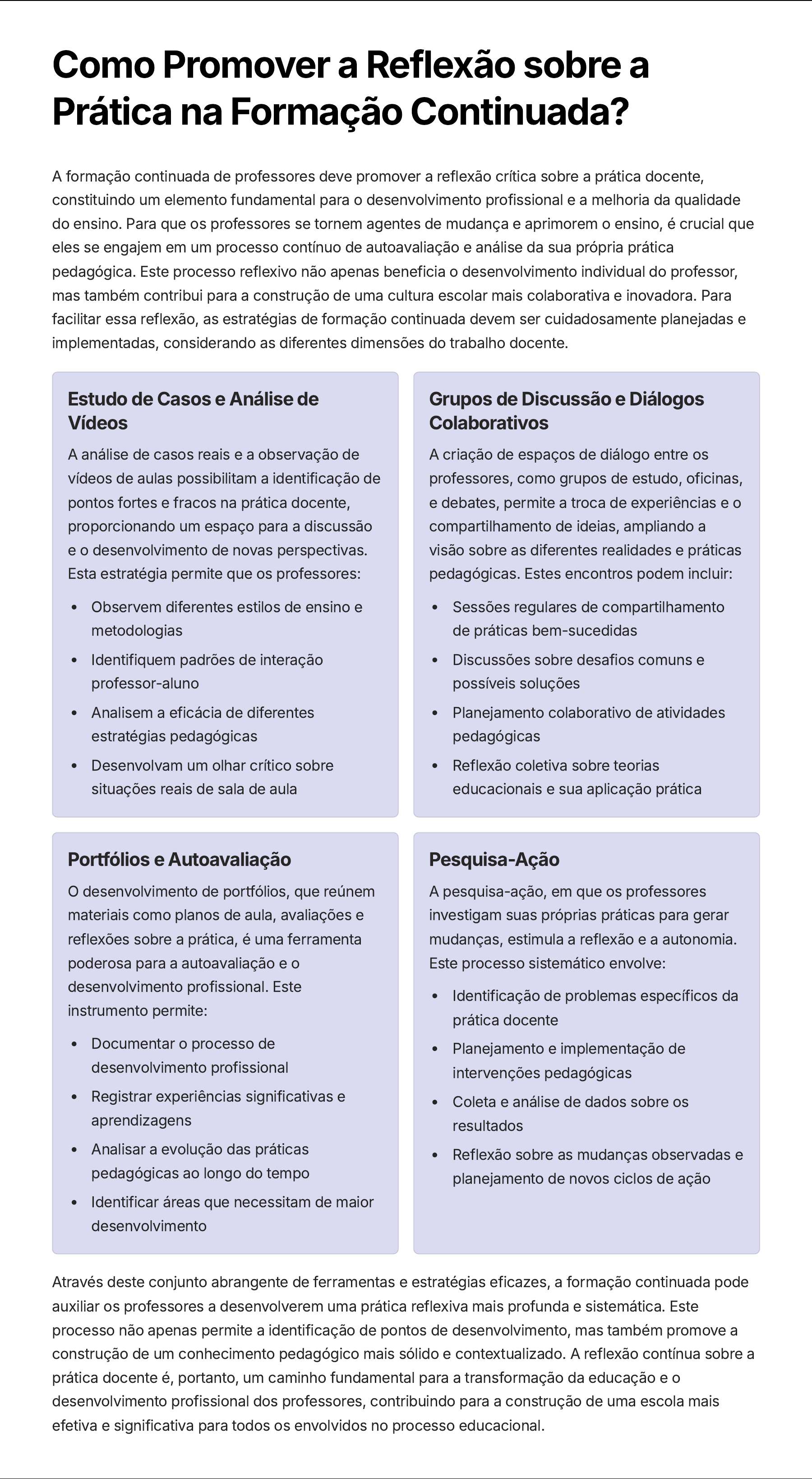 Como Promover a Reflexão sobre a Prática na Formação Continuada? A formação continuada de professores deve promover a reflexão crítica sobre a prática docente, constituindo um elemento fundamental para o desenvolvimento profissional e a melhoria da qualidade do ensino. Para que os professores se tornem agentes de mudança e aprimorem o ensino, é crucial que eles se engajem em um processo contínuo de autoavaliação e análise da sua própria prática pedagógica. Este processo reflexivo não apenas beneficia o desenvolvimento individual do professor, mas também contribui para a construção de uma cultura escolar mais colaborativa e inovadora. Para facilitar essa reflexão, as estratégias de formação continuada devem ser cuidadosamente planejadas e implementadas, considerando as diferentes dimensões do trabalho docente. Estudo de Casos e Análise de Vídeos A análise de casos reais e a observação de vídeos de aulas possibilitam a identificação de pontos fortes e fracos na prática docente, proporcionando um espaço para a discussão e o desenvolvimento de novas perspectivas. Esta estratégia permite que os professores: Observem diferentes estilos de ensino e metodologias Identifiquem padrões de interação professor-aluno Analisem a eficácia de diferentes estratégias pedagógicas Desenvolvam um olhar crítico sobre situações reais de sala de aula Grupos de Discussão e Diálogos Colaborativos A criação de espaços de diálogo entre os professores, como grupos de estudo, oficinas, e debates, permite a troca de experiências e o compartilhamento de ideias, ampliando a visão sobre as diferentes realidades e práticas pedagógicas. Estes encontros podem incluir: Sessões regulares de compartilhamento de práticas bem-sucedidas Discussões sobre desafios comuns e possíveis soluções Planejamento colaborativo de atividades pedagógicas Reflexão coletiva sobre teorias educacionais e sua aplicação prática Portfólios e Autoavaliação O desenvolvimento de portfólios, que reúnem materiais como planos de aula, avaliações e reflexões sobre a prática, é uma ferramenta poderosa para a autoavaliação e o desenvolvimento profissional. Este instrumento permite: Documentar o processo de desenvolvimento profissional Registrar experiências significativas e aprendizagens Analisar a evolução das práticas pedagógicas ao longo do tempo Identificar áreas que necessitam de maior desenvolvimento Pesquisa-Ação A pesquisa-ação, em que os professores investigam suas próprias práticas para gerar mudanças, estimula a reflexão e a autonomia. Este processo sistemático envolve: Identificação de problemas específicos da prática docente Planejamento e implementação de intervenções pedagógicas Coleta e análise de dados sobre os resultados Reflexão sobre as mudanças observadas e planejamento de novos ciclos de ação Através deste conjunto abrangente de ferramentas e estratégias eficazes, a formação continuada pode auxiliar os professores a desenvolverem uma prática reflexiva mais profunda e sistemática. Este processo não apenas permite a identificação de pontos de desenvolvimento, mas também promove a construção de um conhecimento pedagógico mais sólido e contextualizado. A reflexão contínua sobre a prática docente é, portanto, um caminho fundamental para a transformação da educação e o desenvolvimento profissional dos professores, contribuindo para a construção de uma escola mais efetiva e significativa para todos os envolvidos no processo educacional.