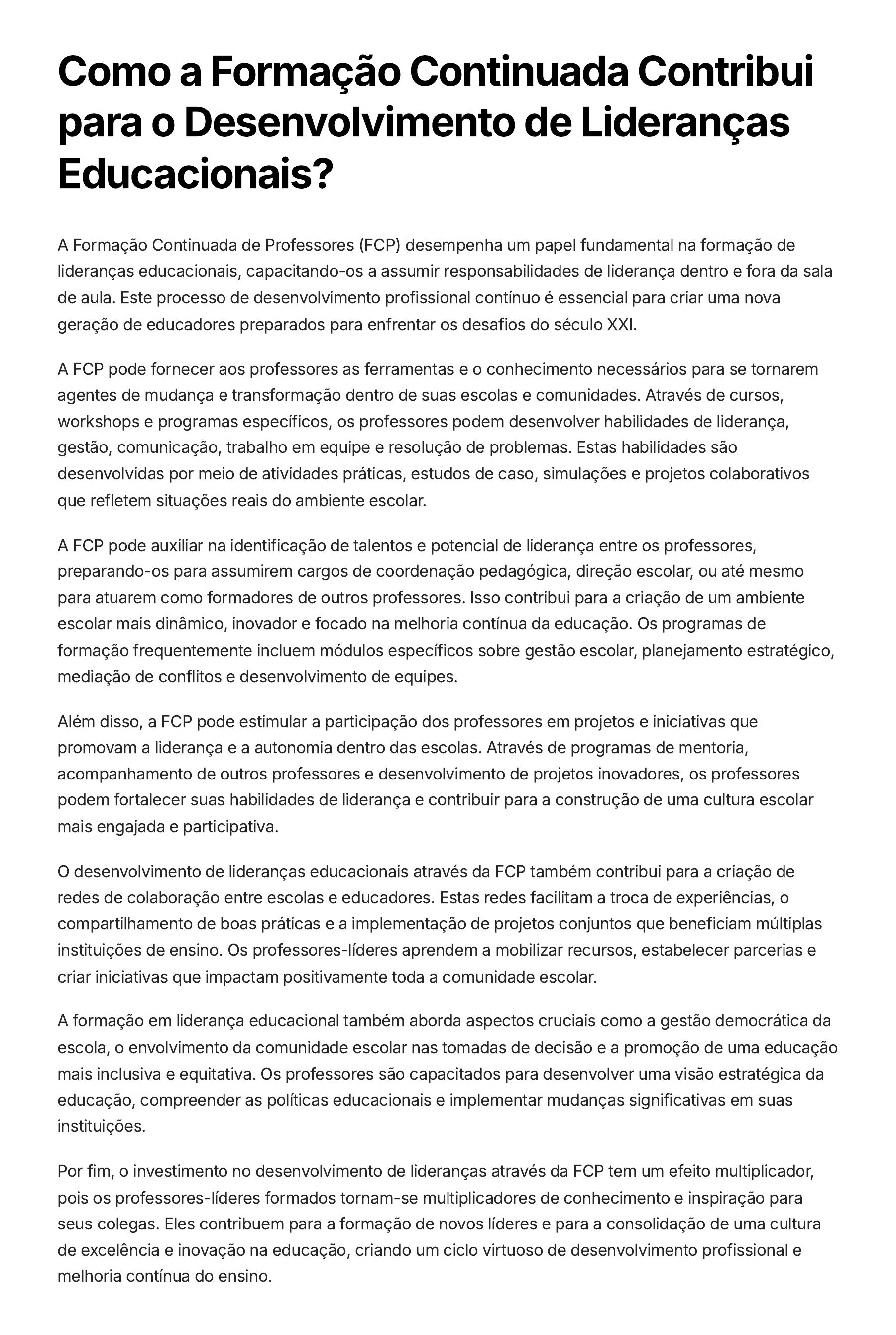 Como a Formação Continuada Contribui para o Desenvolvimento de Lideranças Educacionais? A Formação Continuada de Professores (FCP) desempenha um papel fundamental na formação de lideranças educacionais, capacitando-os a assumir responsabilidades de liderança dentro e fora da sala de aula. Este processo de desenvolvimento profissional contínuo é essencial para criar uma nova geração de educadores preparados para enfrentar os desafios do século XXI. A FCP pode fornecer aos professores as ferramentas e o conhecimento necessários para se tornarem agentes de mudança e transformação dentro de suas escolas e comunidades. Através de cursos, workshops e programas específicos, os professores podem desenvolver habilidades de liderança, gestão, comunicação, trabalho em equipe e resolução de problemas. Estas habilidades são desenvolvidas por meio de atividades práticas, estudos de caso, simulações e projetos colaborativos que refletem situações reais do ambiente escolar. A FCP pode auxiliar na identificação de talentos e potencial de liderança entre os professores, preparando-os para assumirem cargos de coordenação pedagógica, direção escolar, ou até mesmo para atuarem como formadores de outros professores. Isso contribui para a criação de um ambiente escolar mais dinâmico, inovador e focado na melhoria contínua da educação. Os programas de formação frequentemente incluem módulos específicos sobre gestão escolar, planejamento estratégico, mediação de conflitos e desenvolvimento de equipes. Além disso, a FCP pode estimular a participação dos professores em projetos e iniciativas que promovam a liderança e a autonomia dentro das escolas. Através de programas de mentoria, acompanhamento de outros professores e desenvolvimento de projetos inovadores, os professores podem fortalecer suas habilidades de liderança e contribuir para a construção de uma cultura escolar mais engajada e participativa. O desenvolvimento de lideranças educacionais através da FCP também contribui para a criação de redes de colaboração entre escolas e educadores. Estas redes facilitam a troca de experiências, o compartilhamento de boas práticas e a implementação de projetos conjuntos que beneficiam múltiplas instituições de ensino. Os professores-líderes aprendem a mobilizar recursos, estabelecer parcerias e criar iniciativas que impactam positivamente toda a comunidade escolar. A formação em liderança educacional também aborda aspectos cruciais como a gestão democrática da escola, o envolvimento da comunidade escolar nas tomadas de decisão e a promoção de uma educação mais inclusiva e equitativa. Os professores são capacitados para desenvolver uma visão estratégica da educação, compreender as políticas educacionais e implementar mudanças significativas em suas instituições. Por fim, o investimento no desenvolvimento de lideranças através da FCP tem um efeito multiplicador, pois os professores-líderes formados tornam-se multiplicadores de conhecimento e inspiração para seus colegas. Eles contribuem para a formação de novos líderes e para a consolidação de uma cultura de excelência e inovação na educação, criando um ciclo virtuoso de desenvolvimento profissional e melhoria contínua do ensino.