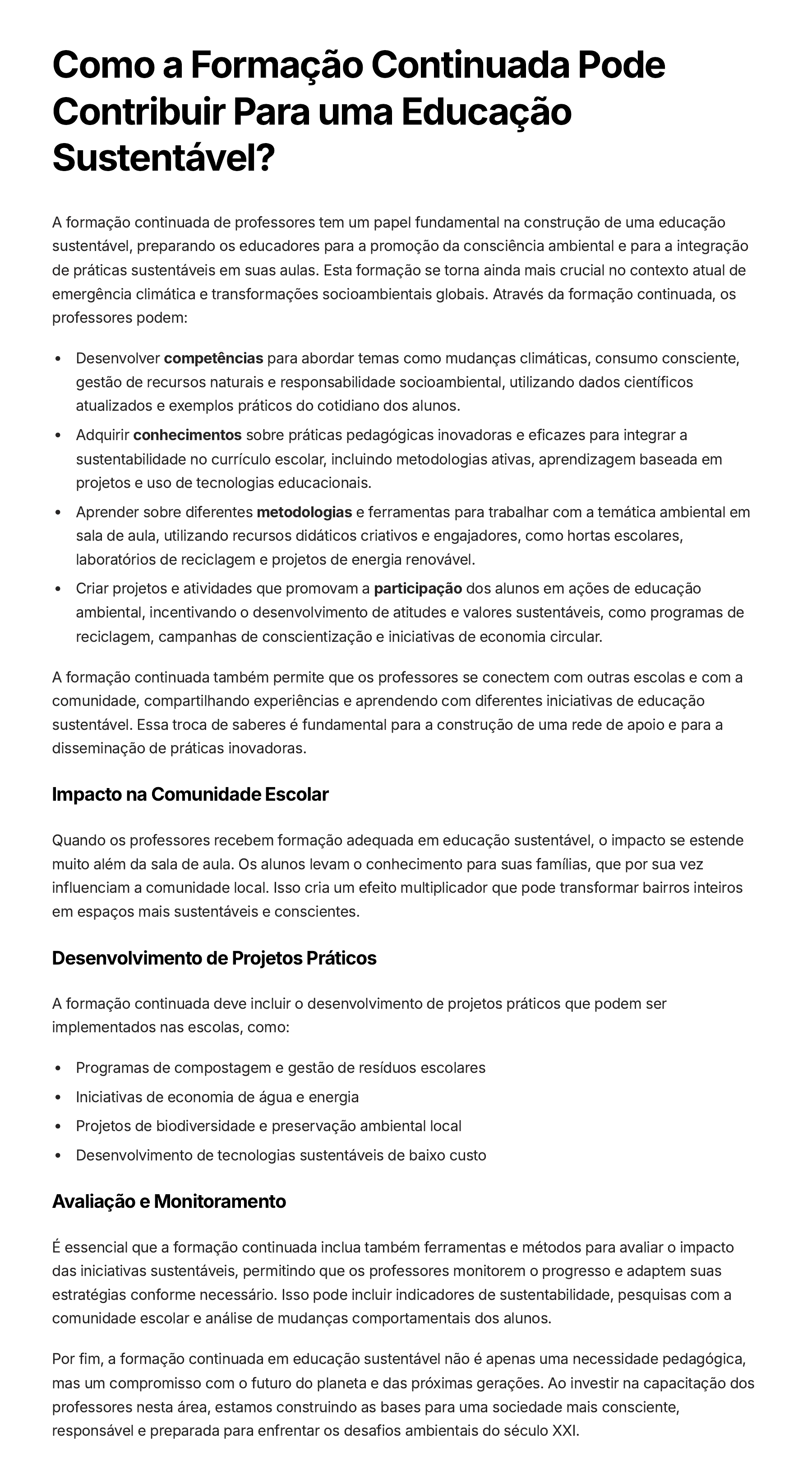 Como a Formação Continuada Pode Contribuir Para uma Educação Sustentável? A formação continuada de professores tem um papel fundamental na construção de uma educação sustentável, preparando os educadores para a promoção da consciência ambiental e para a integração de práticas sustentáveis em suas aulas. Esta formação se torna ainda mais crucial no contexto atual de emergência climática e transformações socioambientais globais. Através da formação continuada, os professores podem: Desenvolver competências para abordar temas como mudanças climáticas, consumo consciente, gestão de recursos naturais e responsabilidade socioambiental, utilizando dados científicos atualizados e exemplos práticos do cotidiano dos alunos. Adquirir conhecimentos sobre práticas pedagógicas inovadoras e eficazes para integrar a sustentabilidade no currículo escolar, incluindo metodologias ativas, aprendizagem baseada em projetos e uso de tecnologias educacionais. Aprender sobre diferentes metodologias e ferramentas para trabalhar com a temática ambiental em sala de aula, utilizando recursos didáticos criativos e engajadores, como hortas escolares, laboratórios de reciclagem e projetos de energia renovável. Criar projetos e atividades que promovam a participação dos alunos em ações de educação ambiental, incentivando o desenvolvimento de atitudes e valores sustentáveis, como programas de reciclagem, campanhas de conscientização e iniciativas de economia circular. A formação continuada também permite que os professores se conectem com outras escolas e com a comunidade, compartilhando experiências e aprendendo com diferentes iniciativas de educação sustentável. Essa troca de saberes é fundamental para a construção de uma rede de apoio e para a disseminação de práticas inovadoras. Impacto na Comunidade Escolar Quando os professores recebem formação adequada em educação sustentável, o impacto se estende muito além da sala de aula. Os alunos levam o conhecimento para suas famílias, que por sua vez influenciam a comunidade local. Isso cria um efeito multiplicador que pode transformar bairros inteiros em espaços mais sustentáveis e conscientes. Desenvolvimento de Projetos Práticos A formação continuada deve incluir o desenvolvimento de projetos práticos que podem ser implementados nas escolas, como: Programas de compostagem e gestão de resíduos escolares Iniciativas de economia de água e energia Projetos de biodiversidade e preservação ambiental local Desenvolvimento de tecnologias sustentáveis de baixo custo Avaliação e Monitoramento É essencial que a formação continuada inclua também ferramentas e métodos para avaliar o impacto das iniciativas sustentáveis, permitindo que os professores monitorem o progresso e adaptem suas estratégias conforme necessário. Isso pode incluir indicadores de sustentabilidade, pesquisas com a comunidade escolar e análise de mudanças comportamentais dos alunos. Por fim, a formação continuada em educação sustentável não é apenas uma necessidade pedagógica, mas um compromisso com o futuro do planeta e das próximas gerações. Ao investir na capacitação dos professores nesta área, estamos construindo as bases para uma sociedade mais consciente, responsável e preparada para enfrentar os desafios ambientais do século XXI.