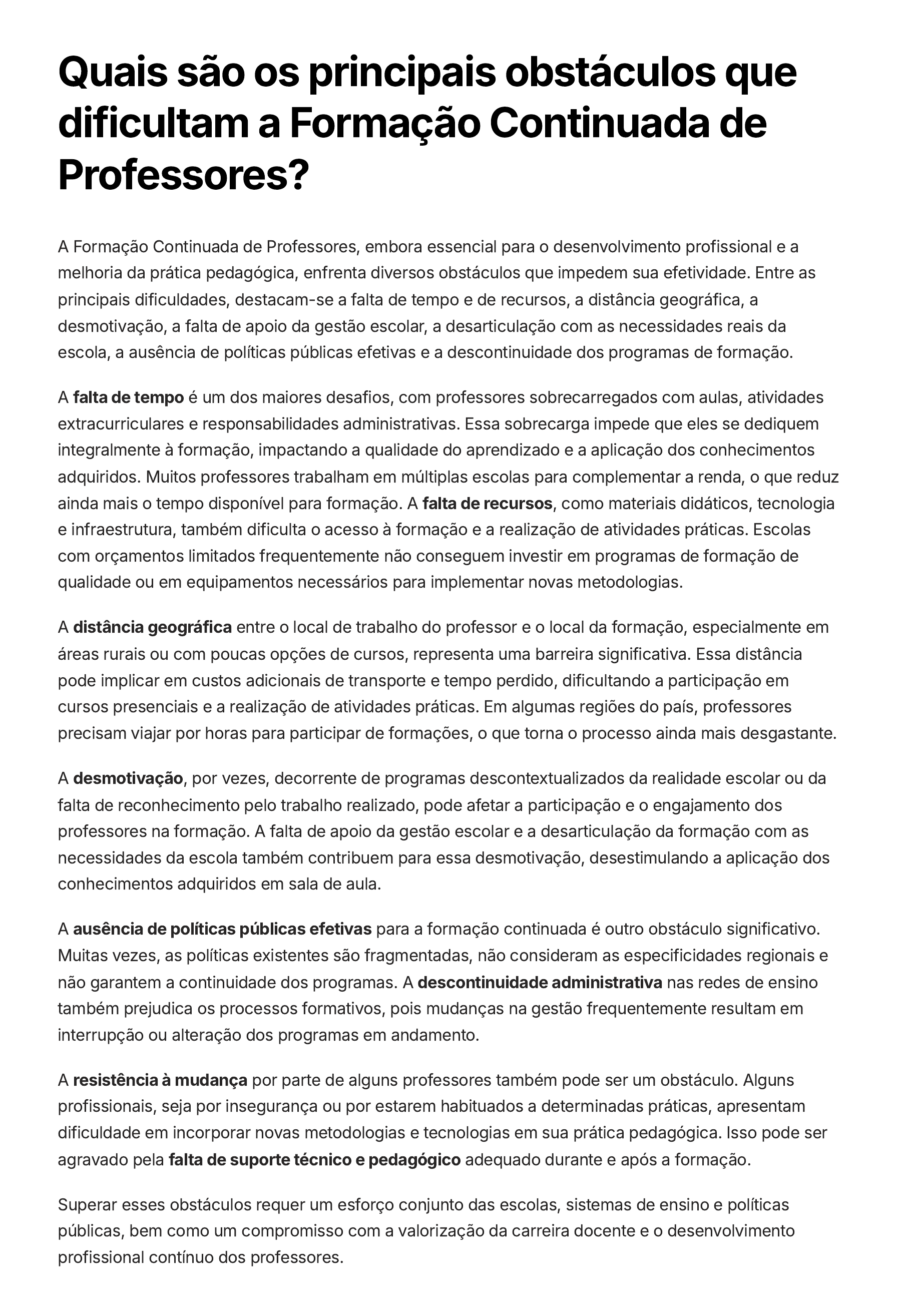 Quais são os principais obstáculos que dificultam a Formação Continuada de Professores? A Formação Continuada de Professores, embora essencial para o desenvolvimento profissional e a melhoria da prática pedagógica, enfrenta diversos obstáculos que impedem sua efetividade. Entre as principais dificuldades, destacam-se a falta de tempo e de recursos, a distância geográfica, a desmotivação, a falta de apoio da gestão escolar, a desarticulação com as necessidades reais da escola, a ausência de políticas públicas efetivas e a descontinuidade dos programas de formação. A falta de tempo é um dos maiores desafios, com professores sobrecarregados com aulas, atividades extracurriculares e responsabilidades administrativas. Essa sobrecarga impede que eles se dediquem integralmente à formação, impactando a qualidade do aprendizado e a aplicação dos conhecimentos adquiridos. Muitos professores trabalham em múltiplas escolas para complementar a renda, o que reduz ainda mais o tempo disponível para formação. A falta de recursos, como materiais didáticos, tecnologia e infraestrutura, também dificulta o acesso à formação e a realização de atividades práticas. Escolas com orçamentos limitados frequentemente não conseguem investir em programas de formação de qualidade ou em equipamentos necessários para implementar novas metodologias. A distância geográfica entre o local de trabalho do professor e o local da formação, especialmente em áreas rurais ou com poucas opções de cursos, representa uma barreira significativa. Essa distância pode implicar em custos adicionais de transporte e tempo perdido, dificultando a participação em cursos presenciais e a realização de atividades práticas. Em algumas regiões do país, professores precisam viajar por horas para participar de formações, o que torna o processo ainda mais desgastante. A desmotivação, por vezes, decorrente de programas descontextualizados da realidade escolar ou da falta de reconhecimento pelo trabalho realizado, pode afetar a participação e o engajamento dos professores na formação. A falta de apoio da gestão escolar e a desarticulação da formação com as necessidades da escola também contribuem para essa desmotivação, desestimulando a aplicação dos conhecimentos adquiridos em sala de aula. A ausência de políticas públicas efetivas para a formação continuada é outro obstáculo significativo. Muitas vezes, as políticas existentes são fragmentadas, não consideram as especificidades regionais e não garantem a continuidade dos programas. A descontinuidade administrativa nas redes de ensino também prejudica os processos formativos, pois mudanças na gestão frequentemente resultam em interrupção ou alteração dos programas em andamento. A resistência à mudança por parte de alguns professores também pode ser um obstáculo. Alguns profissionais, seja por insegurança ou por estarem habituados a determinadas práticas, apresentam dificuldade em incorporar novas metodologias e tecnologias em sua prática pedagógica. Isso pode ser agravado pela falta de suporte técnico e pedagógico adequado durante e após a formação. Superar esses obstáculos requer um esforço conjunto das escolas, sistemas de ensino e políticas públicas, bem como um compromisso com a valorização da carreira docente e o desenvolvimento profissional contínuo dos professores.