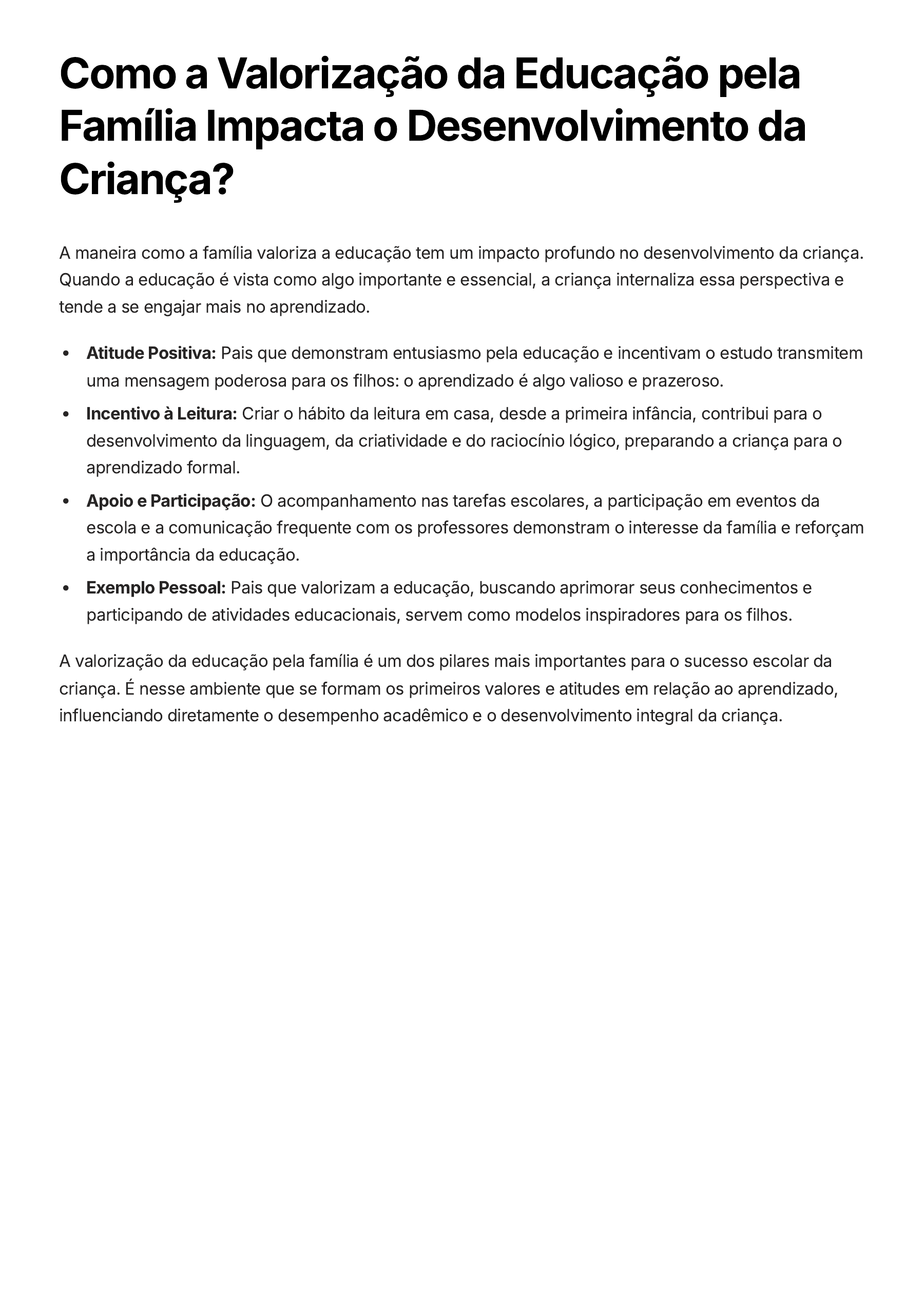 Como a Valorização da Educação pela Família Impacta o Desenvolvimento da Criança? A maneira como a família valoriza a educação tem um impacto profundo no desenvolvimento da criança. Quando a educação é vista como algo importante e essencial, a criança internaliza essa perspectiva e tende a se engajar mais no aprendizado. Atitude Positiva: Pais que demonstram entusiasmo pela educação e incentivam o estudo transmitem uma mensagem poderosa para os filhos: o aprendizado é algo valioso e prazeroso. Incentivo à Leitura: Criar o hábito da leitura em casa, desde a primeira infância, contribui para o desenvolvimento da linguagem, da criatividade e do raciocínio lógico, preparando a criança para o aprendizado formal. Apoio e Participação: O acompanhamento nas tarefas escolares, a participação em eventos da escola e a comunicação frequente com os professores demonstram o interesse da família e reforçam a importância da educação. Exemplo Pessoal: Pais que valorizam a educação, buscando aprimorar seus conhecimentos e participando de atividades educacionais, servem como modelos inspiradores para os filhos. A valorização da educação pela família é um dos pilares mais importantes para o sucesso escolar da criança. É nesse ambiente que se formam os primeiros valores e atitudes em relação ao aprendizado, influenciando diretamente o desempenho acadêmico e o desenvolvimento integral da criança. Como a Família Pode Auxiliar na Orientação Profissional dos Filhos? A orientação profissional dos filhos é uma etapa crucial no desenvolvimento da criança, e a família desempenha um papel fundamental nesse processo. Desde cedo, os pais e responsáveis podem contribuir para que os filhos explorem seus interesses, desenvolvam habilidades e identifiquem suas vocações. A influência da família na escolha da profissão é significativa, especialmente durante a adolescência, quando a criança está em busca de seu lugar no mundo. A família pode oferecer apoio e incentivo aos filhos, proporcionando oportunidades para que eles se envolvam em atividades extracurriculares, cursos, workshops e visitas a empresas. É fundamental que os pais demonstrem interesse genuíno pelos sonhos e aspirações dos filhos, incentivando-os a buscar informações e explorar diferentes áreas de atuação. O diálogo aberto e honesto sobre as expectativas e desafios da vida profissional é essencial para que a criança se sinta acolhida e orientada. Além de oferecer suporte emocional e prático, a família também pode auxiliar os filhos na identificação de seus talentos e habilidades. É importante observar as áreas em que a criança se destaca, como artes, esportes, ciências ou tecnologia, e incentivar o desenvolvimento dessas habilidades. O apoio da família no desenvolvimento de habilidades e na busca por oportunidades de aprendizado é crucial para que a criança se prepare para o mercado de trabalho e construa um futuro profissional sólido. É fundamental que a família esteja atenta às mudanças do mercado de trabalho e às novas profissões que surgem com a evolução da tecnologia. A comunicação entre pais e filhos sobre o futuro profissional, as tendências e as oportunidades é essencial para que a criança tenha uma visão abrangente do mundo do trabalho e escolha uma profissão que esteja em sintonia com suas paixões e habilidades, preparando-se para um futuro profissional promissor. Como a Escola Pode Contribuir para a Integração da Família na Comunidade? A escola tem um papel fundamental na integração da família na comunidade, promovendo um ambiente de colaboração e união em prol do desenvolvimento da criança. Eventos e atividades: A organização de eventos como palestras, oficinas e apresentações artísticas, com a participação ativa de pais, professores e alunos, fomenta o convívio e o compartilhamento de experiências, fortalecendo o vínculo entre a escola, a família e a comunidade. Projetos sociais: A escola pode promover projetos que envolvam a comunidade, como campanhas de arrecadação de alimentos, doação de sangue, ações de voluntariado, aproximando a família e a comunidade escolar em torno de causas sociais relevantes. Grupos de apoio e orientação: A escola pode oferecer grupos de apoio para pais e responsáveis, abordando temas como educação, desenvolvimento infantil, saúde mental e outros desafios que as famílias enfrentam, criando um espaço de diálogo e troca de experiências. Plataformas digitais: A utilização de plataformas digitais para comunicação entre escola, família e comunidade, como plataformas online, aplicativos e redes sociais, facilita o acesso à informação, promove a participação em eventos e atividades, e fortalece o relacionamento entre os membros da comunidade escolar. Ao criar um ambiente inclusivo e receptivo, a escola incentiva a participação da família na comunidade, fortalecendo laços, promovendo a troca de conhecimentos e experiências, e contribuindo para o bem- estar e desenvolvimento da criança.