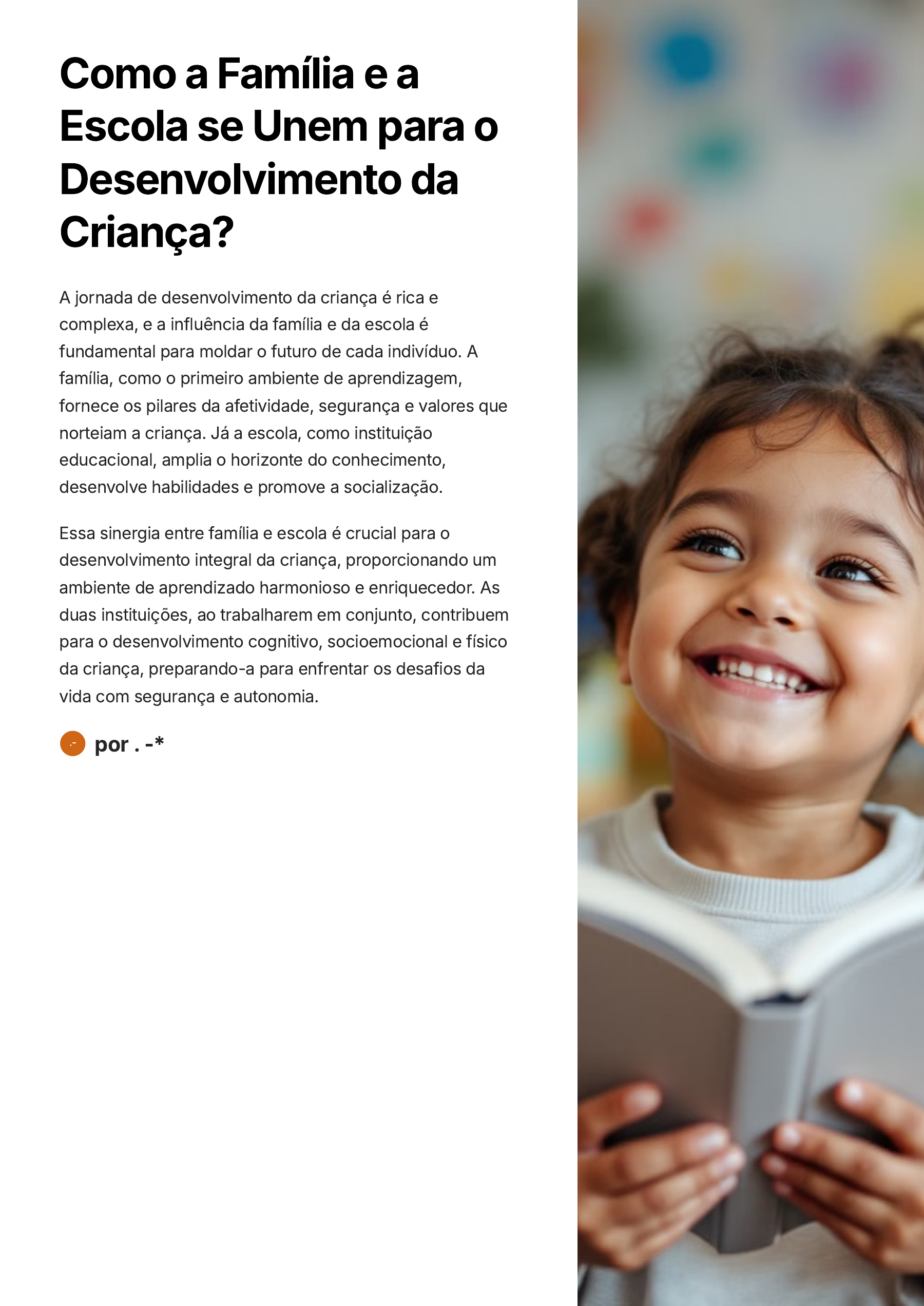 Como a Família e a Escola se Unem para o Desenvolvimento da Criança? A jornada de desenvolvimento da criança é rica e complexa, e a influência da família e da escola é fundamental para moldar o futuro de cada indivíduo. A família, como o primeiro ambiente de aprendizagem, fornece os pilares da afetividade, segurança e valores que norteiam a criança. Já a escola, como instituição educacional, amplia o horizonte do conhecimento, desenvolve habilidades e promove a socialização. Essa sinergia entre família e escola é crucial para o desenvolvimento integral da criança, proporcionando um ambiente de aprendizado harmonioso e enriquecedor. As duas instituições, ao trabalharem em conjunto, contribuem para o desenvolvimento cognitivo, socioemocional e físico da criança, preparando-a para enfrentar os desafios da vida com segurança e autonomia. por . -*.- Como o envolvimento da família impacta a educação dos filhos? O envolvimento familiar na educação dos filhos é fundamental para o desenvolvimento integral da criança. Pais e responsáveis desempenham um papel crucial no sucesso escolar, influenciando o desempenho acadêmico, o desenvolvimento socioemocional e a formação de valores. A participação ativa da família na vida escolar cria um ambiente de apoio e colaboração que beneficia tanto a criança quanto a escola. A presença dos pais nas atividades escolares, como reuniões, eventos e acompanhamento das tarefas de casa, demonstra o interesse e o compromisso com a educação do filho. Essa demonstração de apoio e incentivo é crucial para a motivação e o engajamento da criança, além de fortalecer os laços familiares. A comunicação aberta e frequente entre pais e professores é essencial para o acompanhamento do progresso escolar da criança. O diálogo permite a troca de informações sobre o desenvolvimento da criança, a identificação de dificuldades e a definição de estratégias de apoio adequadas. É importante que a escola e a família trabalhem em conjunto, buscando o melhor para a criança. A família também contribui para o sucesso escolar ao criar um ambiente doméstico que valoriza a educação, incentiva a leitura e a aprendizagem, e oferece oportunidades de desenvolvimento de habilidades. O estilo de criação, a estrutura familiar e a situação socioeconômica também influenciam o desempenho escolar da criança. O apoio emocional da família, a resolução de conflitos de forma construtiva e a orientação profissional são outros aspectos importantes que contribuem para o desenvolvimento integral da criança. Como a escola contribui para o desenvolvimento social e emocional da criança? A escola desempenha um papel fundamental no desenvolvimento social e emocional da criança, complementando o trabalho da família e oferecendo um ambiente rico em oportunidades de aprendizado e interação. A escola, como um espaço de socialização, auxilia na construção da identidade, da autoestima e da autonomia, preparando a criança para lidar com as diversas situações da vida em sociedade. Alguns dos principais aspectos do desenvolvimento social e emocional que a escola contribui para a criança são: Interação social: A escola oferece oportunidades de interação com outras crianças de diferentes backgrounds, ensinando a importância da colaboração, do respeito e da comunicação assertiva, contribuindo para o desenvolvimento de habilidades sociais essenciais para a vida em comunidade. Autoconhecimento e autoestima: Através de atividades que estimulam a criatividade, a expressão individual e a auto-reflexão, a escola ajuda a criança a se conhecer melhor, a entender suas emoções e a desenvolver a autoestima, preparando-a para enfrentar desafios e construir relações saudáveis. Empatia e compaixão: A escola promove o desenvolvimento da empatia e da compaixão através de atividades que incentivam a criança a se colocar no lugar do outro, a compreender as emoções e necessidades dos colegas e a agir de forma solidária e responsável. Habilidades socioemocionais: A escola oferece ferramentas para a criança lidar com situações desafiadoras, como frustrações, conflitos e lidar com a pressão do grupo, desenvolvendo habilidades de autocontrole, resiliência, resolução de problemas e comunicação eficaz. Em resumo, a escola desempenha um papel crucial na formação da criança como um indivíduo social e emocionalmente preparado para lidar com os desafios da vida em sociedade.